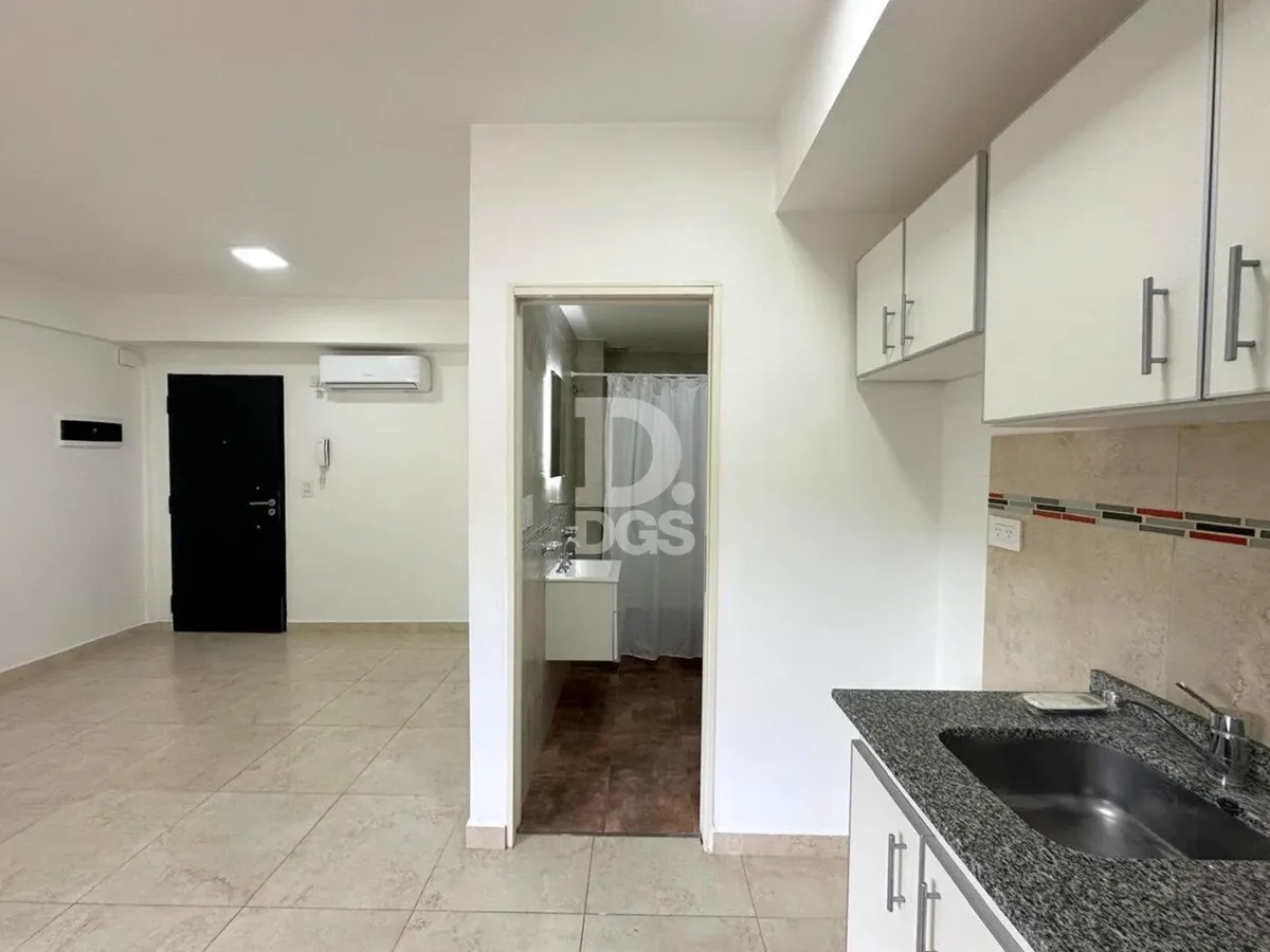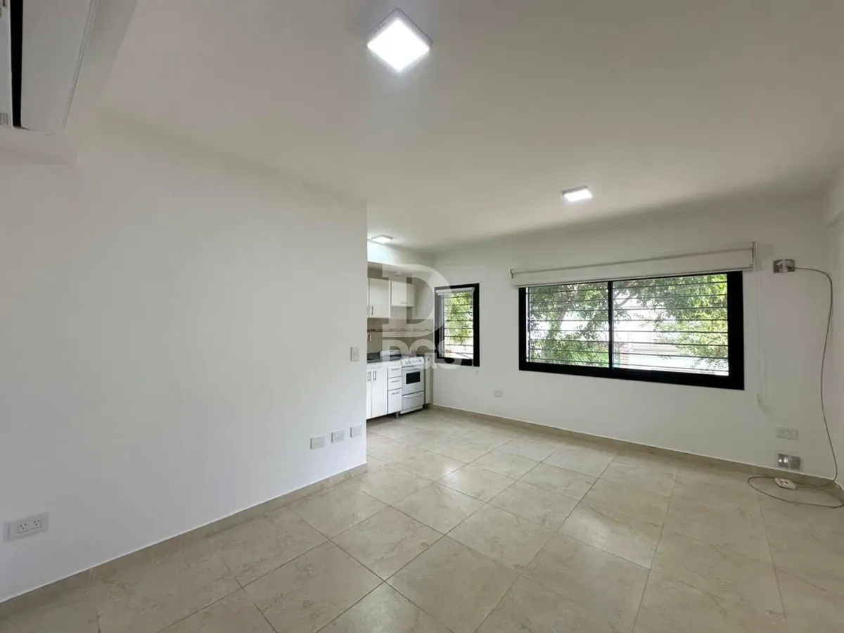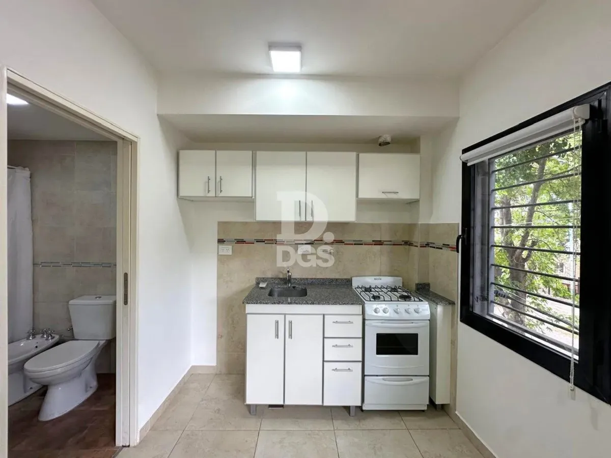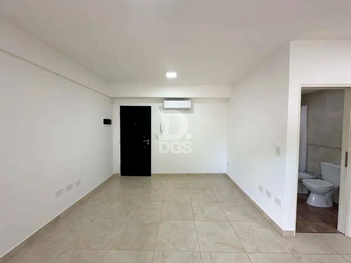 Monoambiente al frente en Banfield Este con cochera descubierta para 1 vehículo. Cuenta con aire acondicionado frío/calor y cortinas sunscreen y blackout. Tiene baño completo con bañera y cocina con muebles de alto y bajo mesada, en un edificio de pocas unidades. Las expensas incluyen luz, agua y municipal, y hay medidor individual de gas. El contrato es por 2 años con actualización cuatrimestral por IPC; ARBA a cargo del propietario.