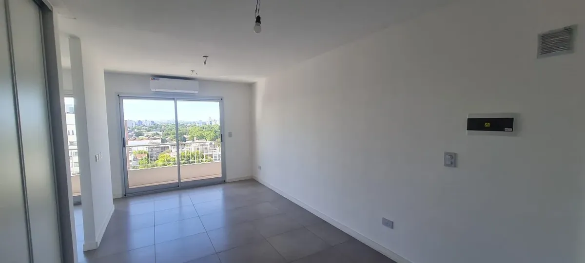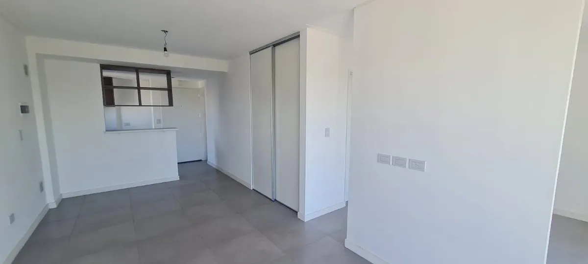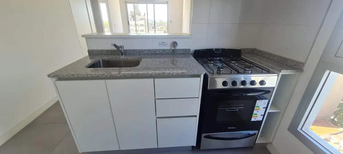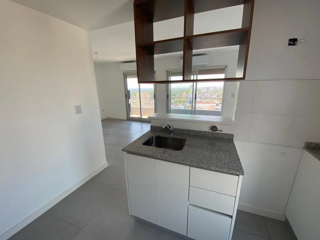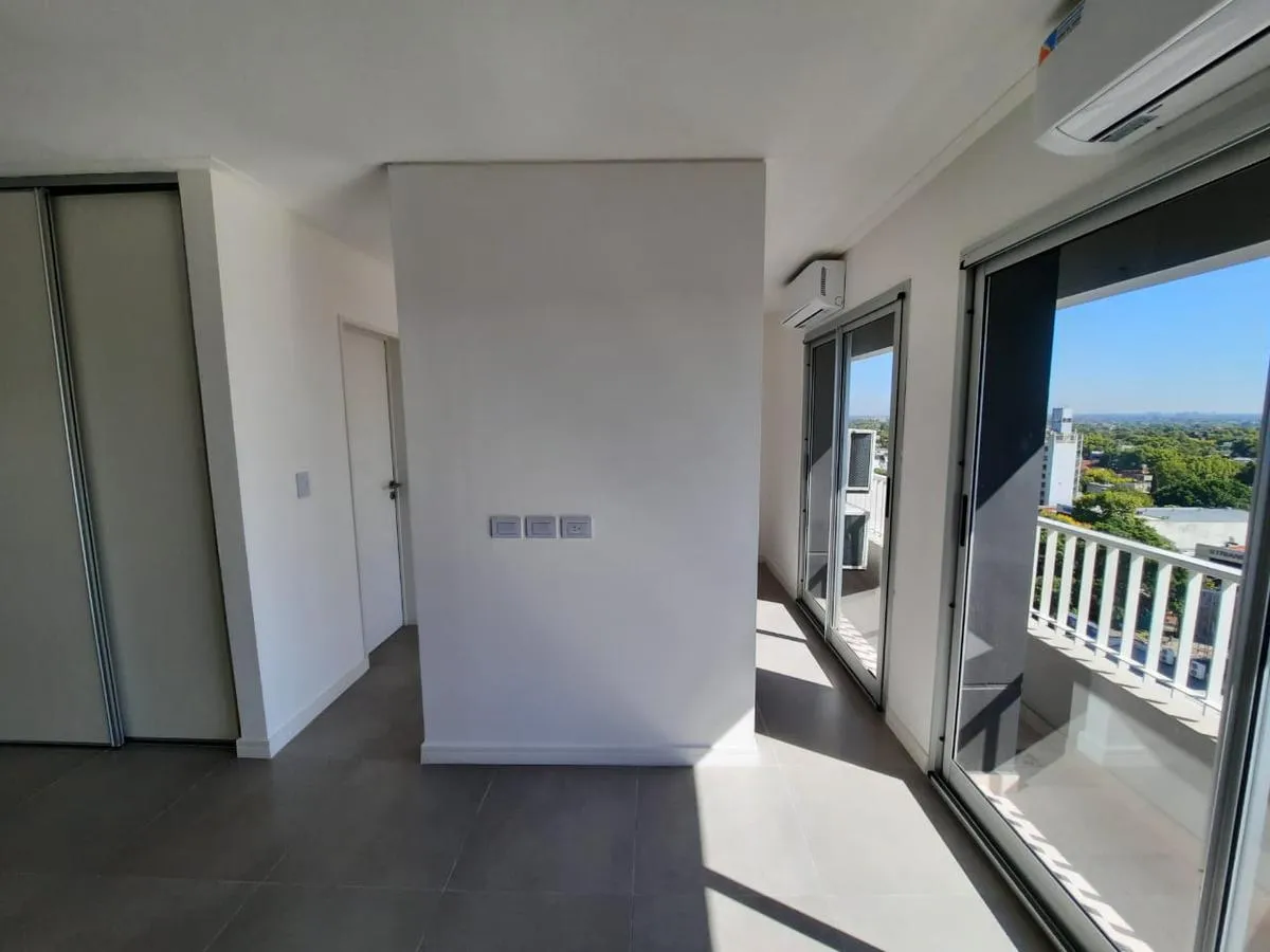 Departamento monoambiente divisible nuevo a estrenar de 44 m² con balcón y cochera, orientación norte. El estar-comedor tiene piso de porcelanato y la cocina cuenta con amoblamiento bajo y sobre mesada, con toma y descarga para lavarropas. Baño completo con vanitory y bañera, y equipo de aire acondicionado split frío-calor. El contrato es por 24 meses con ajustes trimestrales por IPC; el alquiler se abona más expensas comunes y ABL. No se aceptan mascotas. El edificio cuenta con SUM con cocina a