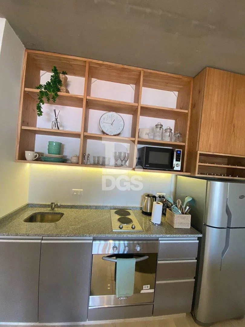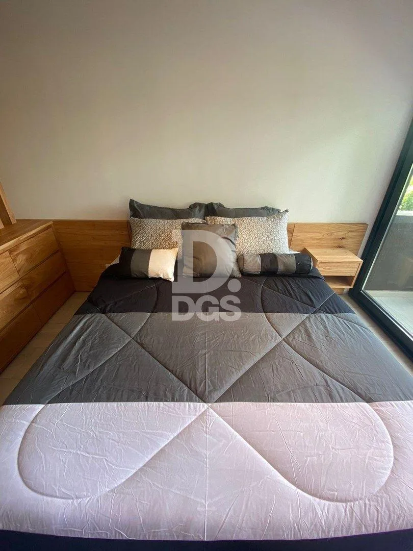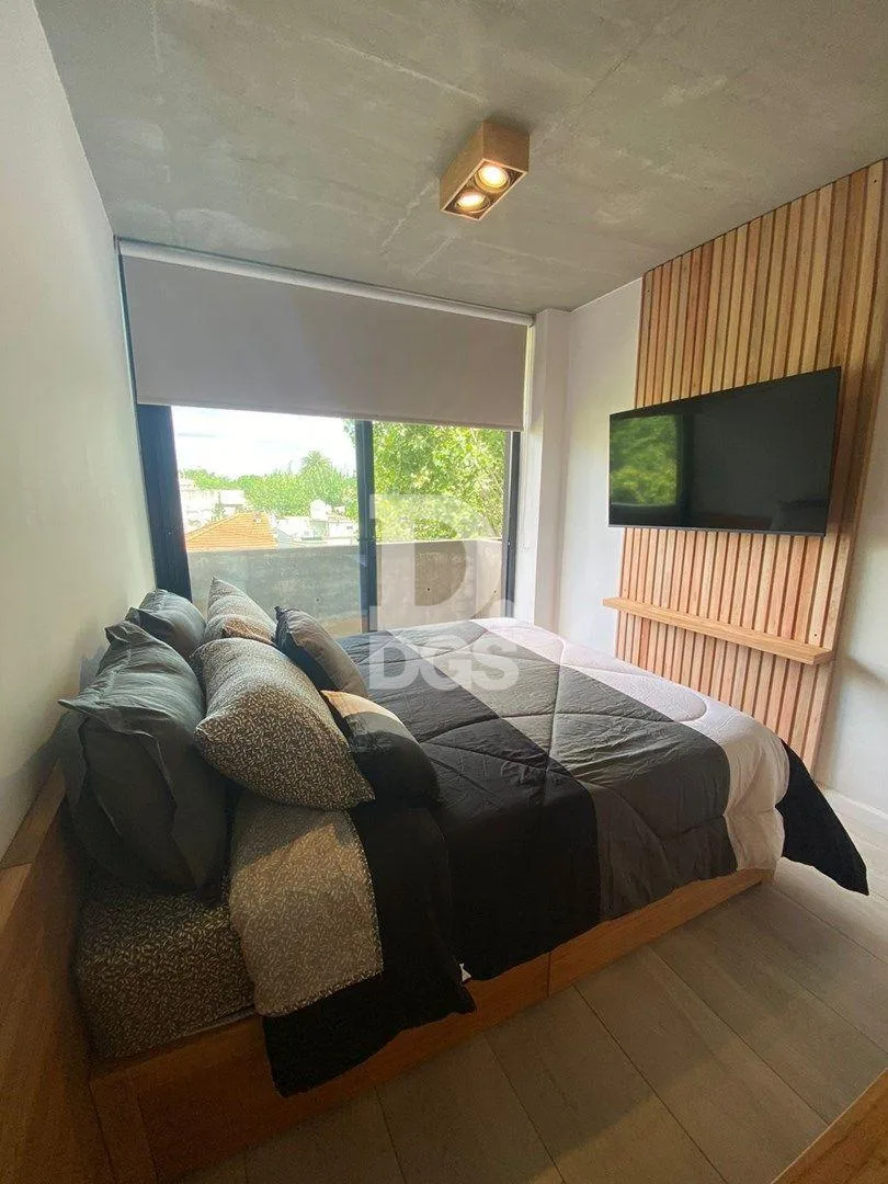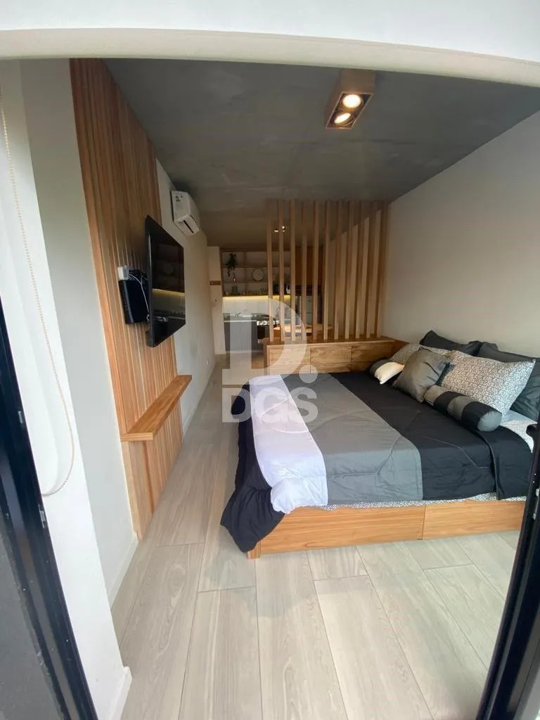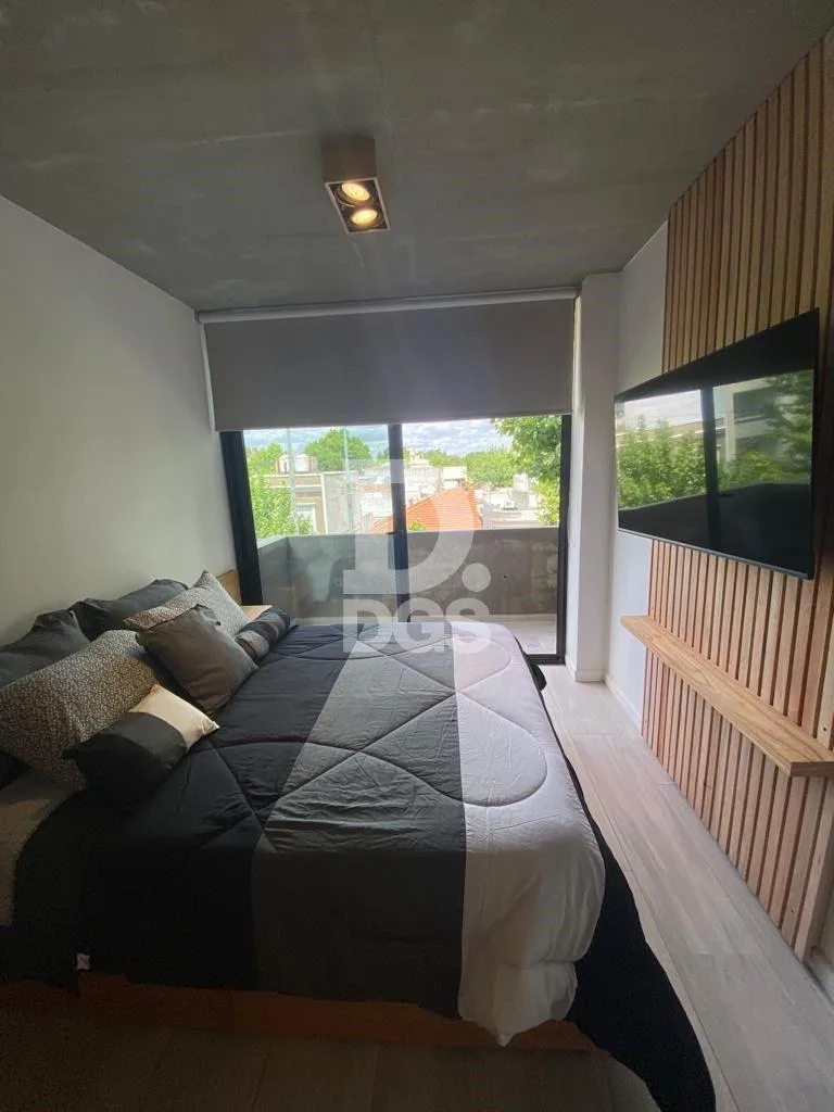 Departamento monoambiente amoblado en Lomas de Zamora. Se trata de un ambiente de 7,40 x 2,70 m, con mueble de cama con divisores, cajoneras y mesita de luz; TV smart de 50" y aire acondicionado frío/calor. Cuenta con ventilación al frente con ventanal de pared a pared con DVH y salida a balcón de 0,95 x 2,70 m; cocina equipada con heladera Gafa y microondas Atma, baño completo con ducha de 2,05 x 1,50 m con mampara de vidrio laminado. Incluye Wi-fi, SUM con parrilla y fogonero con asientos de h