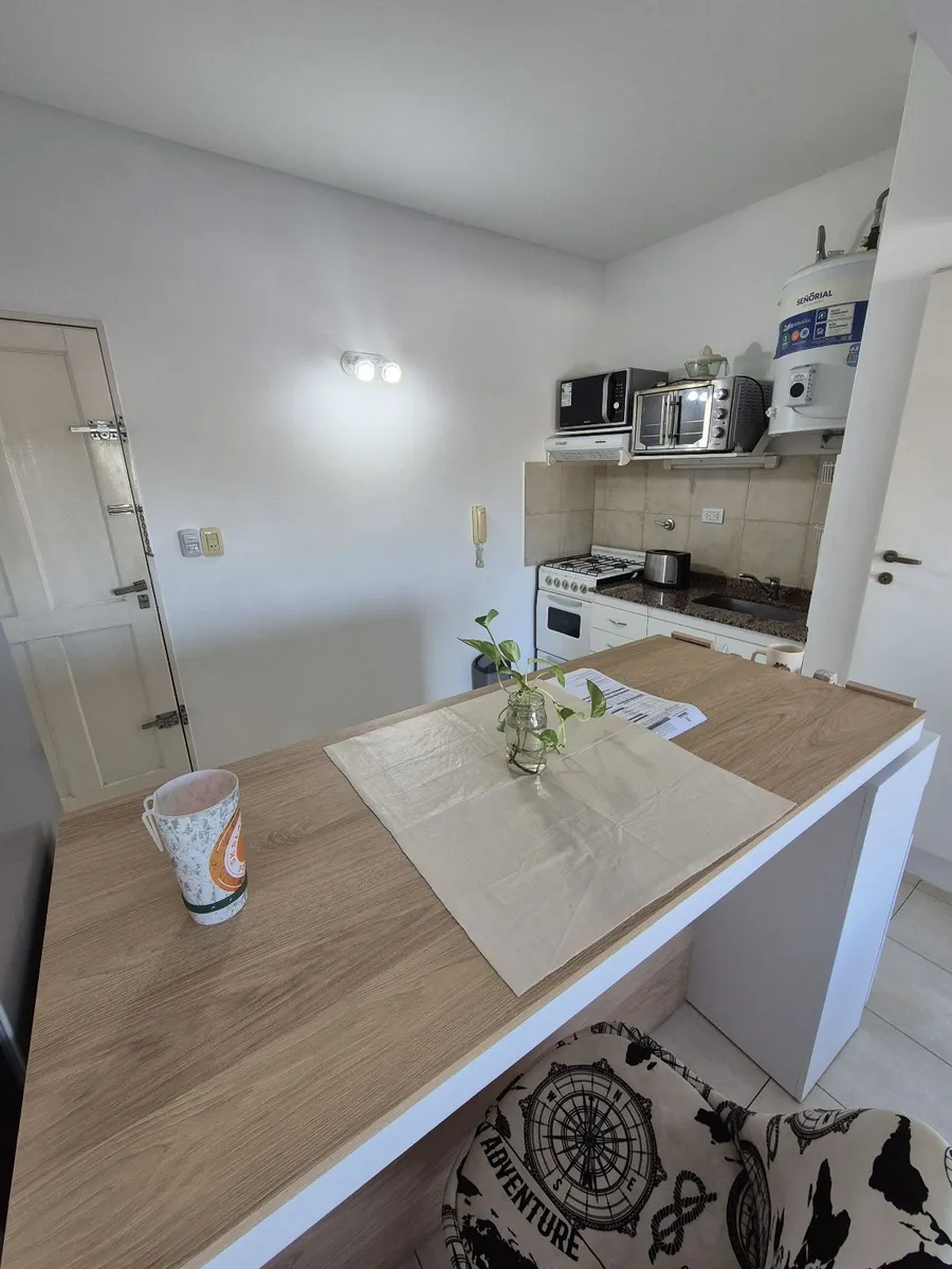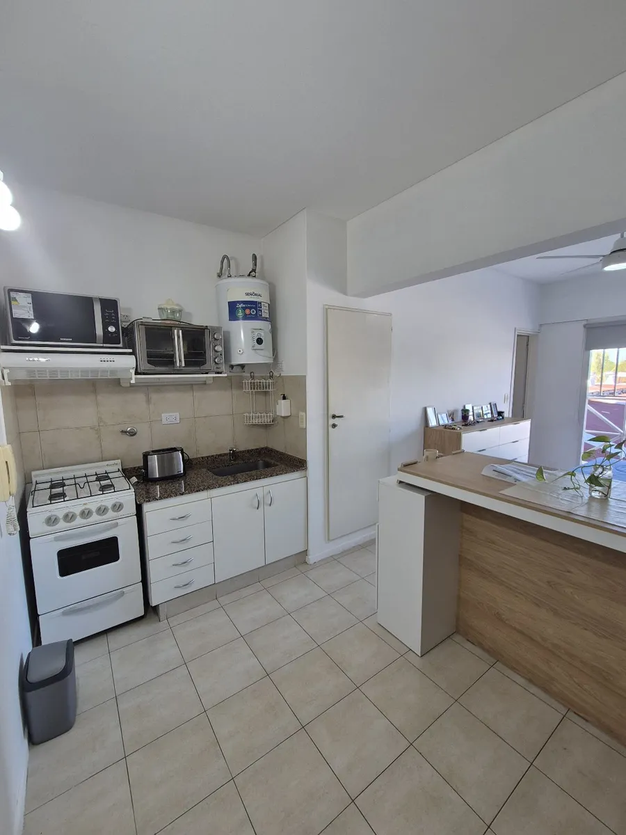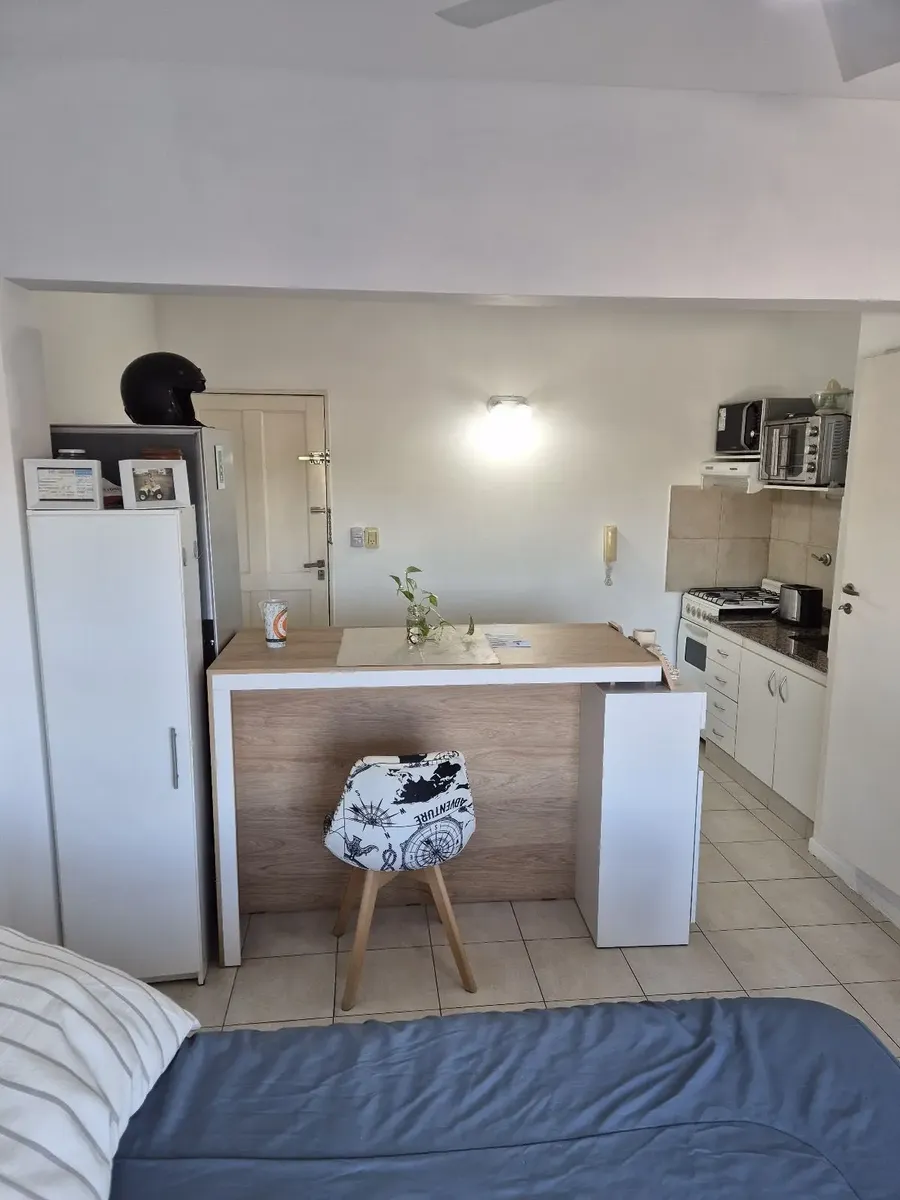 Departamento monoambiente en Lomas de Zamora Este. Cuenta con 1 ambiente con cocina integrada, todo con piso cerámico. La cocina tiene muebles bajo mesada, artefacto de cocina y termotanque eléctrico; incluye un mueble divisor tipo desayunador. El espacio de dormir tiene gran ventanal, placard y el baño completo con bañera y ventilación natural. Dispone de espacio guardacoches cubierto y terraza común. Contrato por 2 años con aumento trimestral por IPC. El valor de expensas, servicios y Tasa de