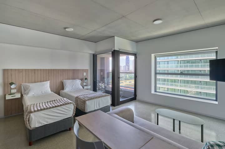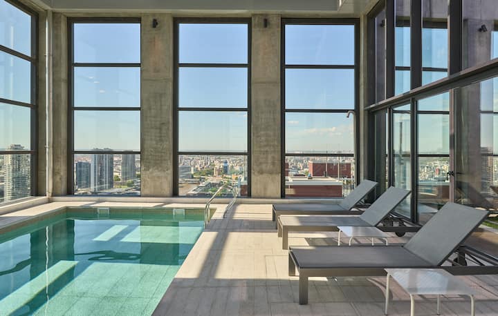 Monoambiente en Huergo 475, en un edificio de 38 pisos. Incluye cocina integrada, 1 baño completo y balcón privado con vistas abiertas. El edificio ofrece pileta climatizada, gimnasio, espacio de coworking, áreas con parrilla y terrazas en la azotea con vistas de 360°. Se encuentra en Monserrat, con acceso a zonas de Puerto Madero y San Telmo.