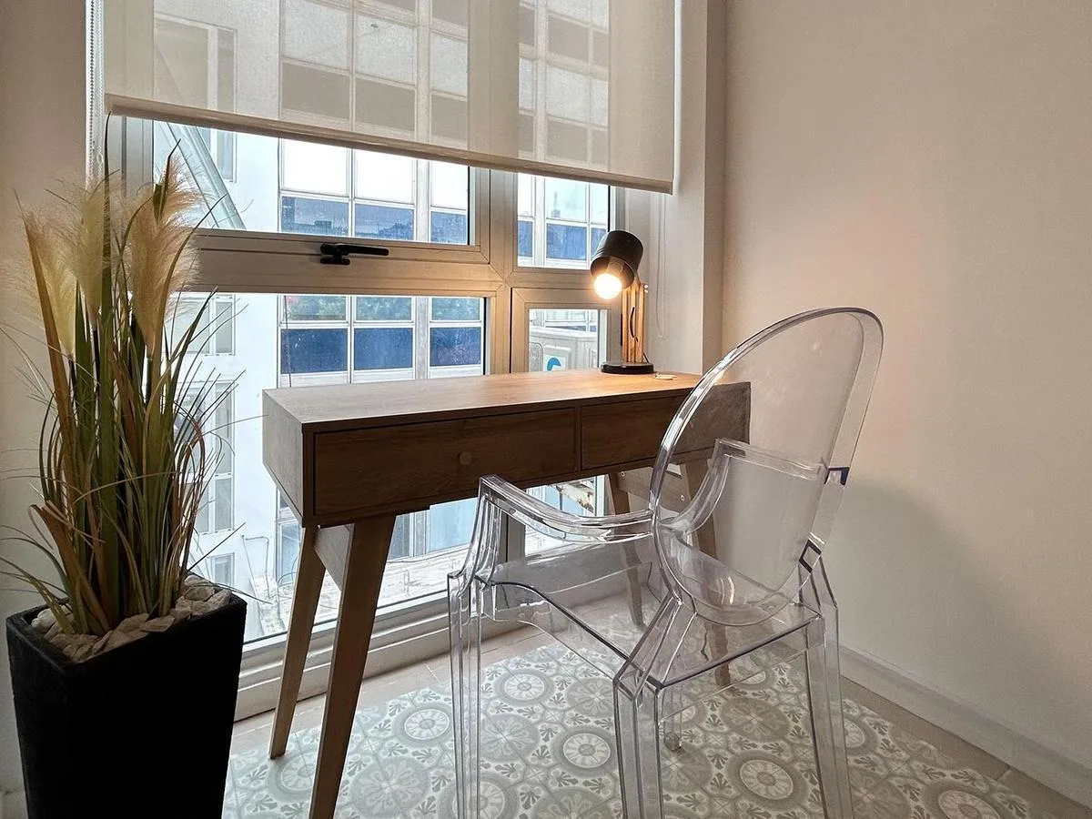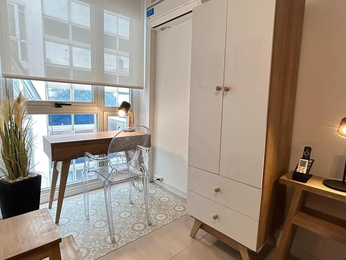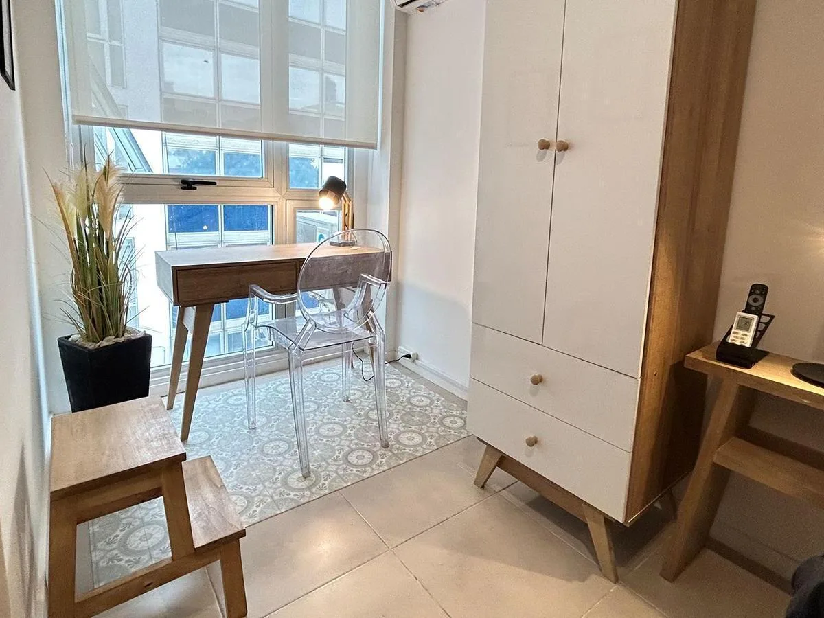 Monoambiente de 1 ambiente en Monserrat, 6to piso. Cuenta con área de descanso con cama queen, living integrado, cocina completa y baño completo. Incluye un espacio con escritorio para home office. El edificio tiene laundry, terraza con pileta y espacio de coworking en la recepción. Se ubica en Balcarce 379.