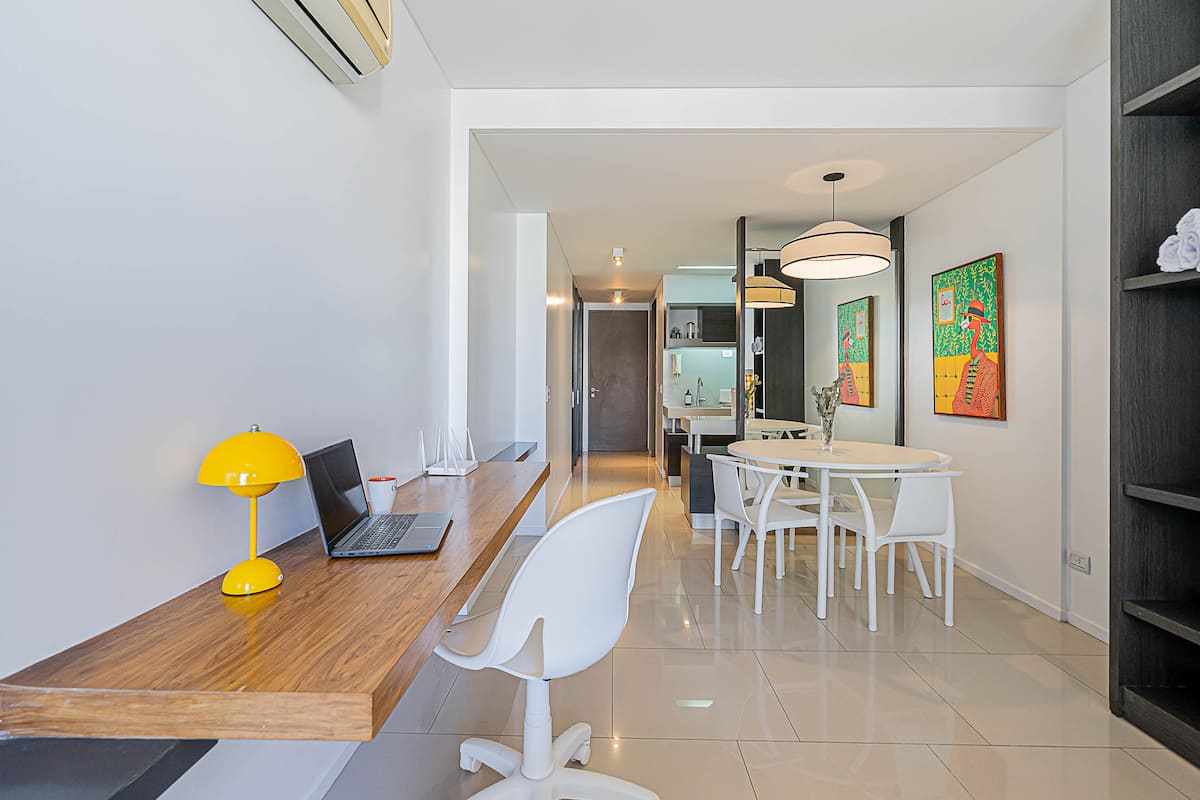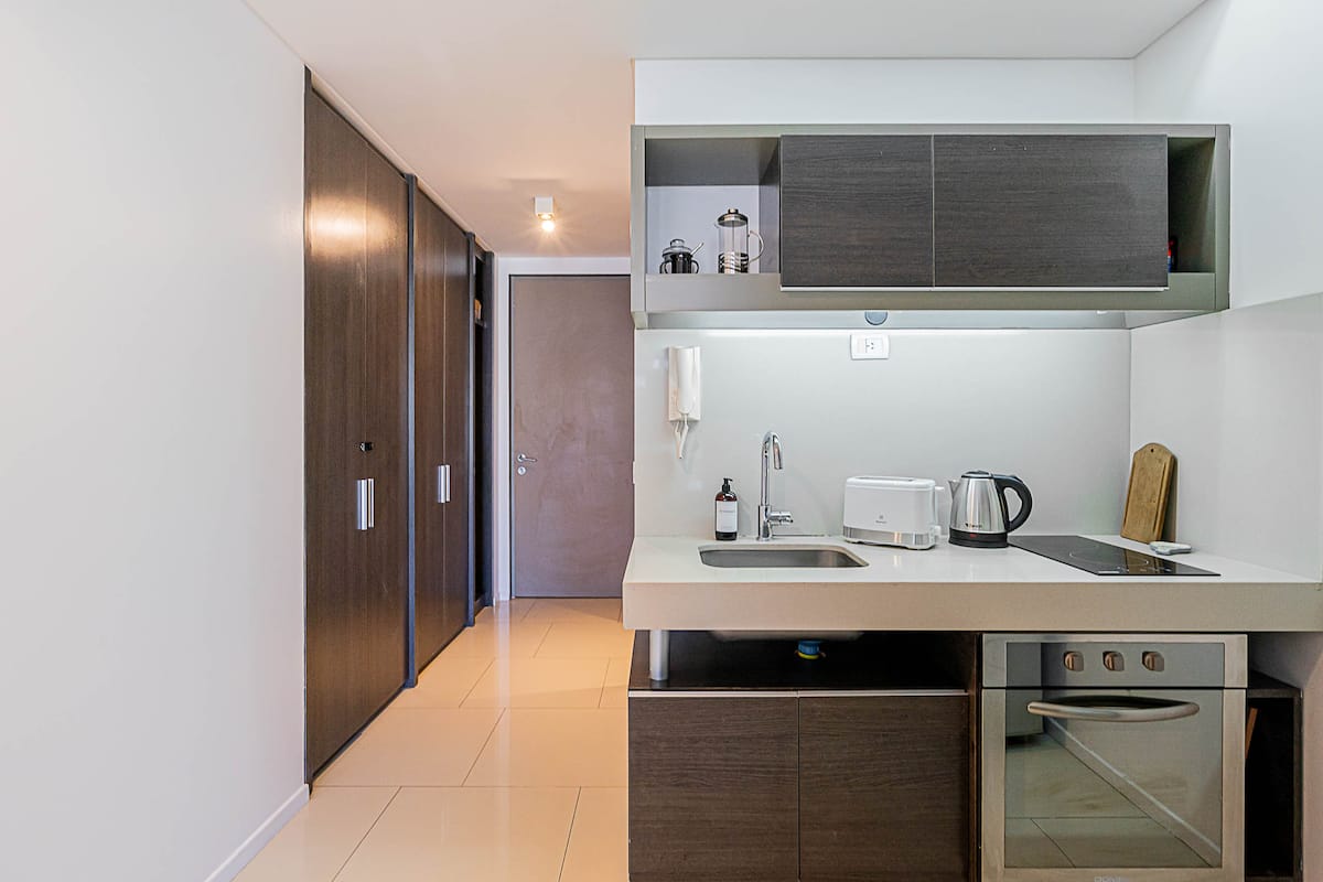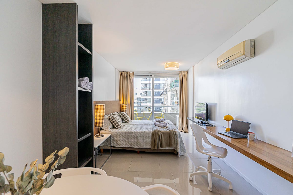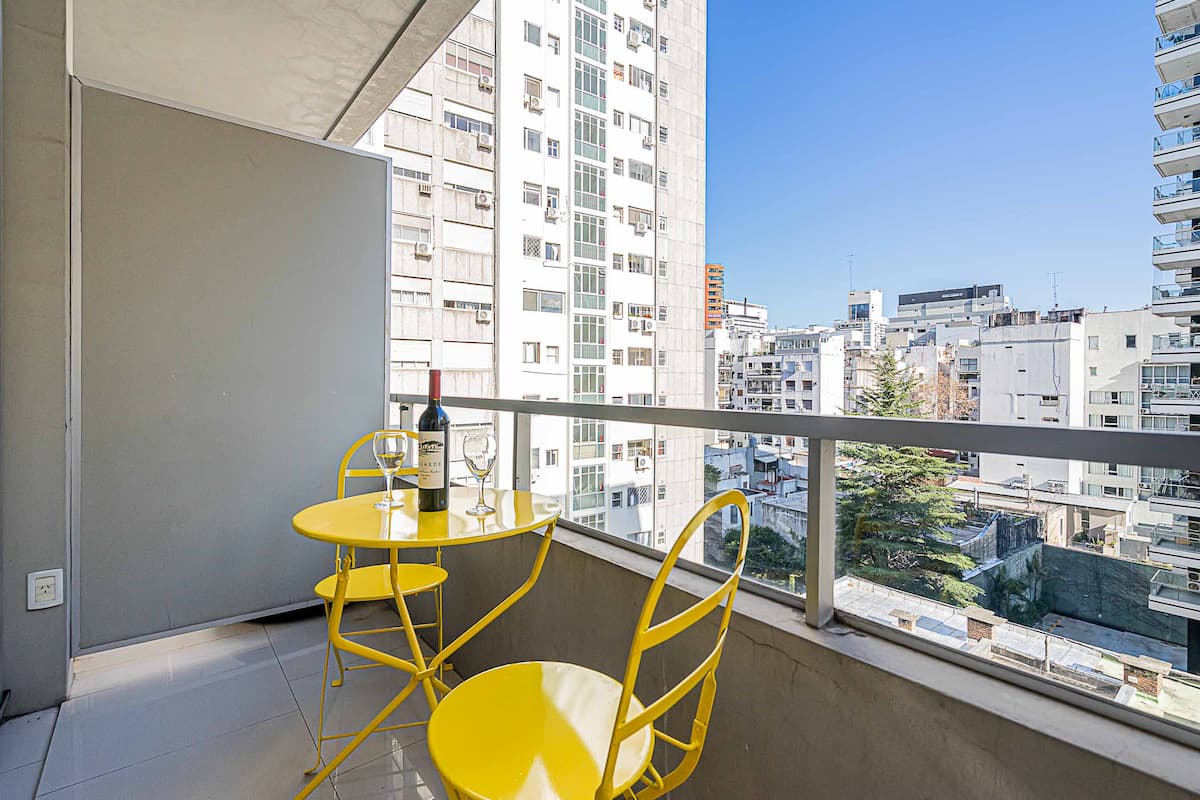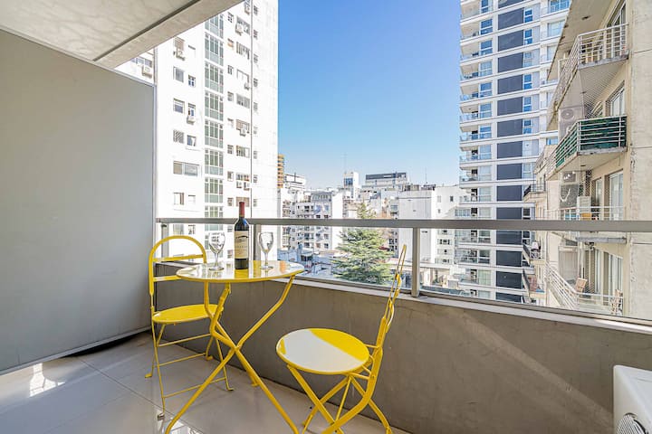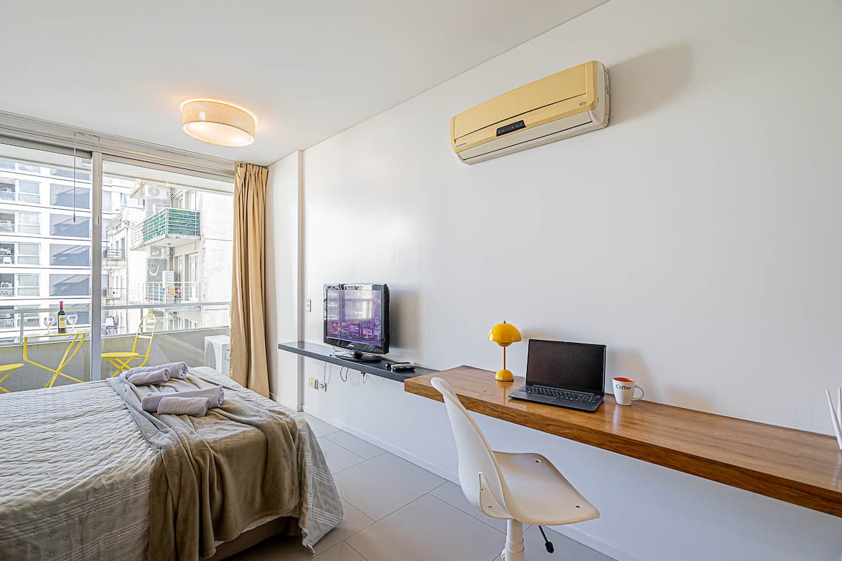 Monoambiente en Palermo Soho, en un edificio con seguridad 24 horas. El departamento tiene balcón y vista abierta. Cocina semi-integrada, aire acondicionado split (frío/calor), Wi-Fi de 300 MB y TV con control Roku. Incluye baño completo con bañera y secador de pelo, cortinas black-out, escritorio, mesa con 4 sillas y placard. La cocina cuenta con heladera con freezer, horno, microondas, pava eléctrica, tostadora, cafetera de prensa francesa y 2 hornallas cerámicas. El servicio de limpieza no es