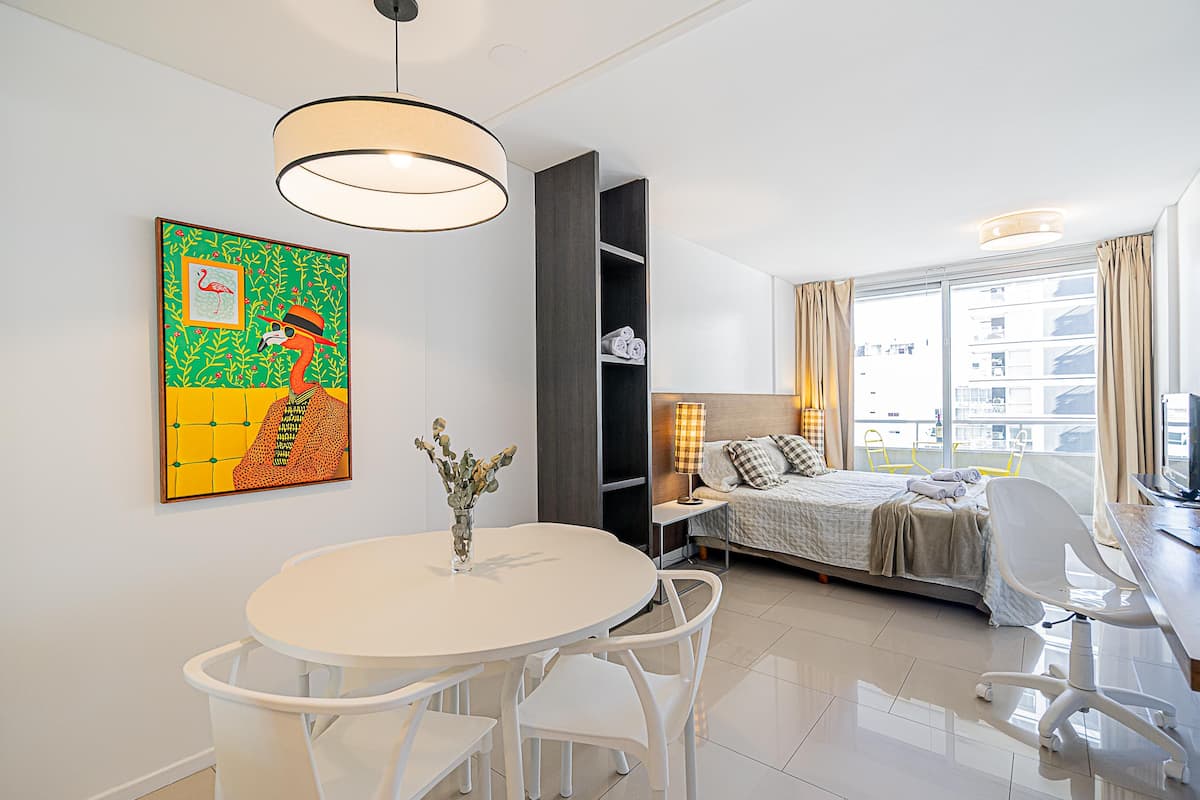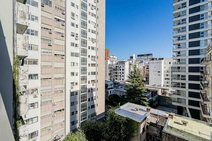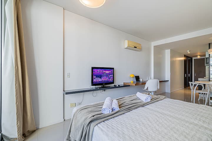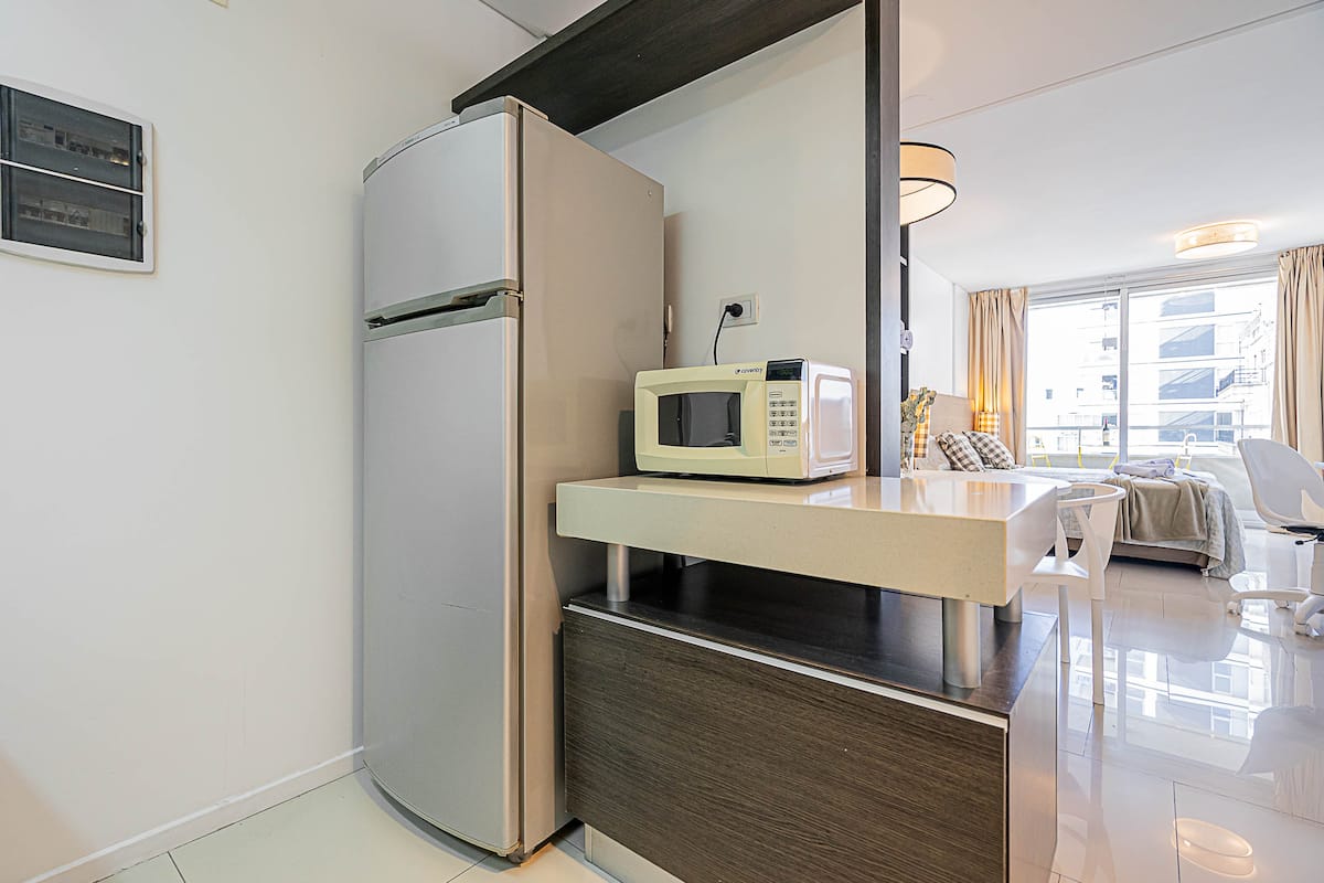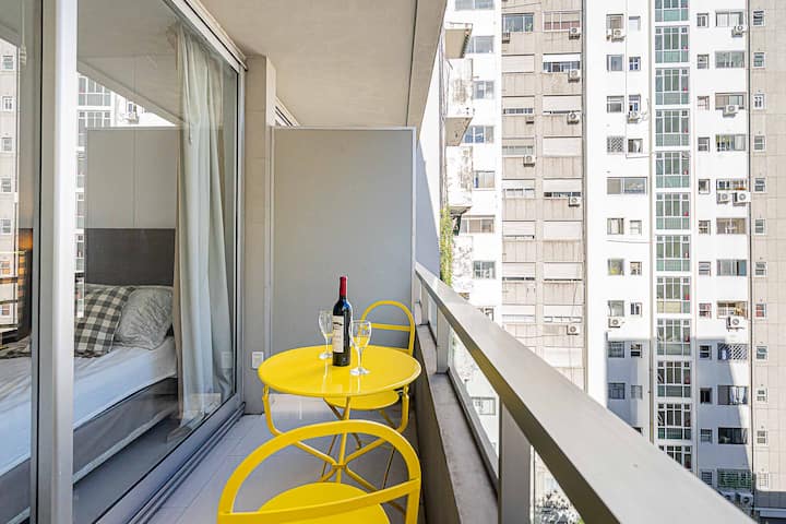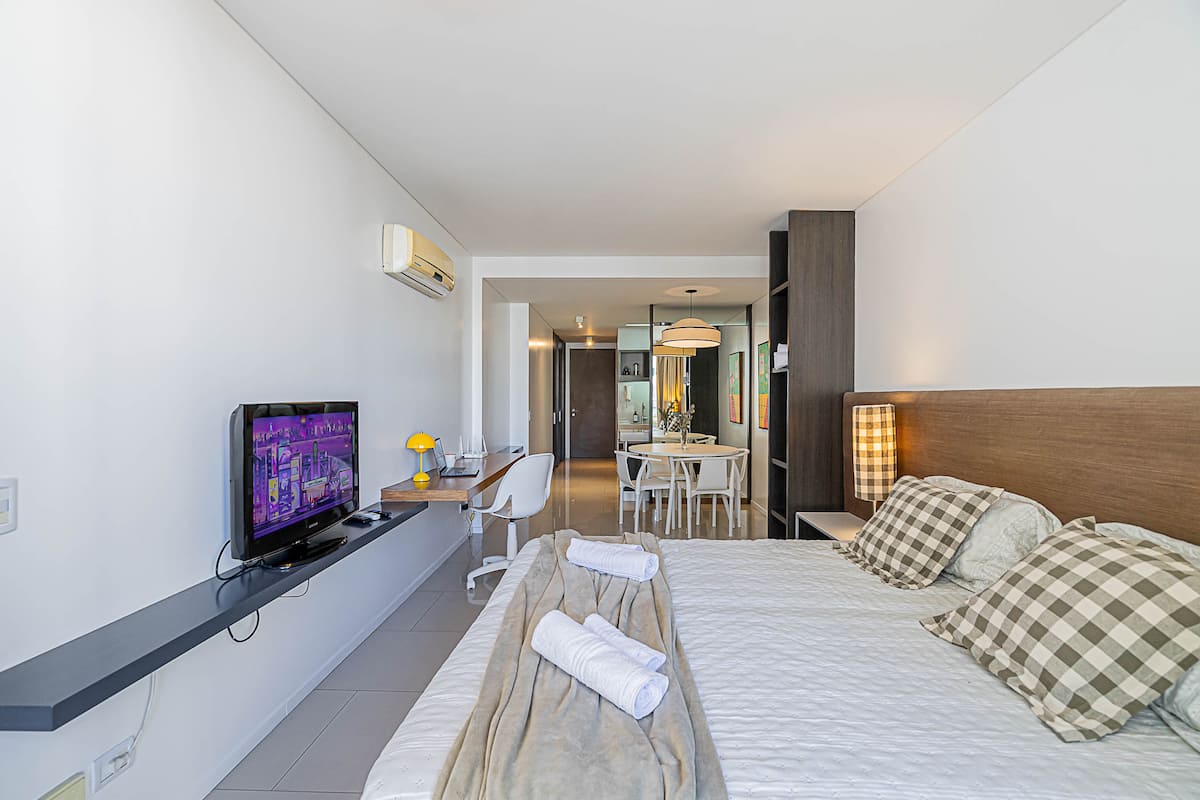 Monoambiente en Palermo Soho, en un edificio con seguridad 24 horas. El departamento tiene balcón y vista abierta. Cocina semi-integrada, aire acondicionado split (frío/calor), Wi-Fi de 300 MB y TV con control Roku. Incluye baño completo con bañera y secador de pelo, cortinas black-out, escritorio, mesa con 4 sillas y placard. La cocina cuenta con heladera con freezer, horno, microondas, pava eléctrica, tostadora, cafetera de prensa francesa y 2 hornallas cerámicas. El servicio de limpieza no es