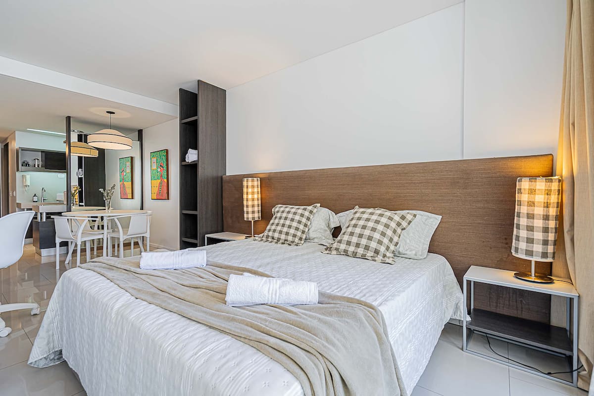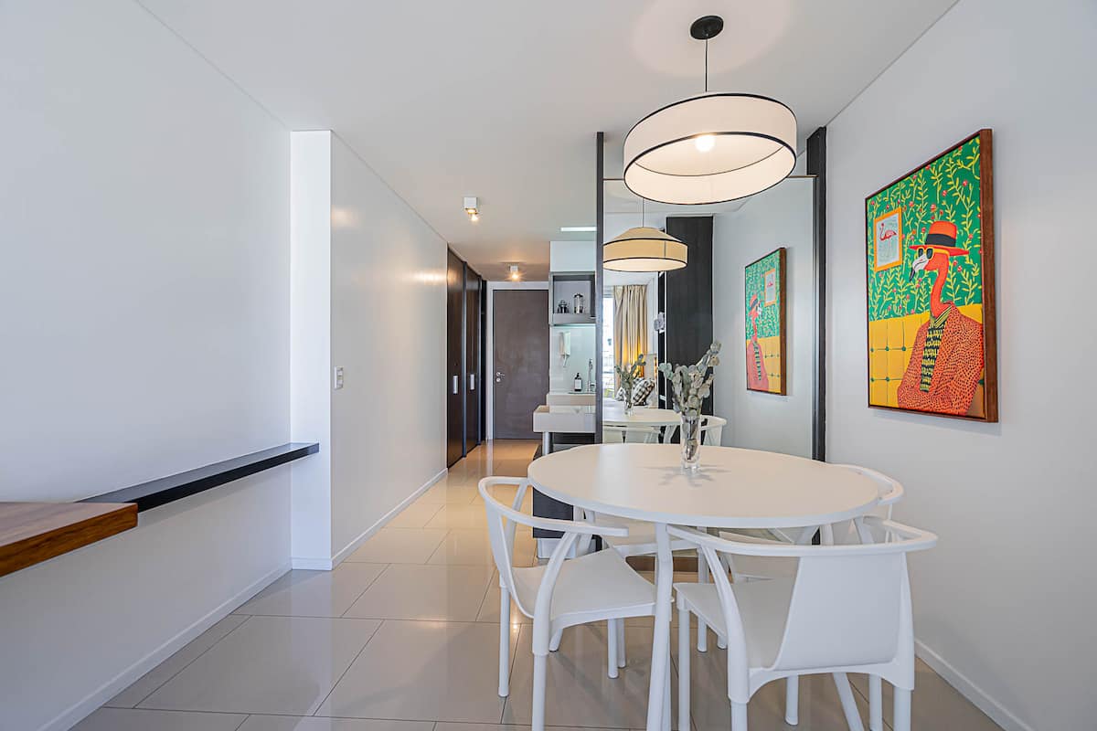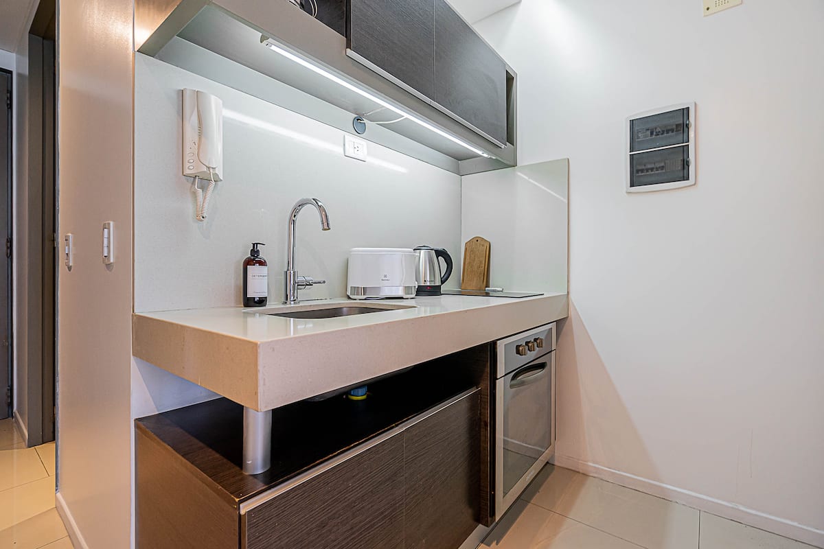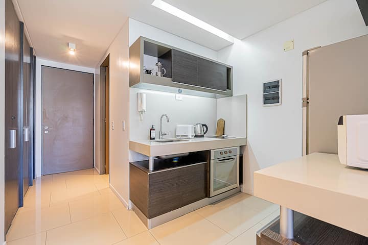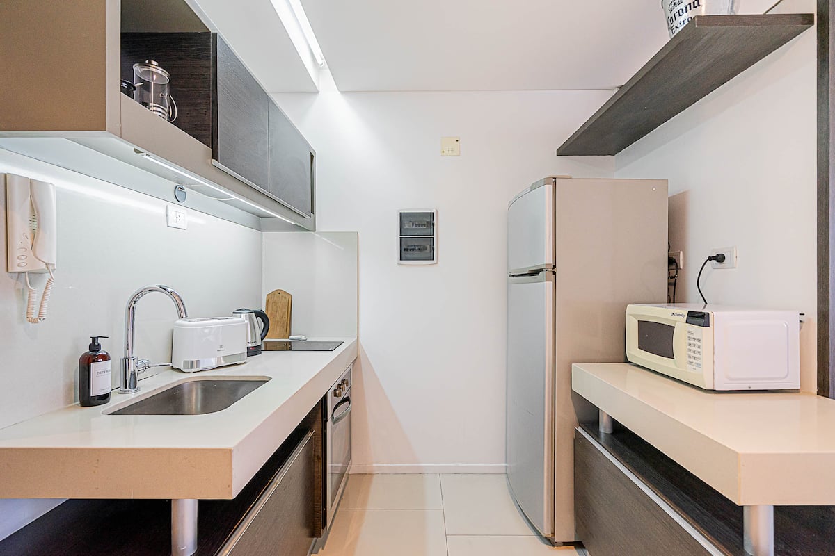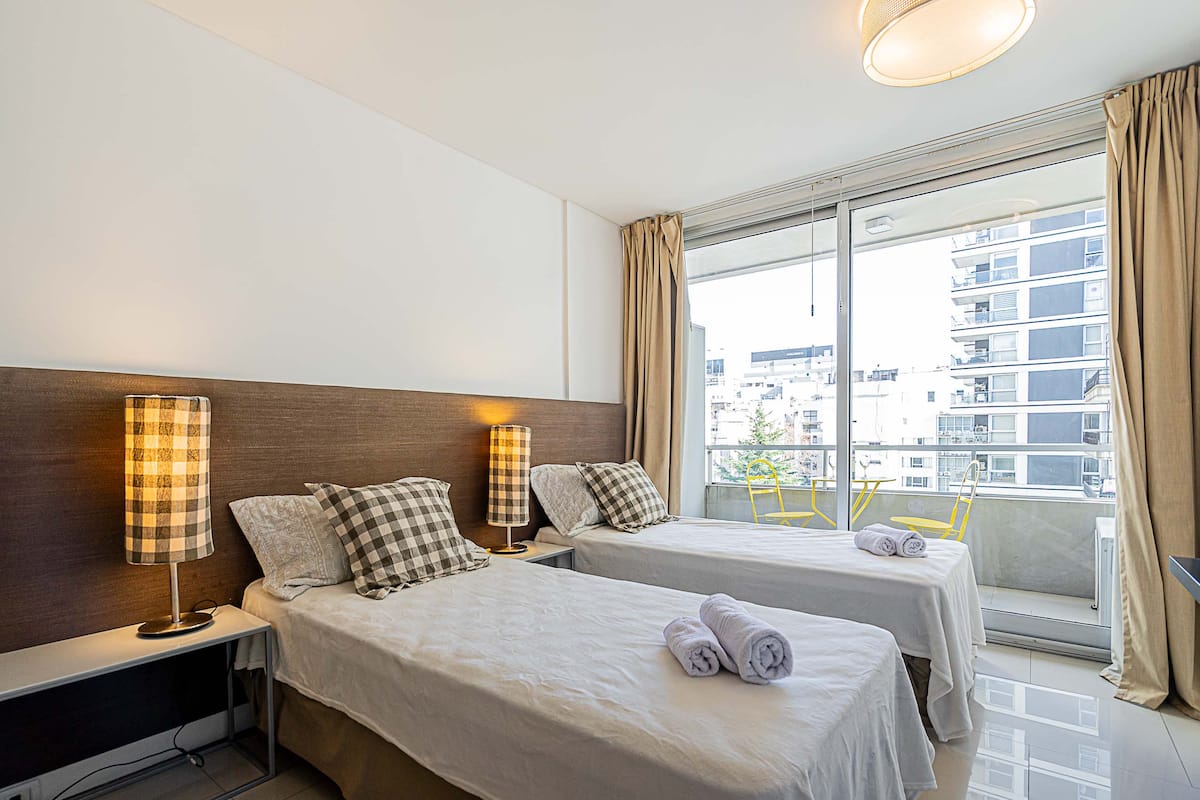 Monoambiente en Palermo Soho, en un edificio con seguridad 24 horas. El departamento tiene balcón y vista abierta. Cocina semi-integrada, aire acondicionado split (frío/calor), Wi-Fi de 300 MB y TV con control Roku. Incluye baño completo con bañera y secador de pelo, cortinas black-out, escritorio, mesa con 4 sillas y placard. La cocina cuenta con heladera con freezer, horno, microondas, pava eléctrica, tostadora, cafetera de prensa francesa y 2 hornallas cerámicas. El servicio de limpieza no es