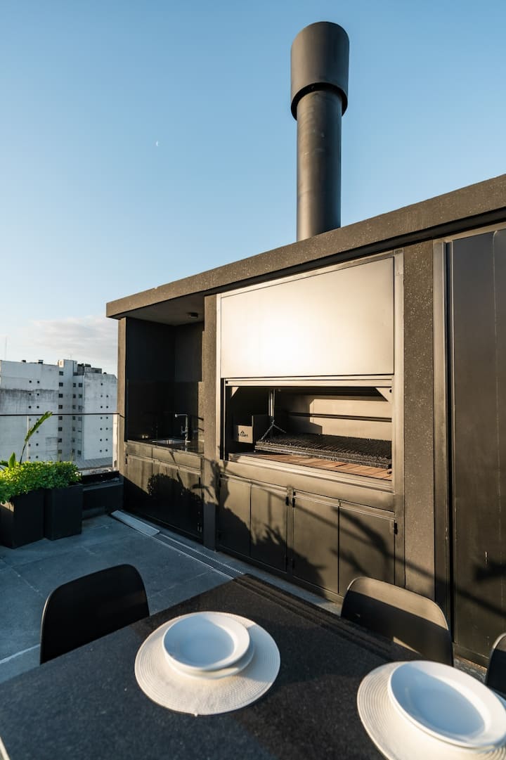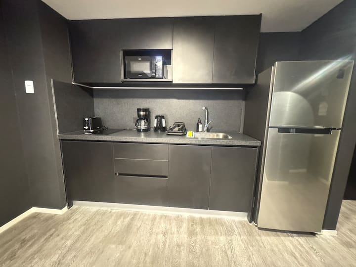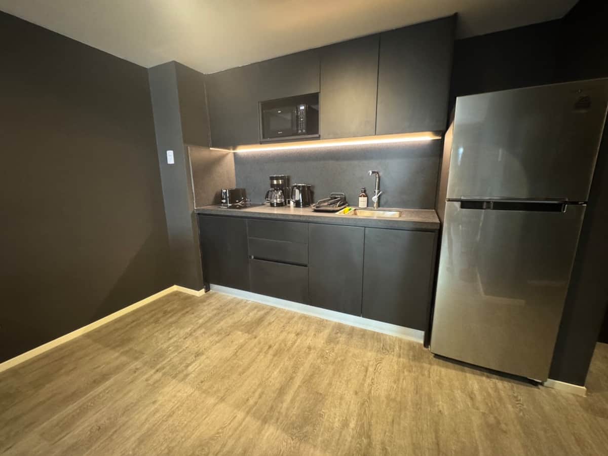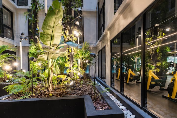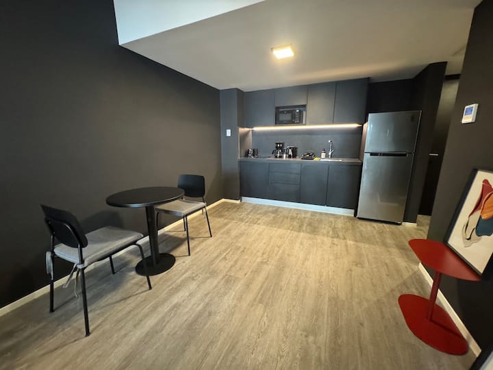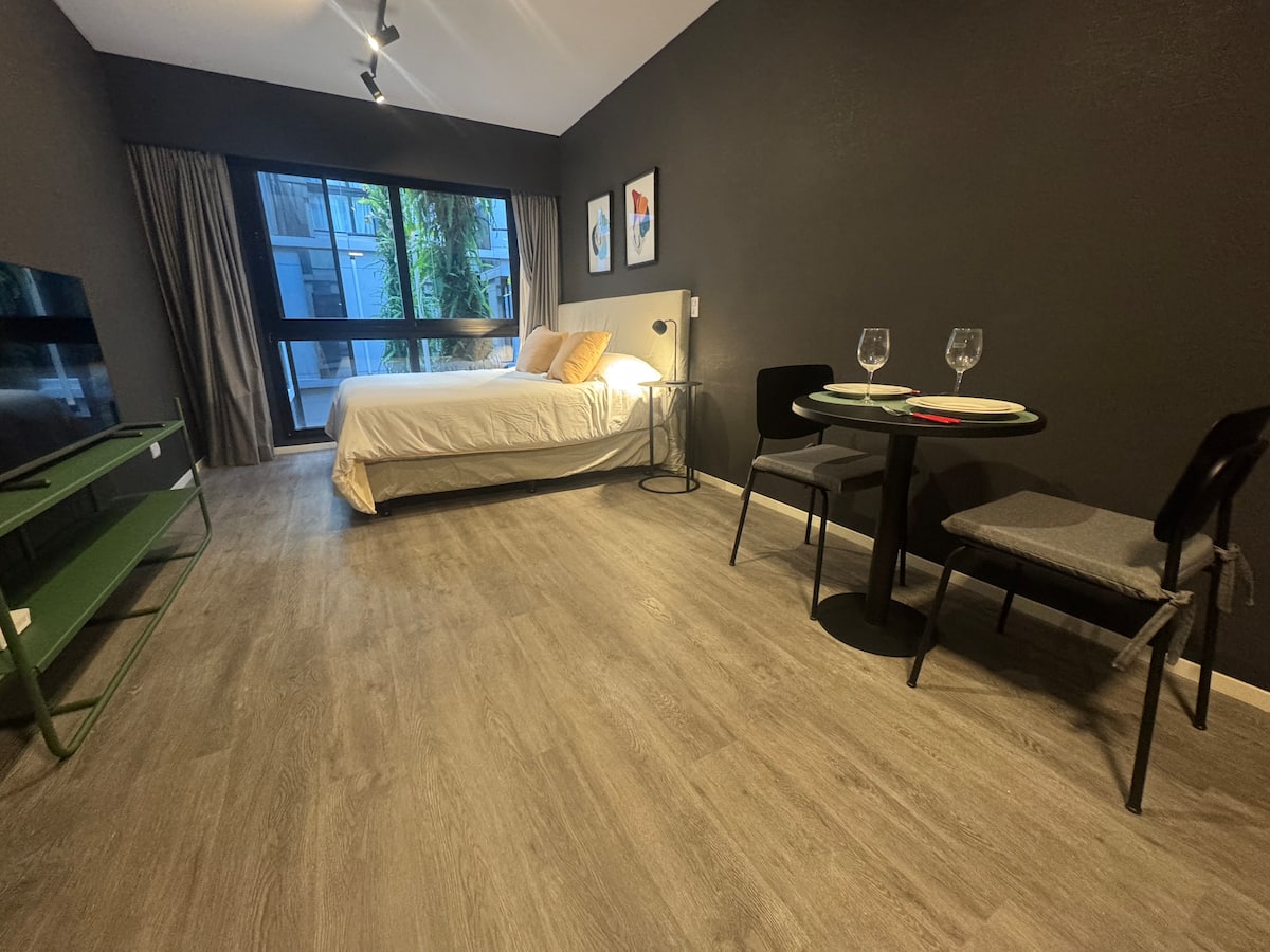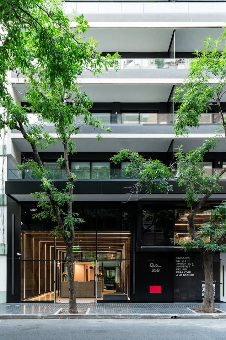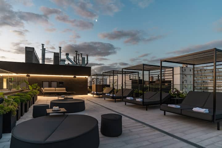Monoambiente amoblado en Palermo, entre Palermo Hollywood y Colegiales. Cuenta con cama doble, placard, 1 baño completo y cocina equipada con heladera, vajilla y electrodomésticos. Incluye aire acondicionado y calefacción central con control individual, TV y WiFi, cerradura digital y equipamiento de cocina como cafetera Nespresso, tostadora y pava eléctrica. El edificio dispone de pileta semiolímpica climatizada, pileta exterior, gimnasio de 500 m², área de co-working, espacios de yoga y meditac