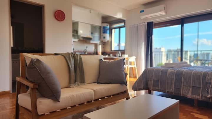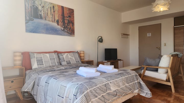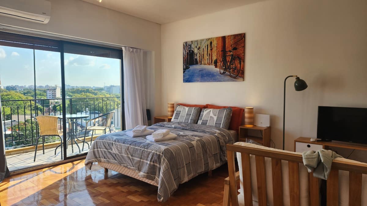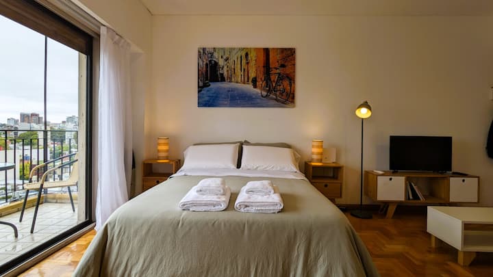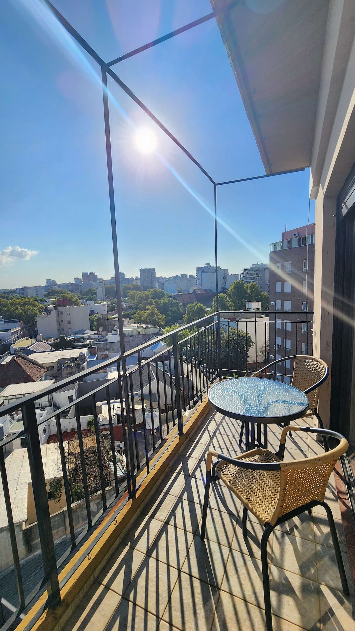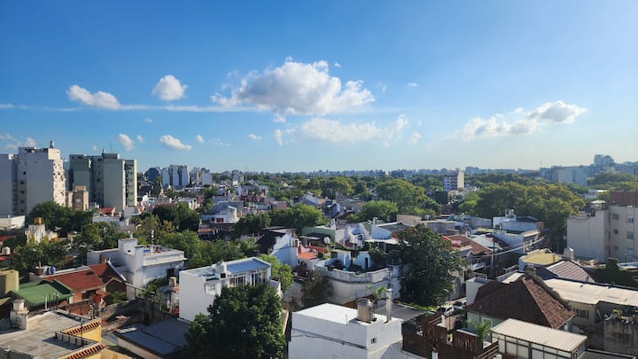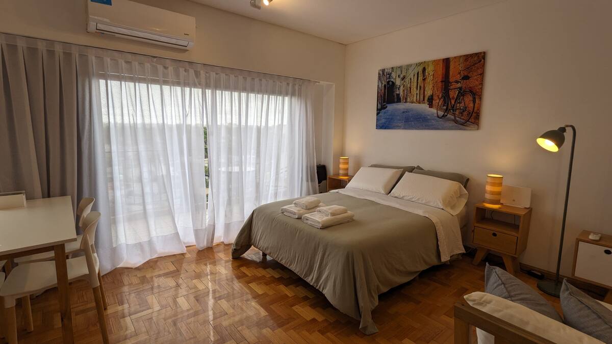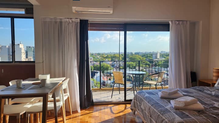 Monoambiente en Parque Chas, con balcón y vista. Está amoblado y equipado con cama queen, mesa de comedor que puede funcionar como escritorio, cocina completa con cocina a gas de 4 hornallas, horno, microondas, heladera con freezer, cafetera eléctrica, pava eléctrica y tostadora. Incluye baño con ducha y bañera, bidet y secador de pelo, además de WiFi de alta velocidad, Smart TV, aire acondicionado frío-calor y calefacción a gas.