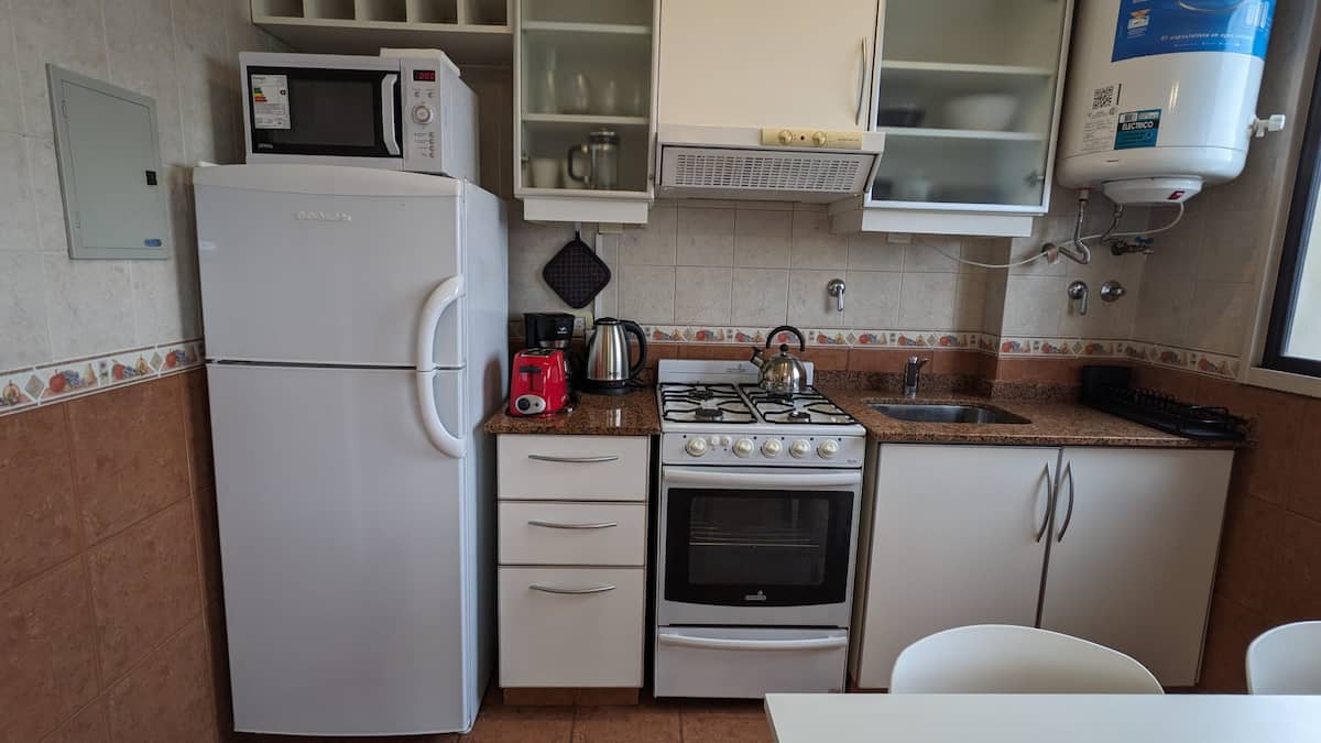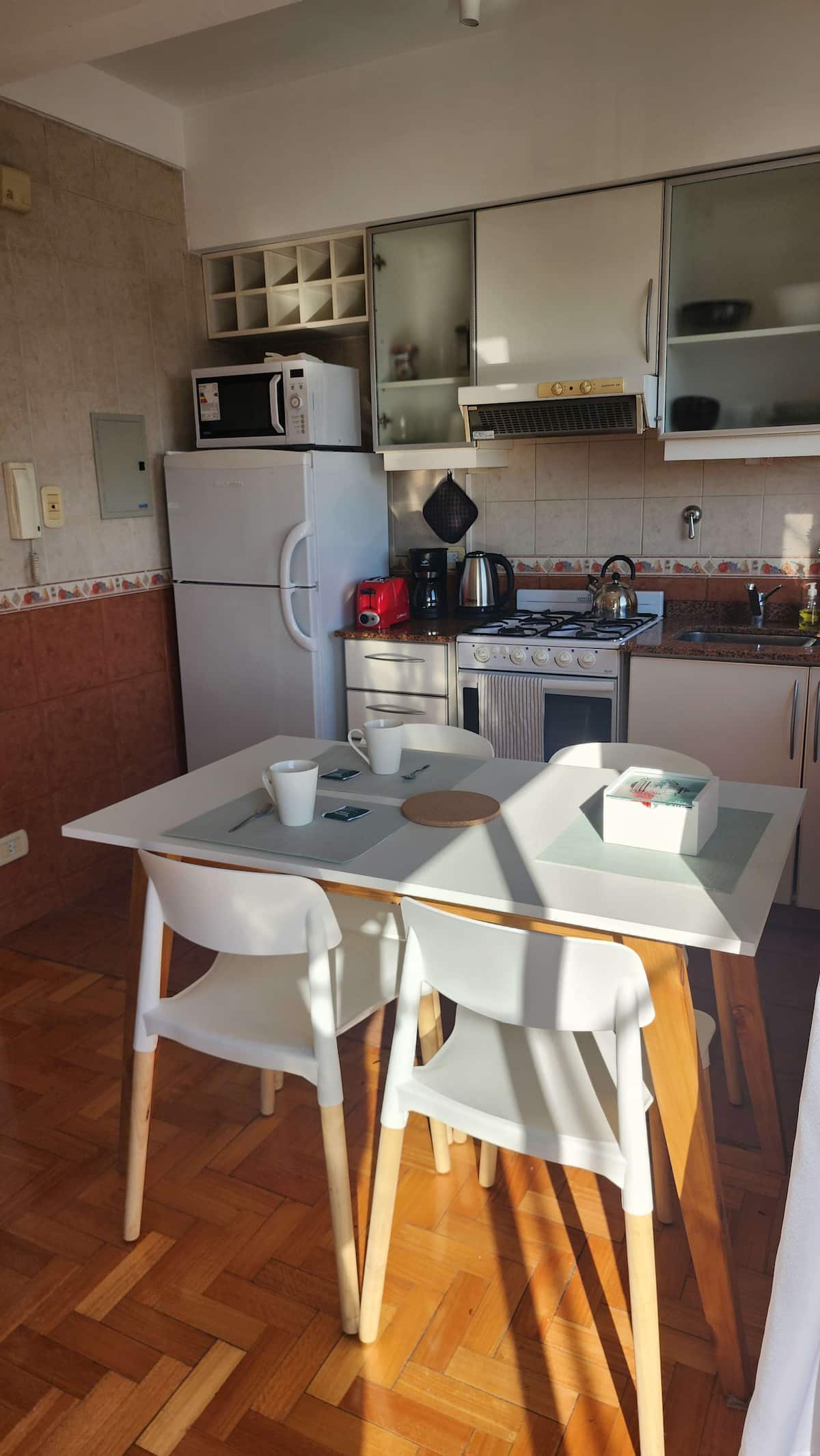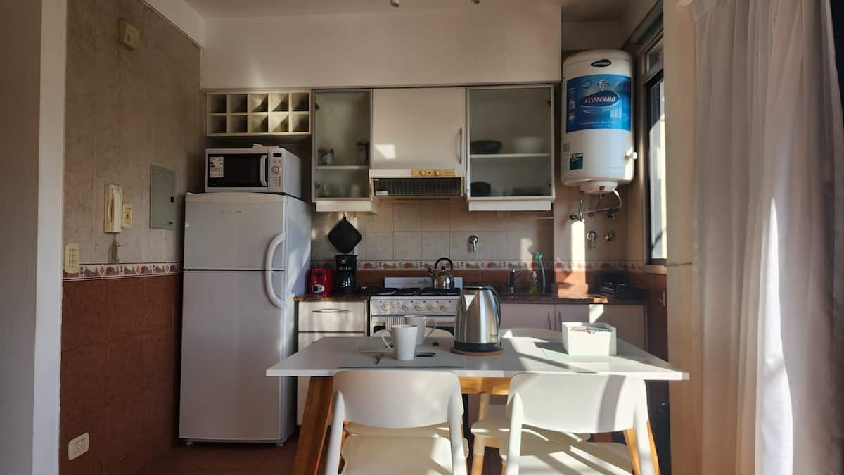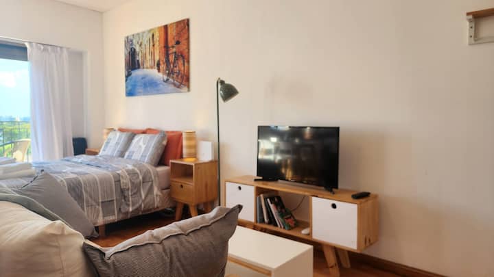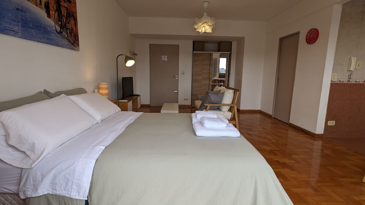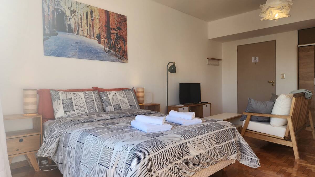 Monoambiente en Parque Chas, con balcón y vista. Está amoblado y equipado con cama queen, mesa de comedor que puede funcionar como escritorio, cocina completa con cocina a gas de 4 hornallas, horno, microondas, heladera con freezer, cafetera eléctrica, pava eléctrica y tostadora. Incluye baño con ducha y bañera, bidet y secador de pelo, además de WiFi de alta velocidad, Smart TV, aire acondicionado frío-calor y calefacción a gas.