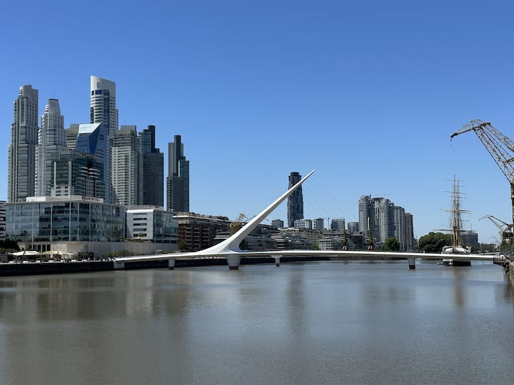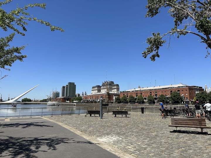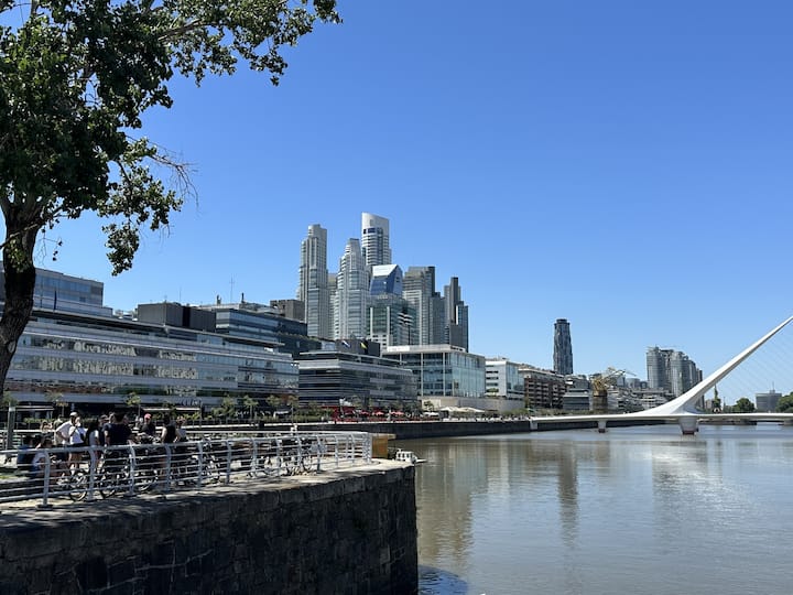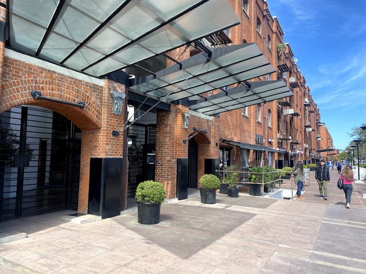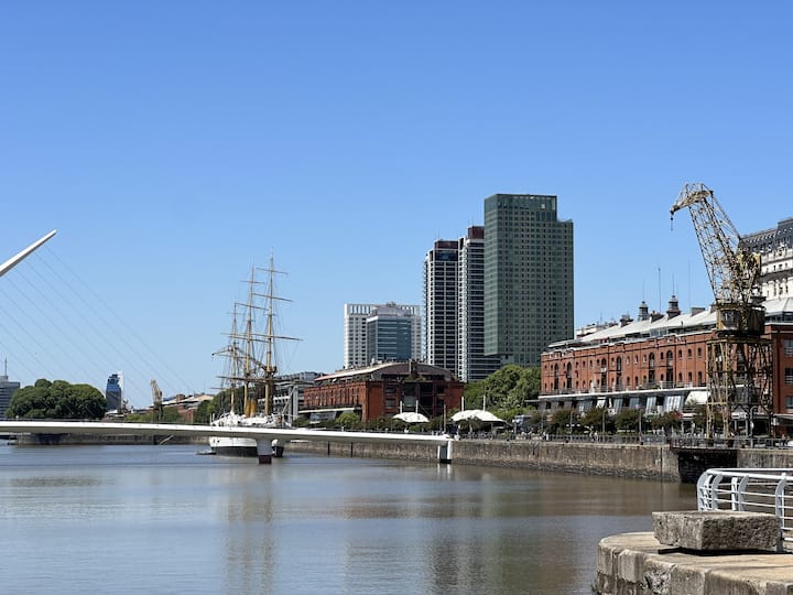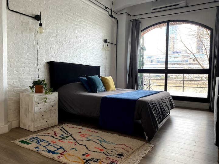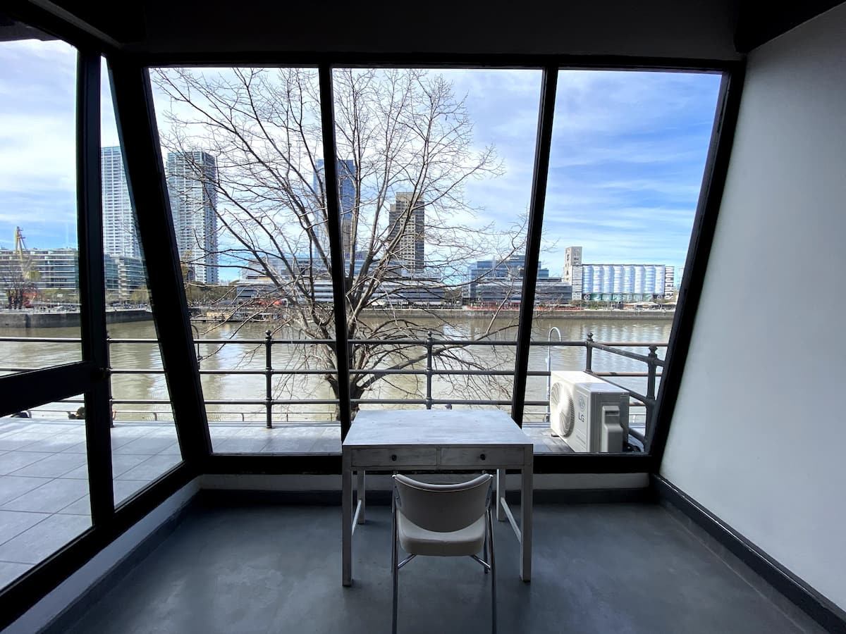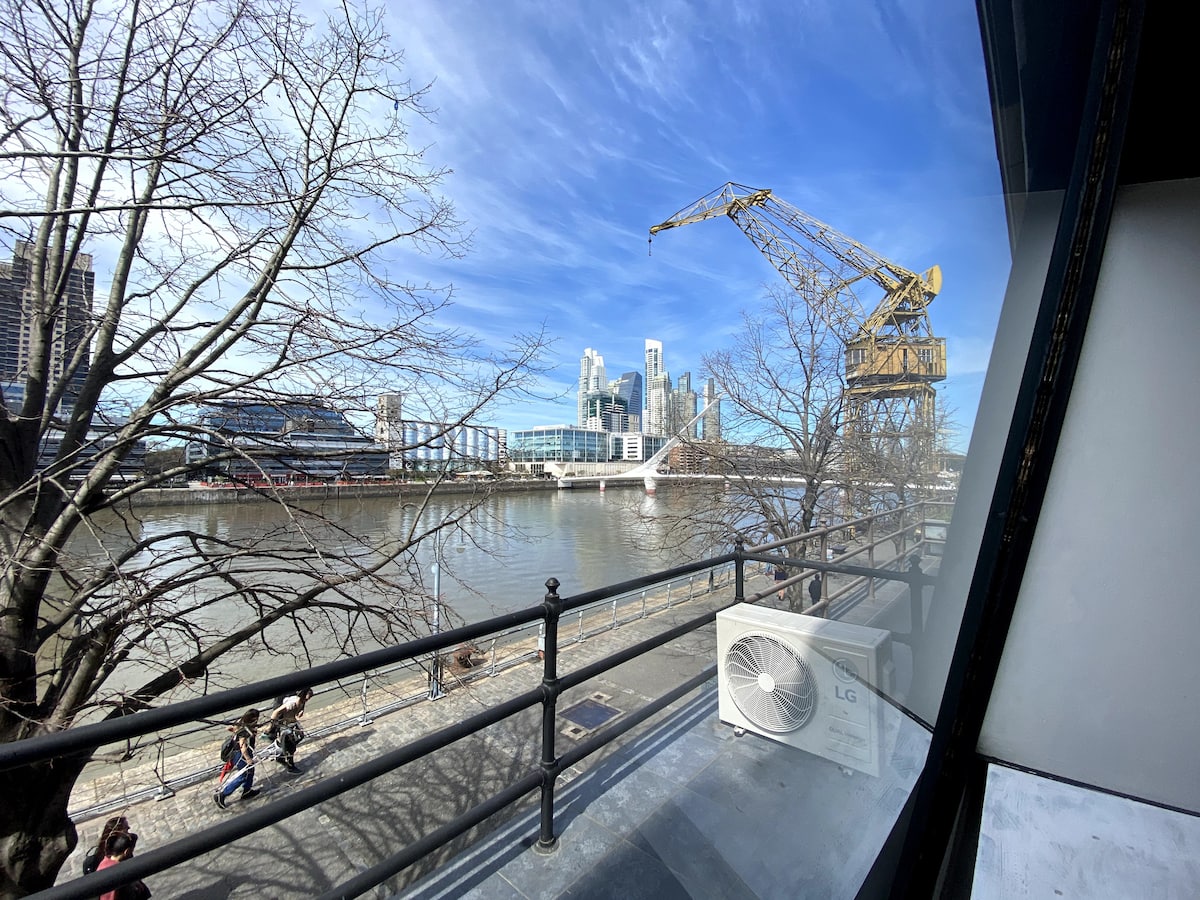 Loft tipo estudio en Puerto Madero con balcón y vista al río. Dispone de cama king, sofá, TV smart grande, cocina completa y baño. Tiene entrada independiente.