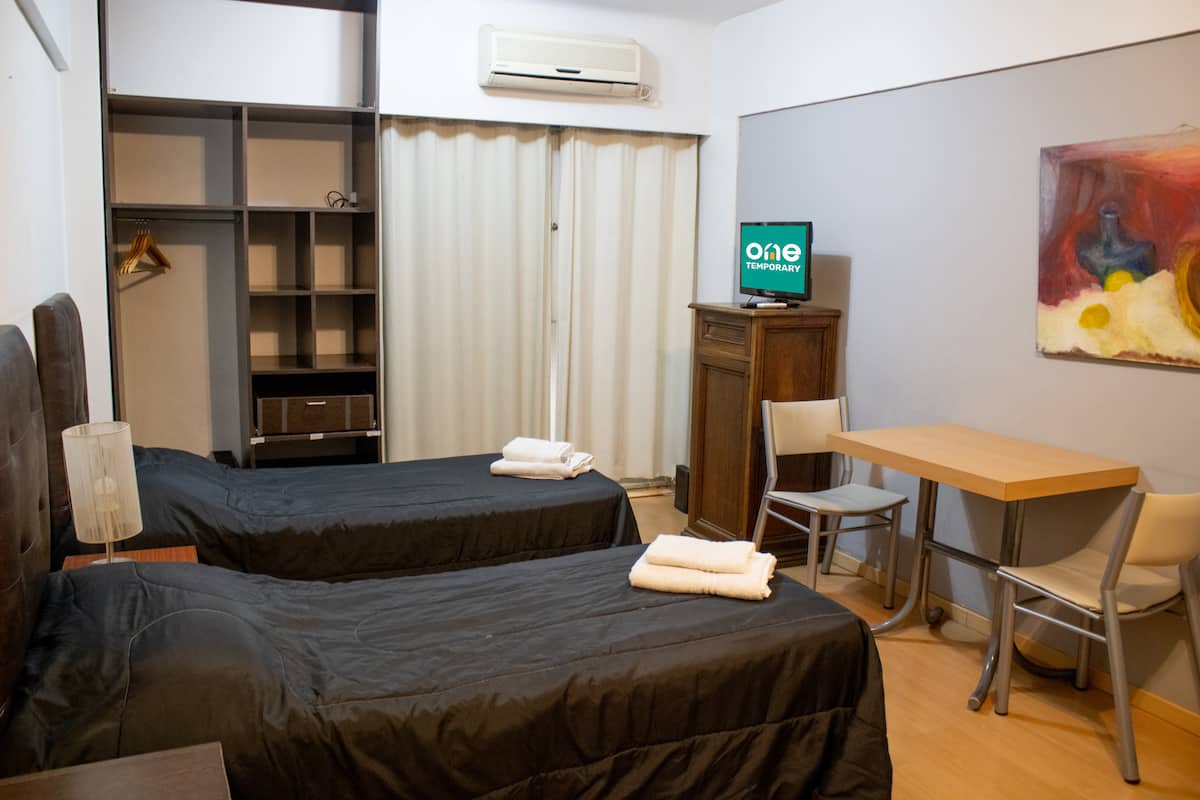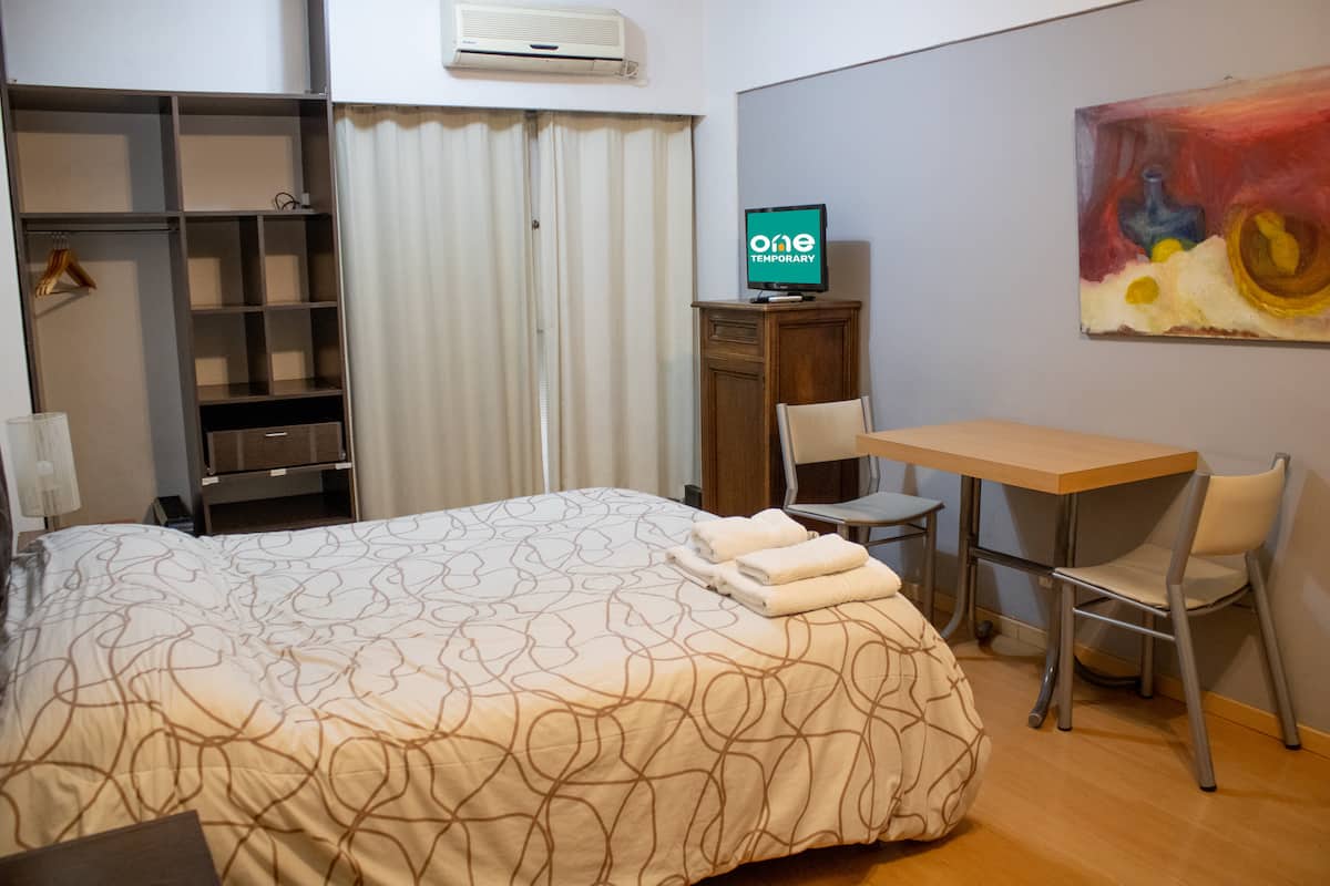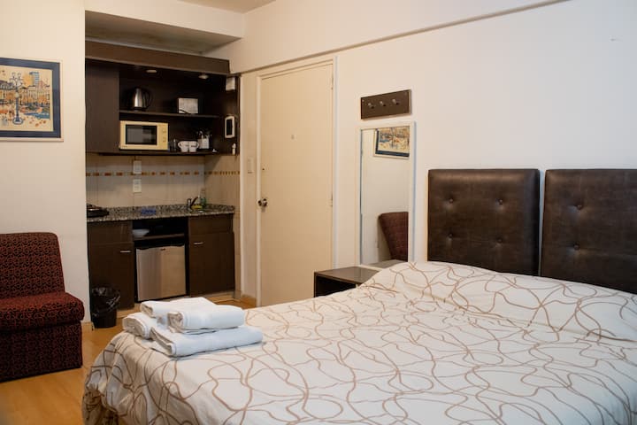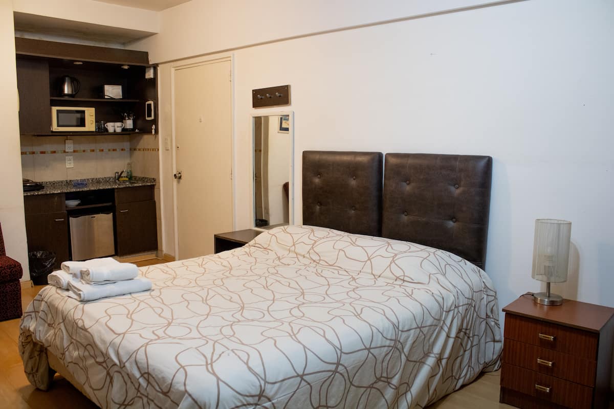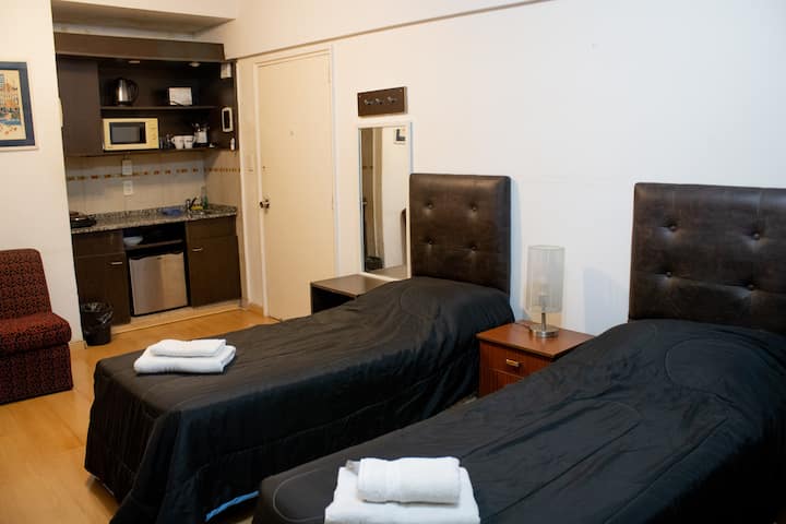 Monoambiente en Recoleta. Se encuentra en el 1º piso y da al frente a la calle. El espacio cuenta con cocina equipada con minibar, hornallas eléctricas, microondas y vajilla completa, y un ambiente con mesa para 2 personas. Incluye Wi-Fi de alta velocidad y acceso a lavandería completa con ropa de cama y toallas. Permite configurar 2 camas individuales o una cama queen con almohadas.