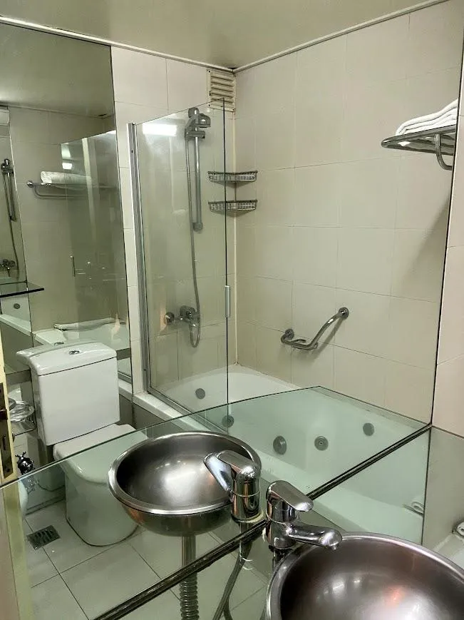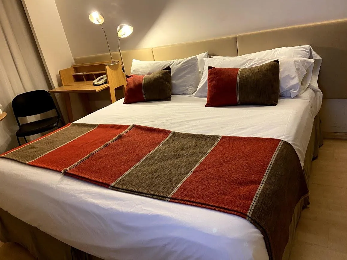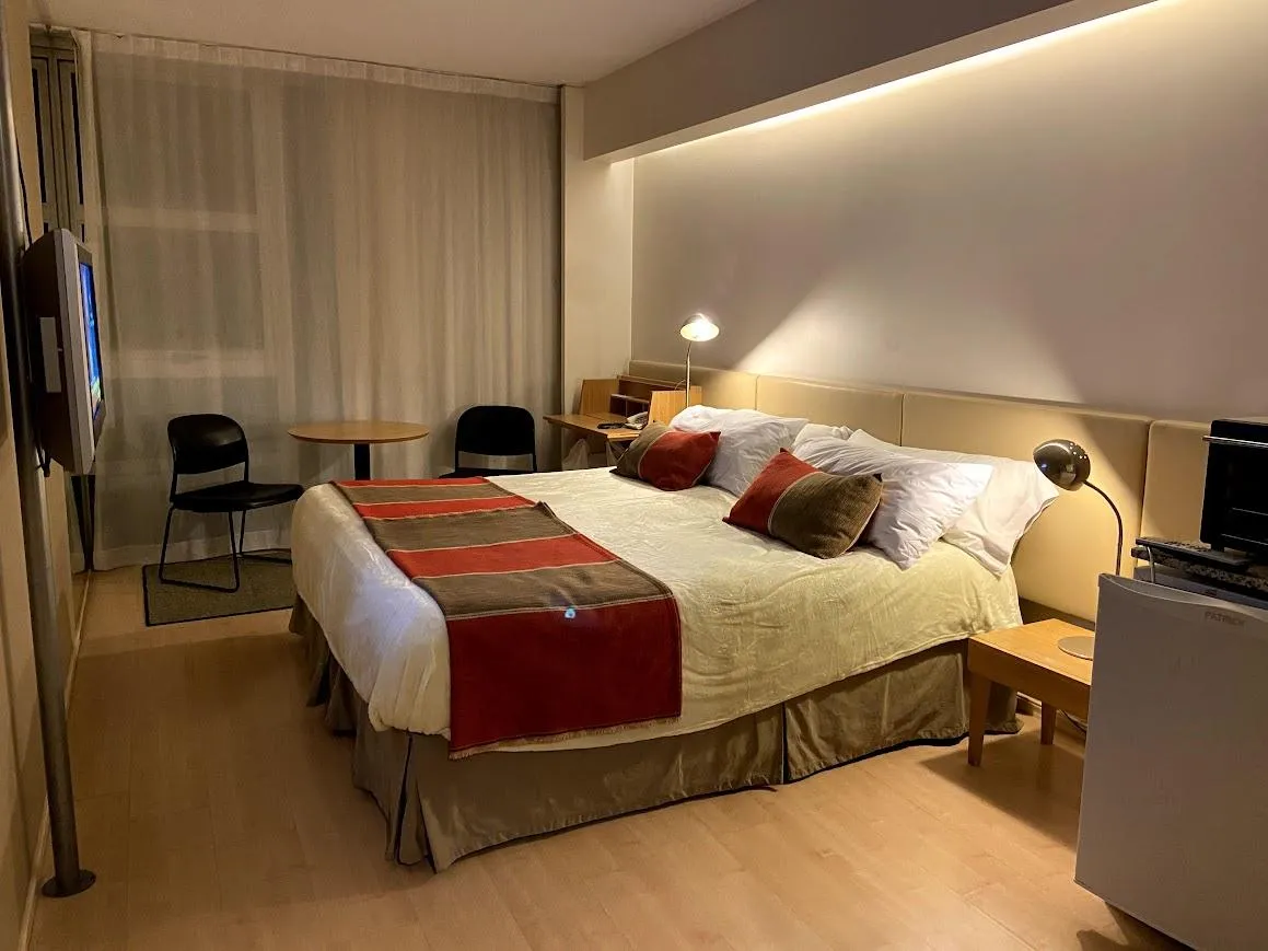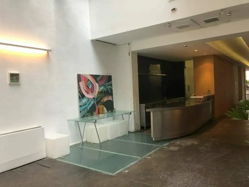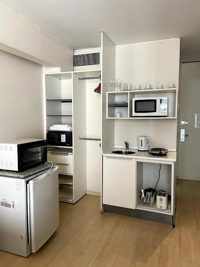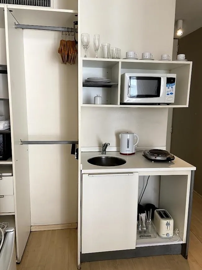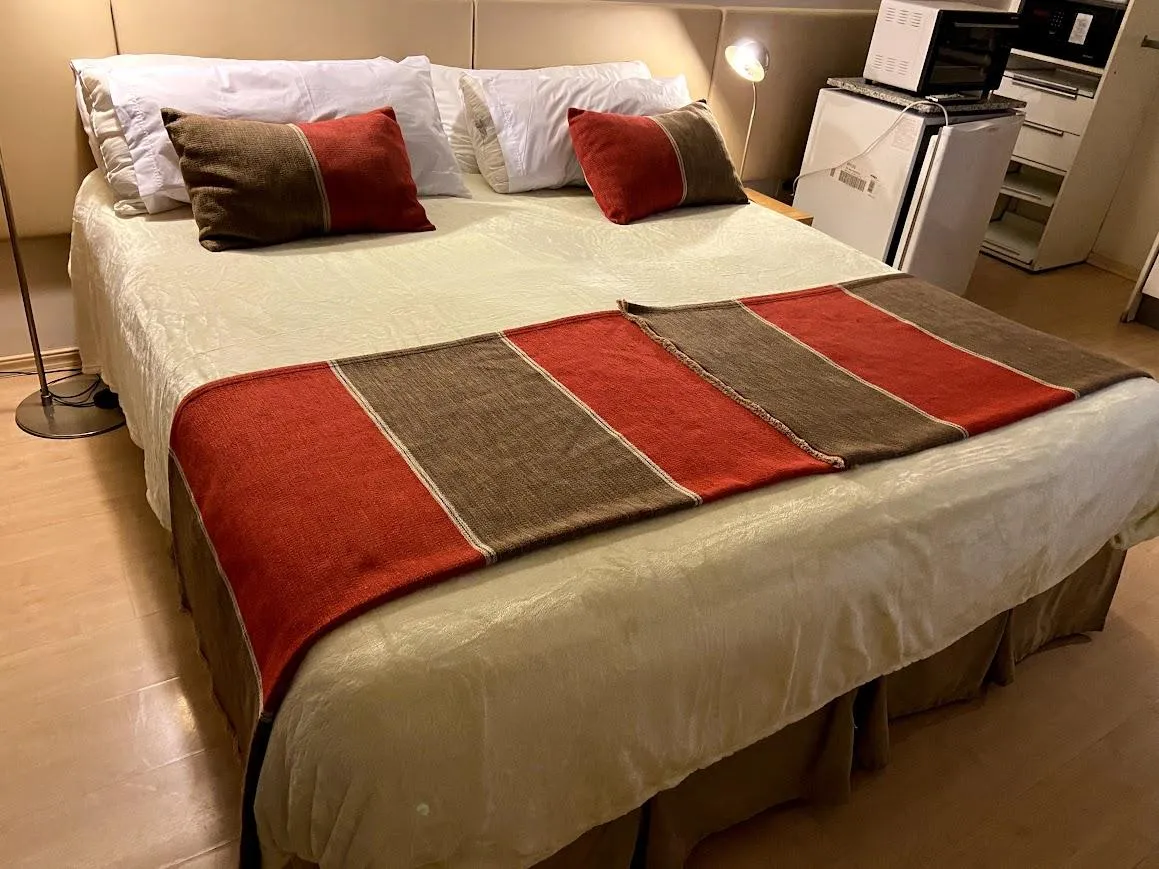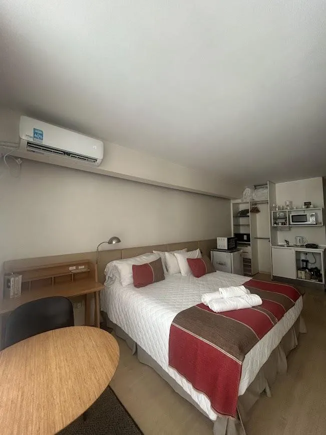 Departamento monoambiente en Recoleta, en Marcelo T. de Alvear 1683. Cuenta con cama queen, kitchenette equipada con heladera y microondas, y baño completo con ducha. Incluye aire acondicionado, ropa de cama y toallas, además de mesa de trabajo. El valor publicado incluye expensas y servicios.