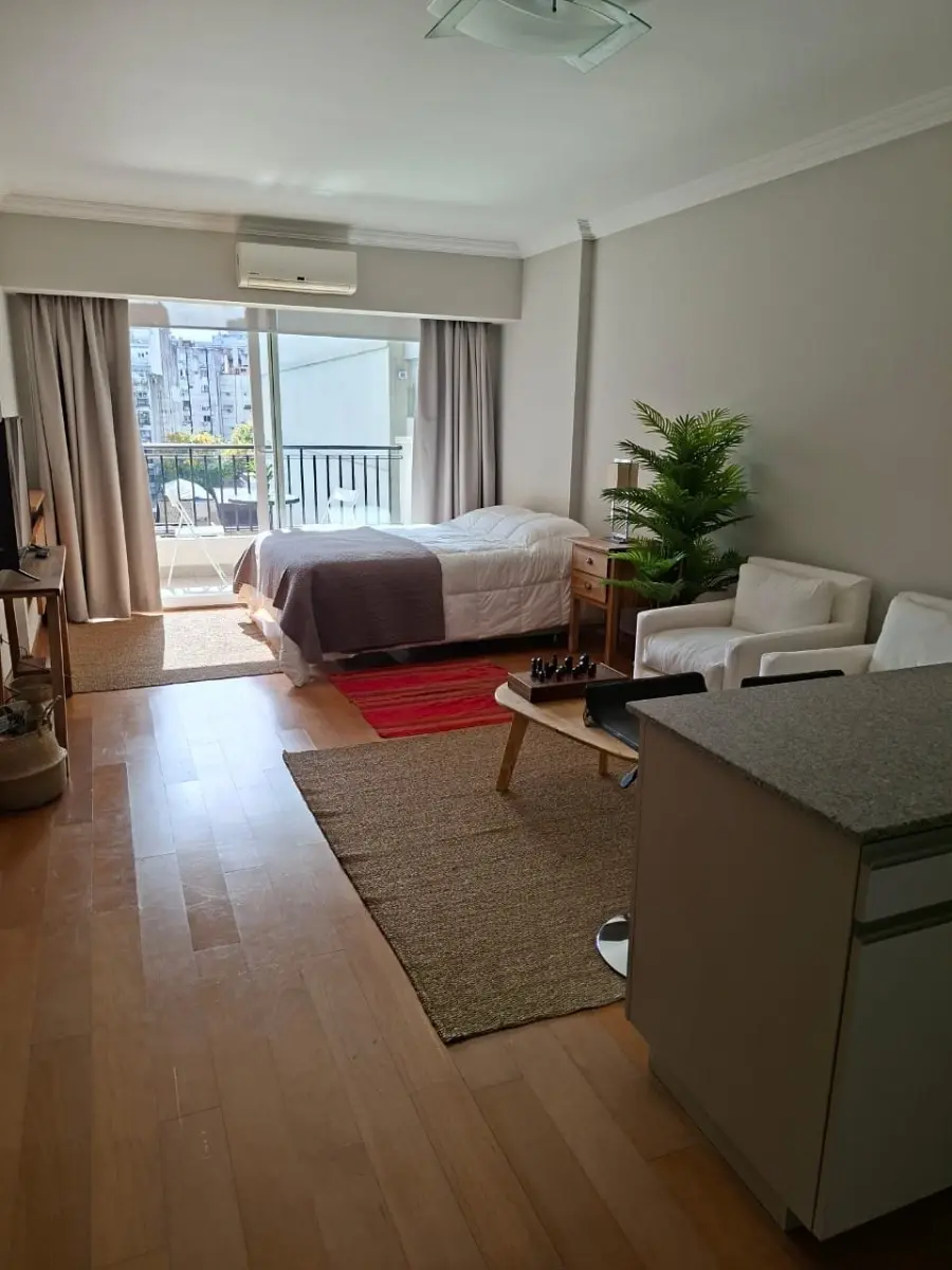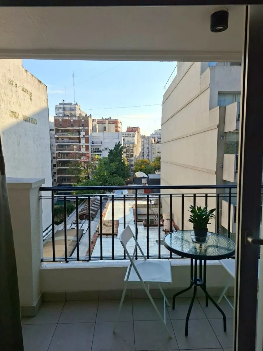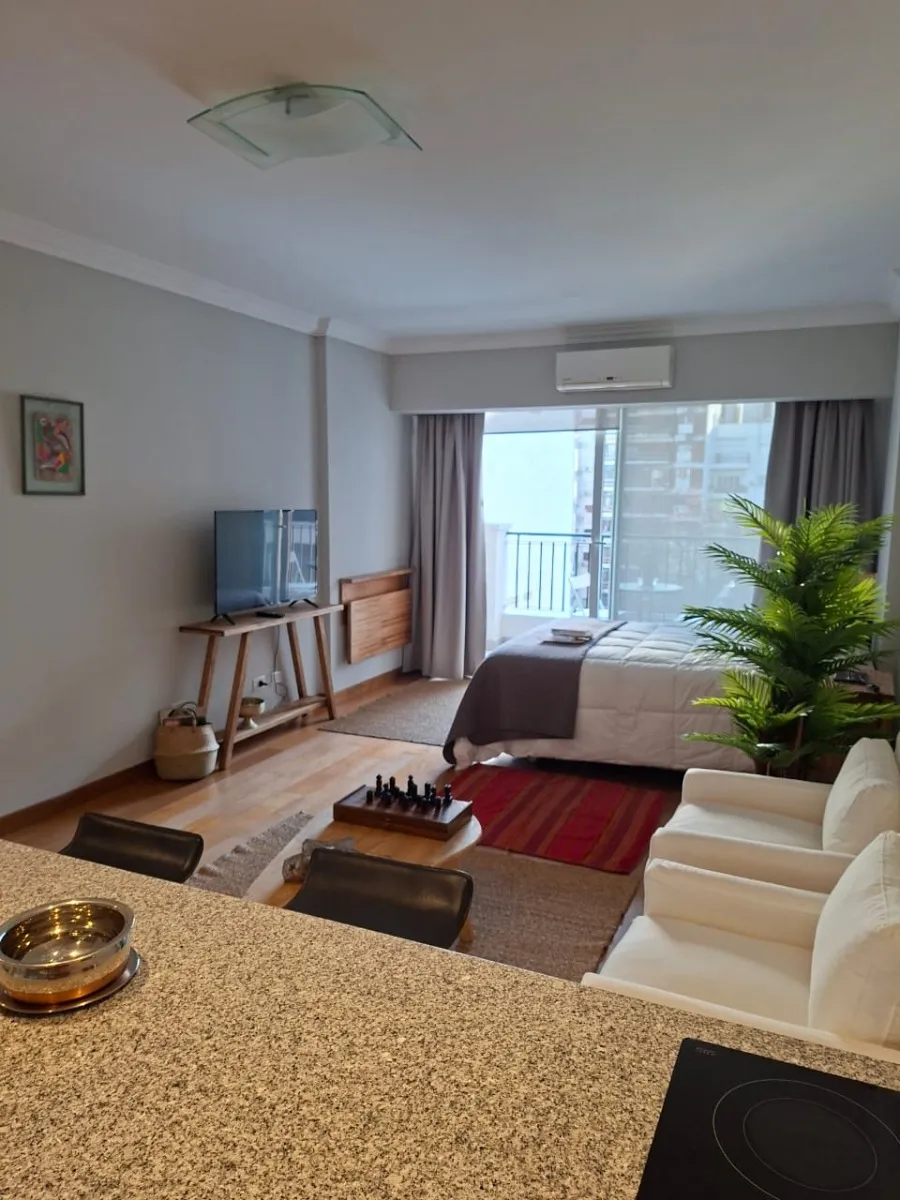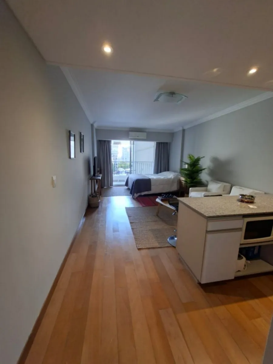 Departamento monoambiente de 43 m² totales, con 39 m² cubiertos, en el 6° piso al frente. Orientación Este, con balcón y cochera fija cubierta. Se entrega amoblado y equipado; cocina integrada eléctrica con barra desayunadora, baño completo con ducha escocesa y aire acondicionado split frío-calor. El edificio tiene seguridad 24 h, SUM, sauna, gym, solarium y laundry en cada piso de uso libre. Alquiler U$S 1.000 con gastos incluidos; entre Av. Pueyrredón y Laprida, a 2 cuadras de Plaza Mitre.