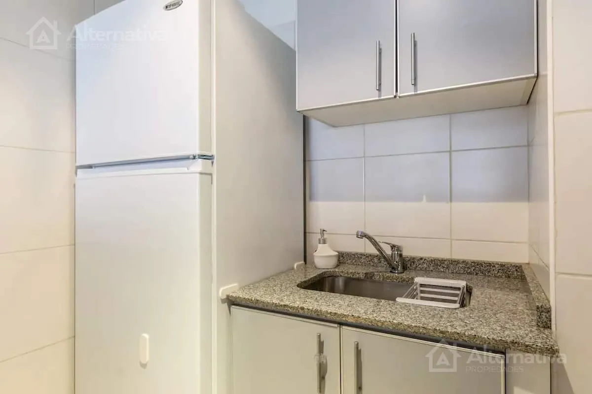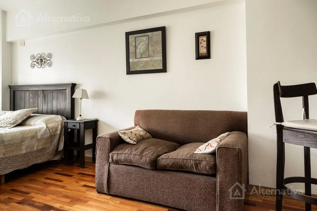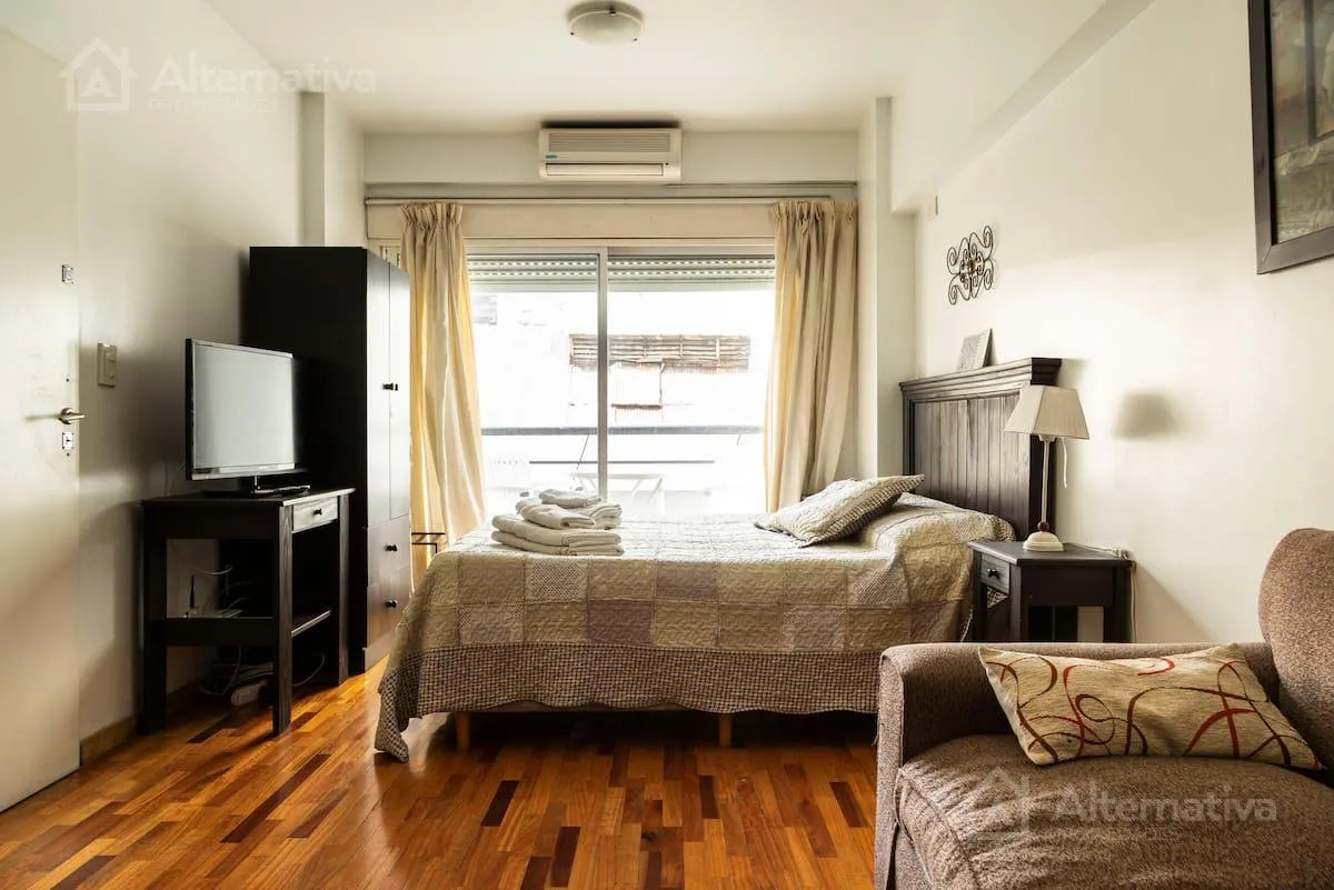 Departamento monoambiente de alquiler temporario amoblado, en un 3er piso con balcón al patio de manzana. Acondicionamiento con aire acondicionado y calefacción; incluye internet, TV por cable y teléfono para llamadas locales. Cuenta con cocina con microondas, heladera y tostadora, cafetera, vajilla, toallas y ropa de cama; tiene cama de 2 plazas y sofá cama. El edificio dispone de lavadora y secadora a monedas, piscina (en verano) y parrilla.