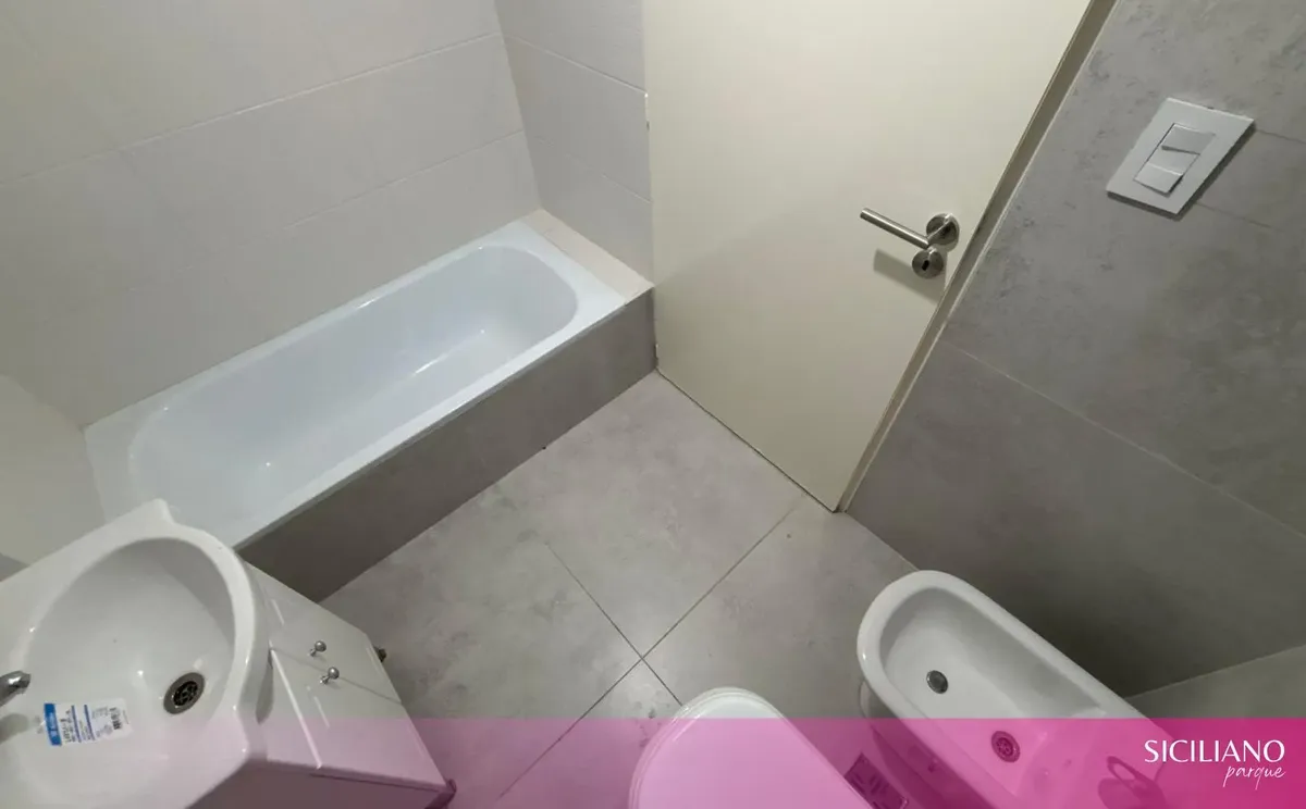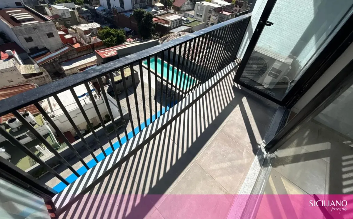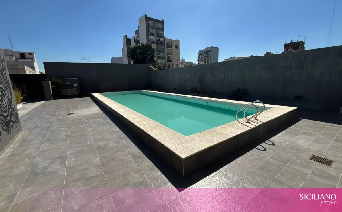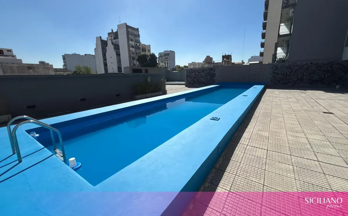 Departamento monoambiente a estrenar de 26,5 m² cubiertos y 3,5 m² descubiertos, en el 10º piso, orientación norte, con balcón al contrafrente y vista abierta. Cuenta con placard en el ambiente principal, cocina integrada y baño completo con bañera. Tiene aire acondicionado frío-calor, agua caliente individual por termotanque eléctrico y pisos flotantes; no posee instalación de gas. El edificio cuenta con PB + 15 pisos, 2 ascensores, seguridad 24 h, servicio de limpieza, 2 piscinas, solarium, gi