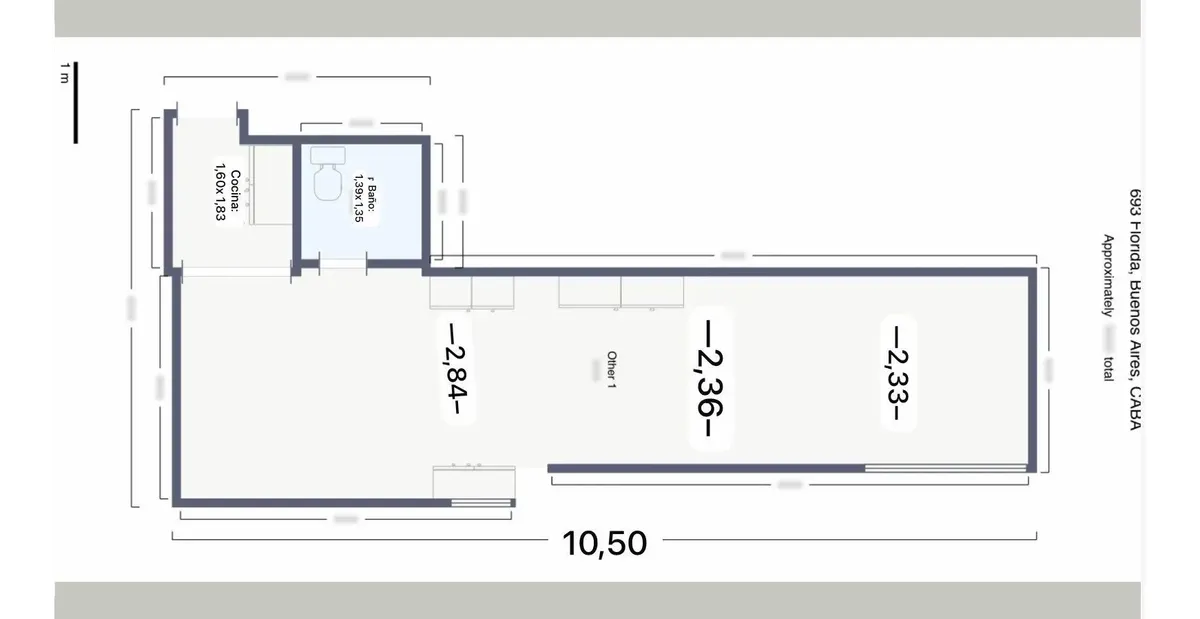 Departamento monoambiente de 31,17 m² cubiertos totales, ubicado en Viamonte al 600, esquina Florida, en pleno Microcentro porteño. Cuenta con ambiente principal de 26,36 m², cocina independiente, baño completo y balcón semicubierto de 1,73 m².