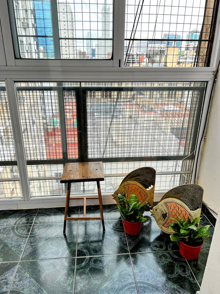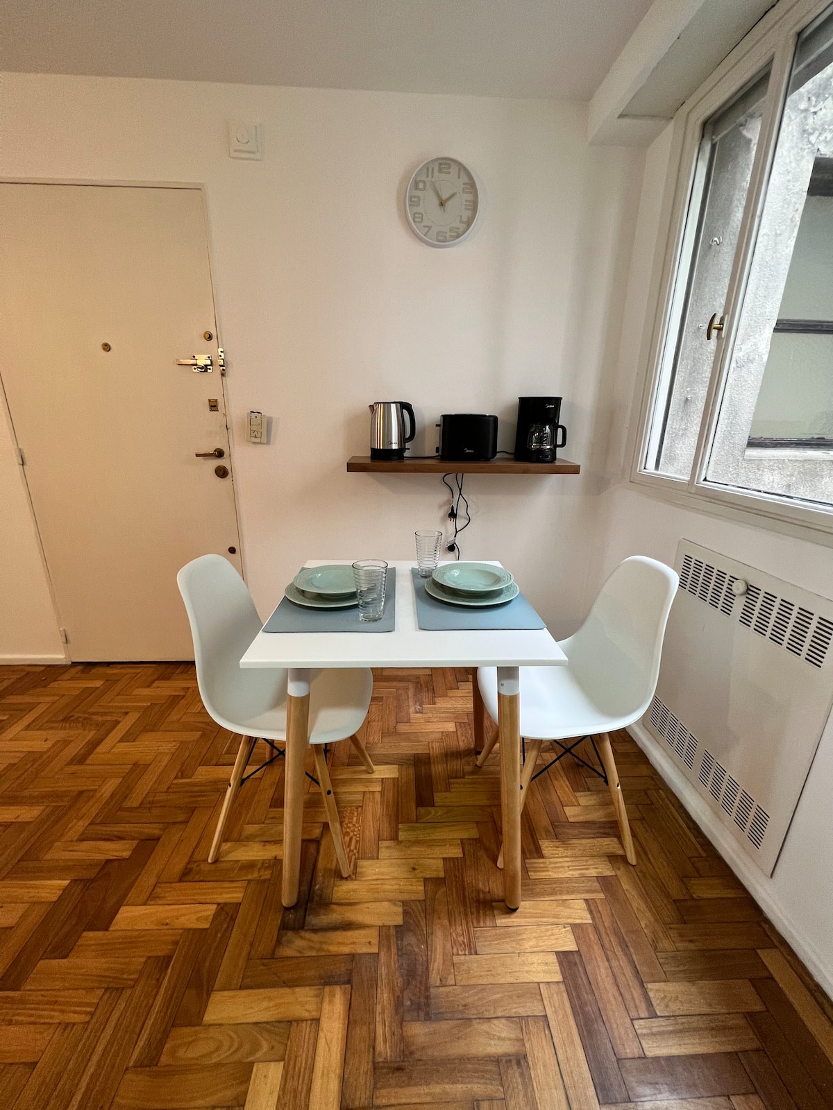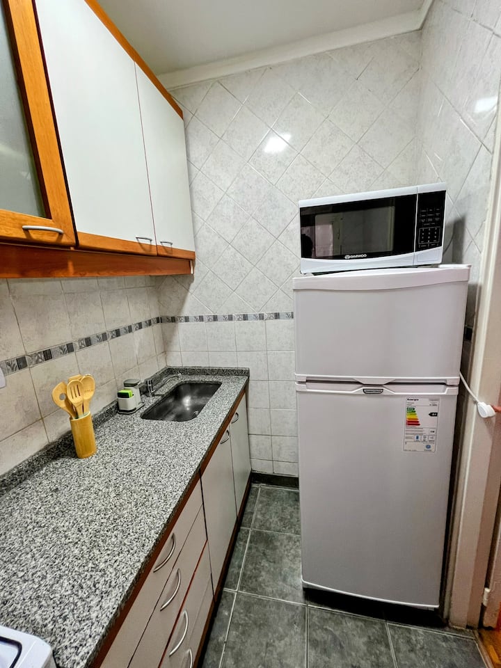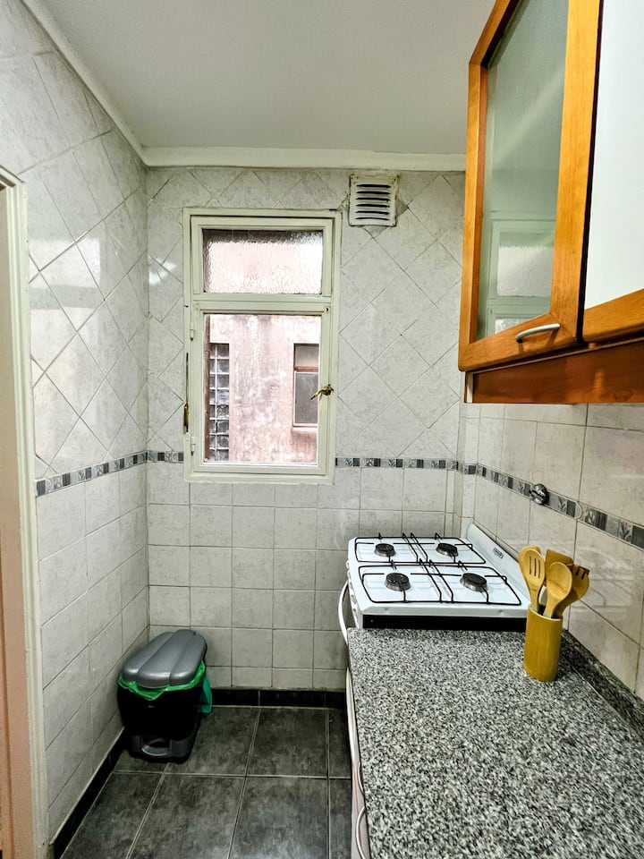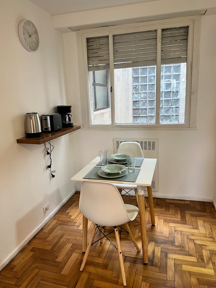 Monoambiente de 8th floor en San Nicolás, contrafrente. Cocina independiente y baño con bañera, bidet, inodoro y bacha. Incluye cocina con horno y microondas, heladera con freezer, tostadora y cafetera; cama queen, ropa de cama y sábanas, más mesa para 2 en el área de comedor.