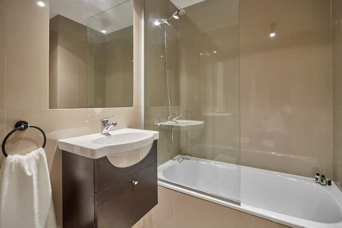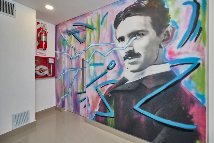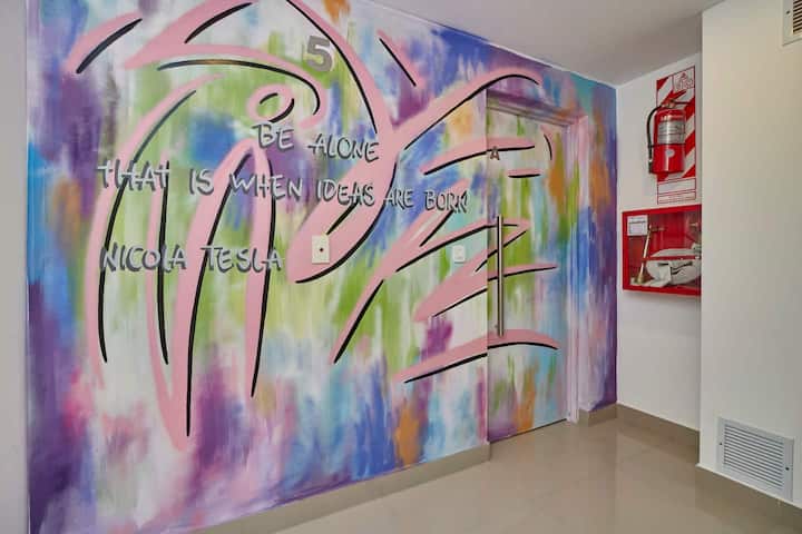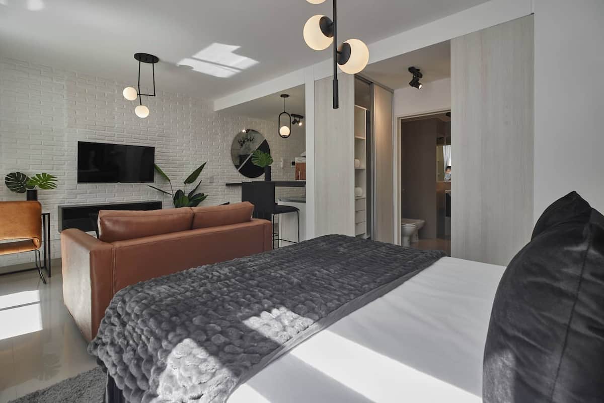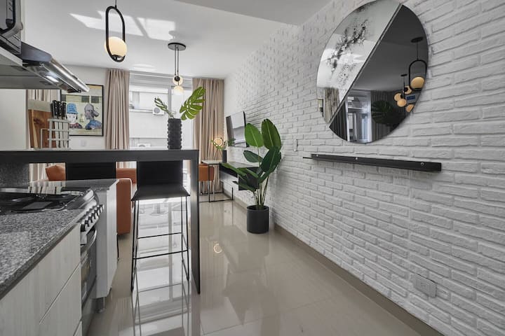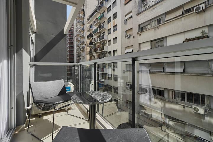 Departamento tipo estudio. Ingreso sin contacto mediante códigos de acceso. WiFi de alta velocidad, café y té estilo Nespresso, y 24/7 lavandería con acceso gratuito. Incluye pileta y solárium en el edificio, además de guarda de equipaje.