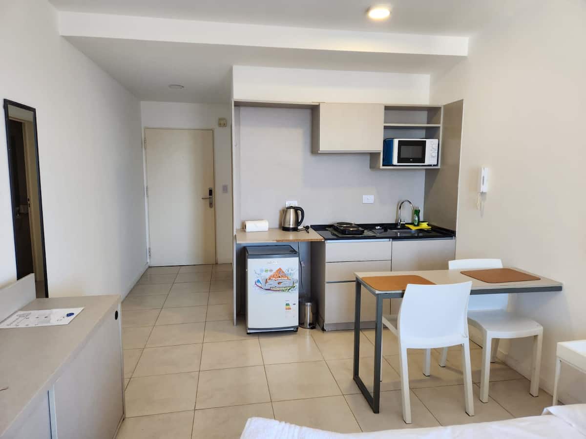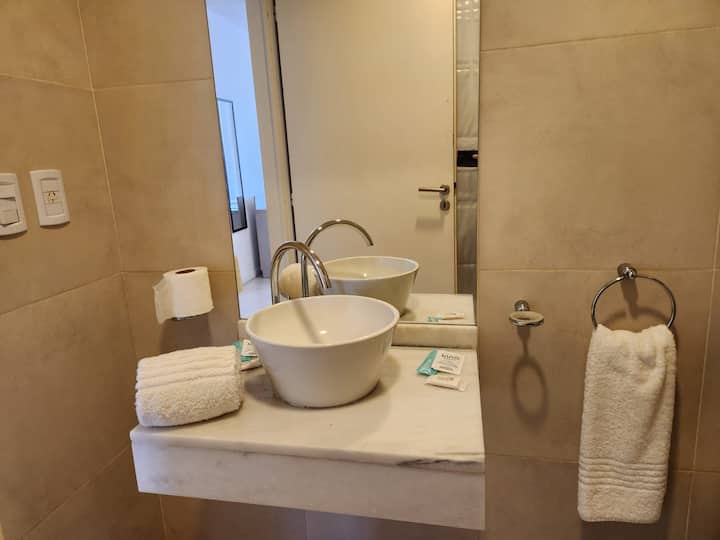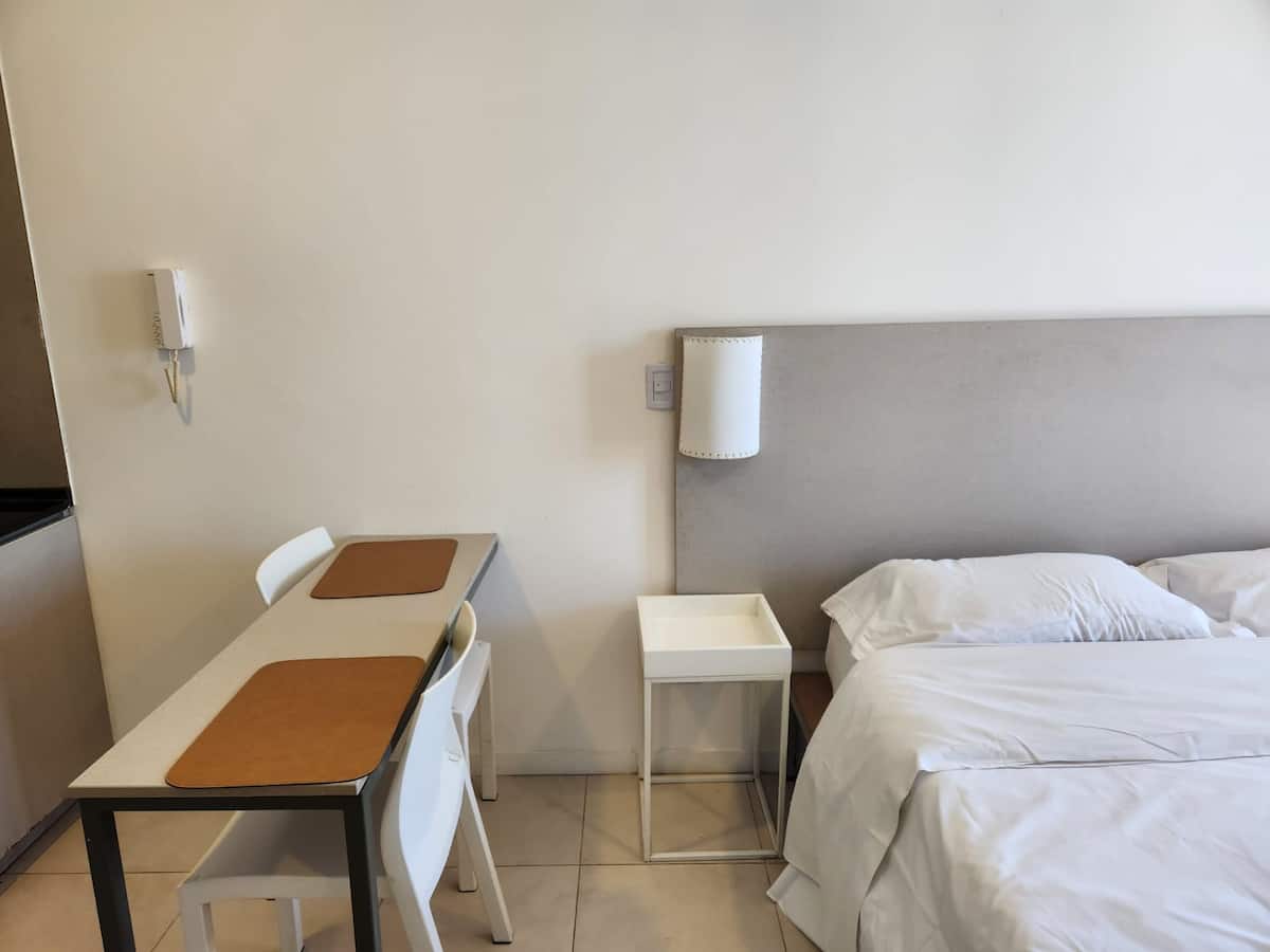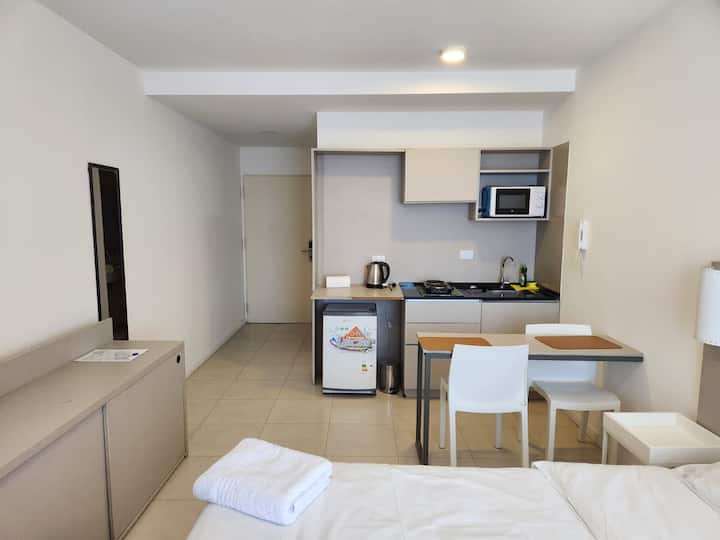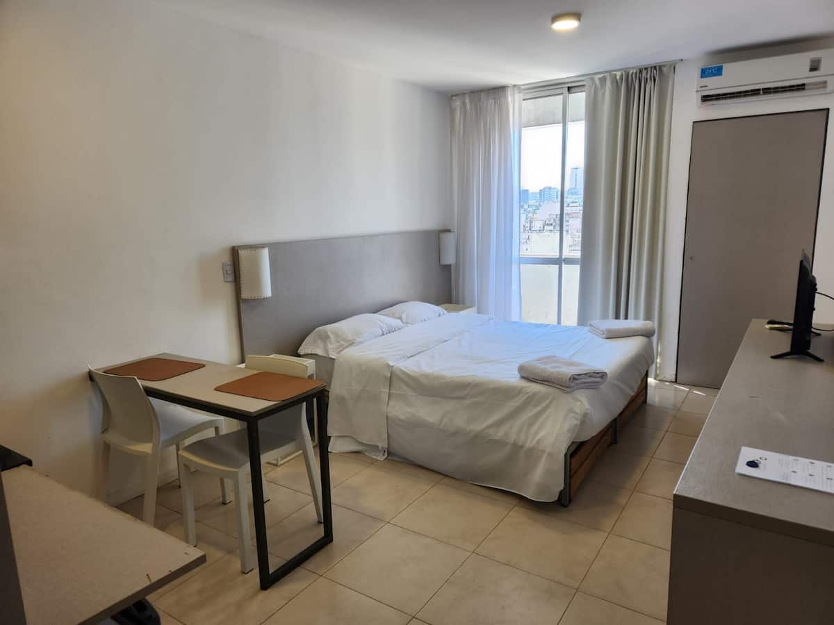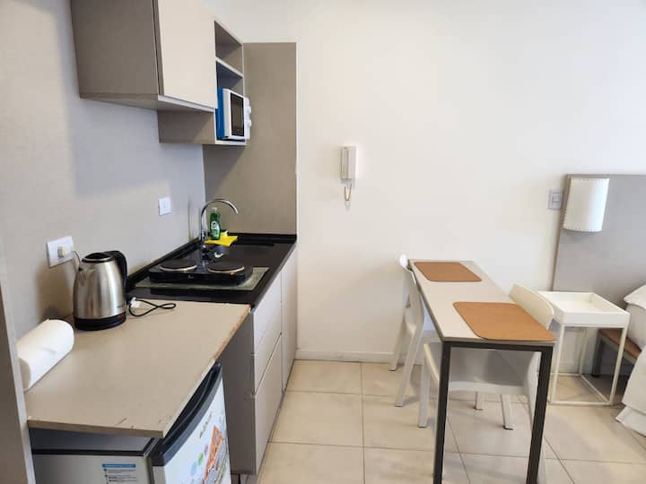 Studio de 2018 en San Nicolás, con balcón. Unidad para hasta 2 personas, con cama doble, mesa y escritorio, sillas, utensilios y vajilla, heladera y baño privado con bañera.