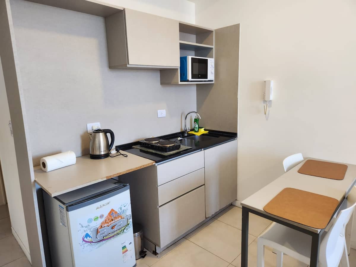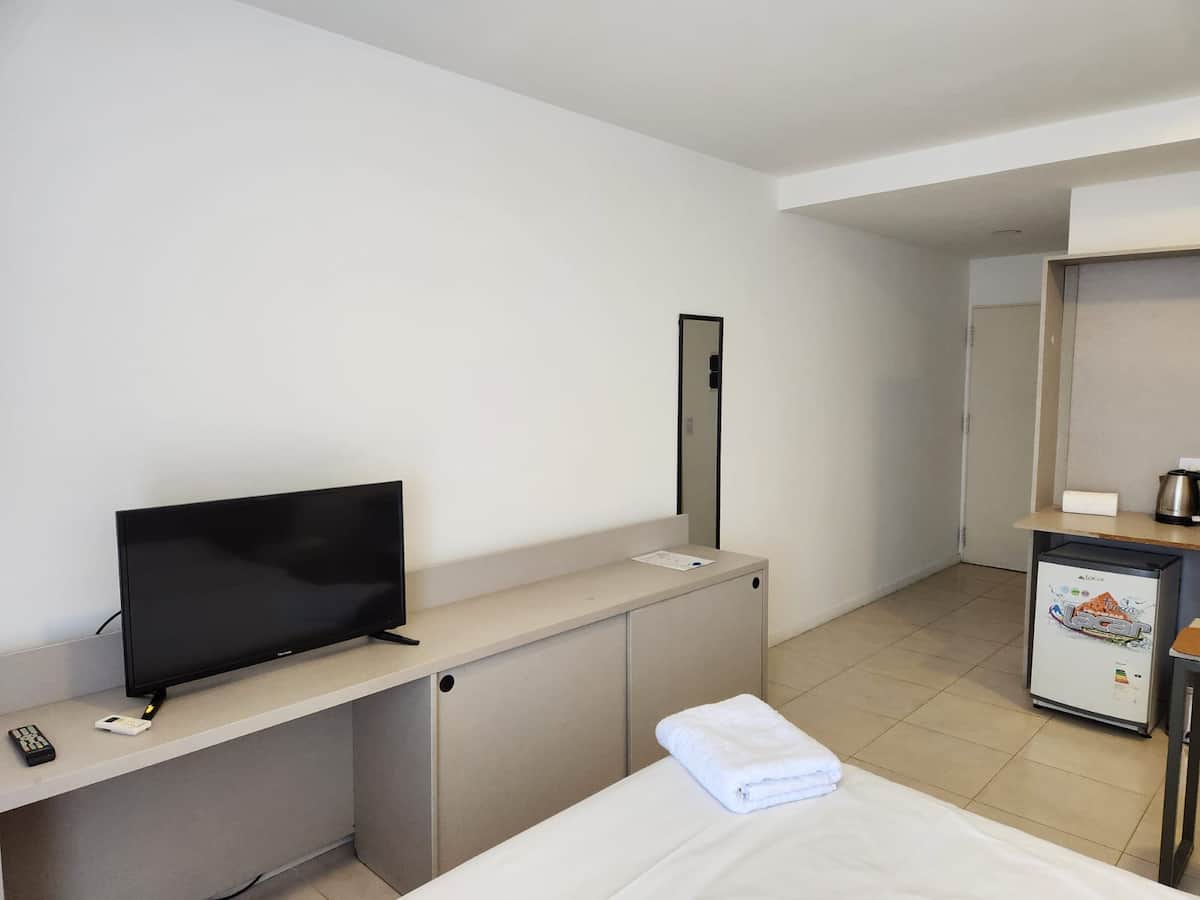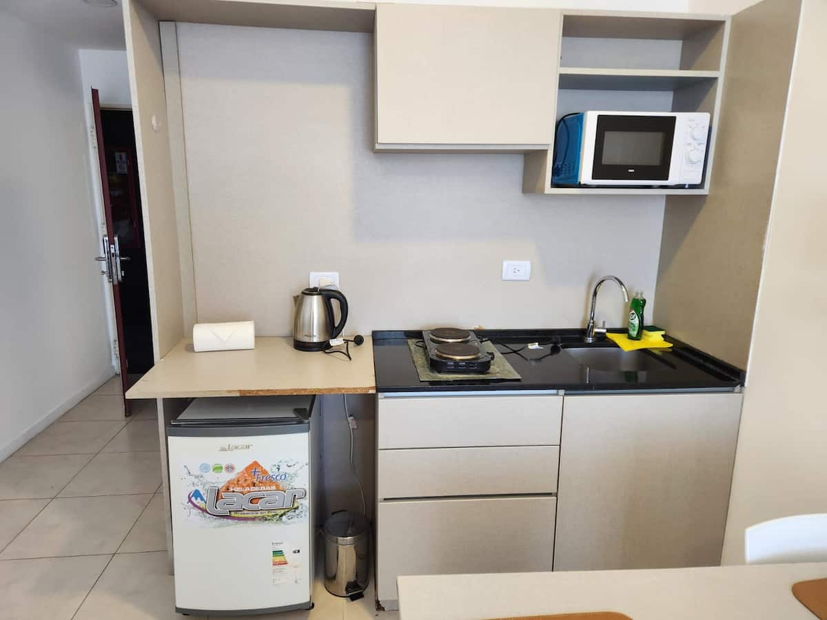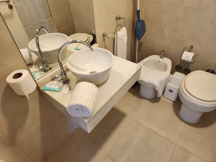 Studio de 2018 en San Nicolás, con balcón. Unidad para hasta 2 personas, con cama doble, mesa y escritorio, sillas, utensilios y vajilla, heladera y baño privado con bañera.