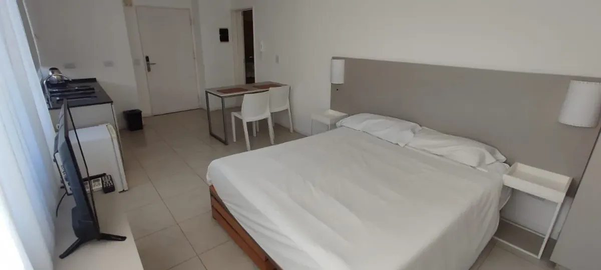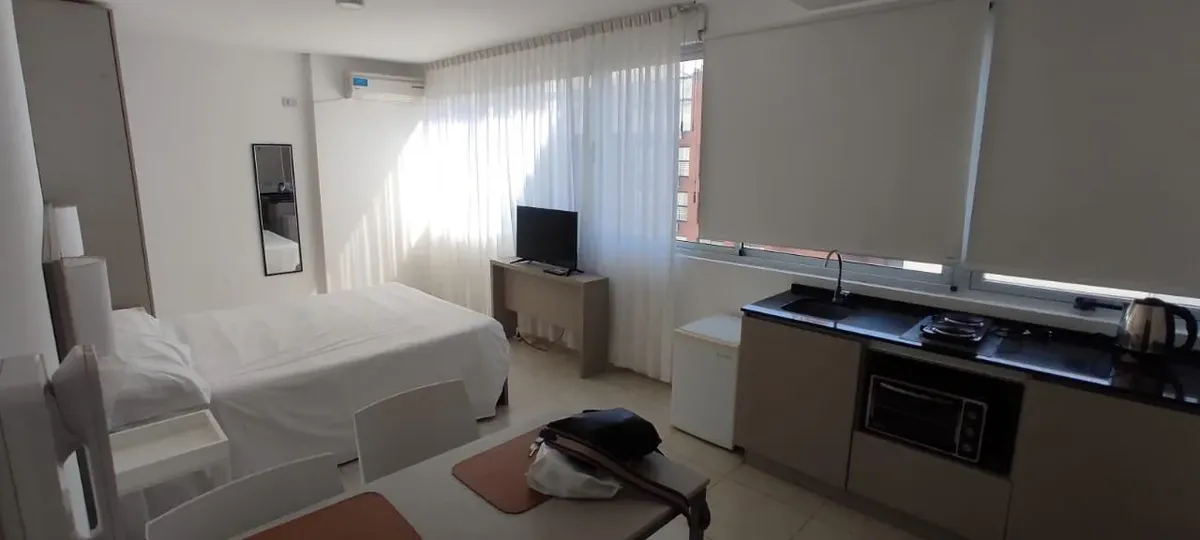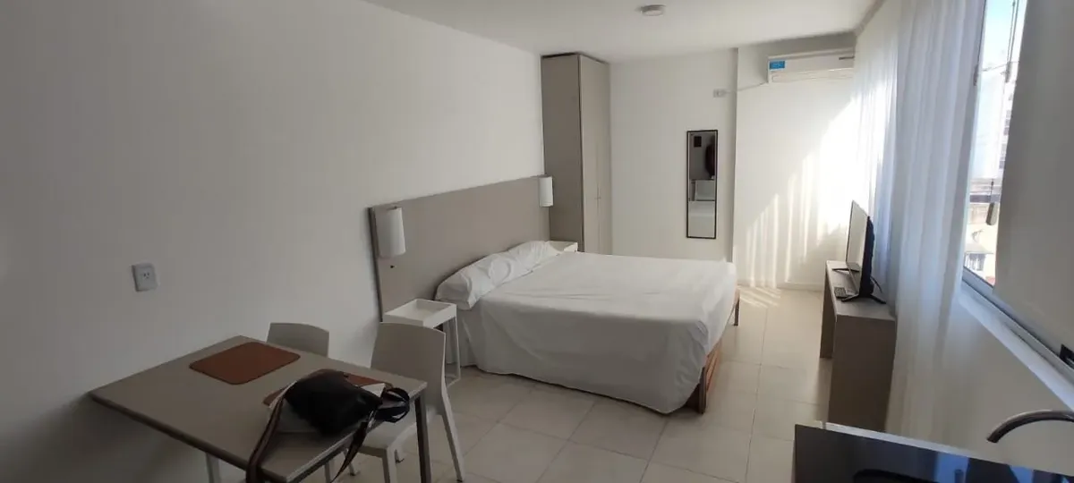 Departamento monoambiente de 28 m² en piso 6, con orientación al contrafrente. Incluye cama matrimonial, aire acondicionado frío-calor, frigobar, TV y caja de seguridad. Cocina con horno microondas y anafe eléctrico, pava eléctrica y agua caliente central, con baño completo con bañadera. El alquiler mensual es USD 550, con depósito de garantía de 1 mes y honorarios inmobiliarios de 1 mes (mínimo 6 meses). Las expensas y el agua están incluidas; no incluye electricidad, internet Wi‑Fi ni limpieza