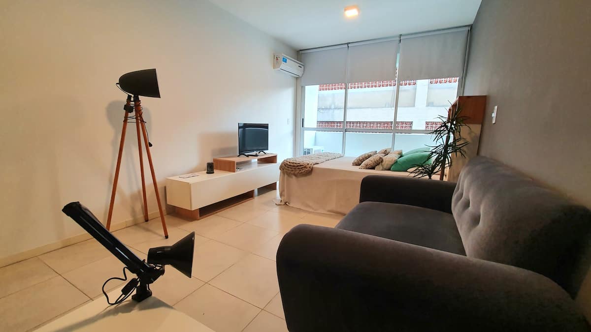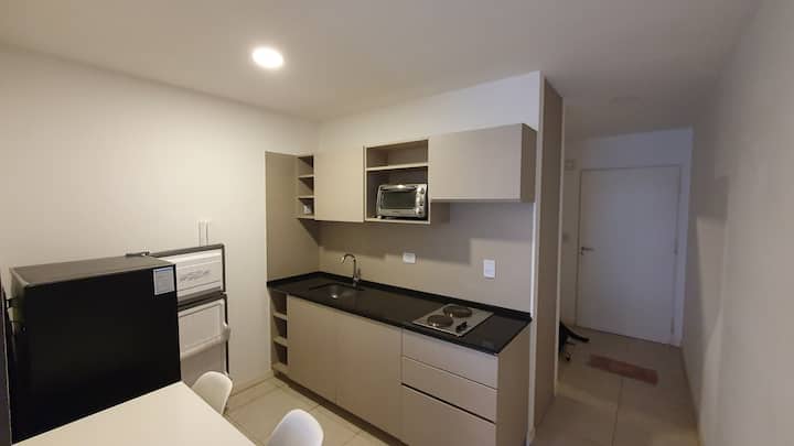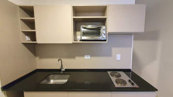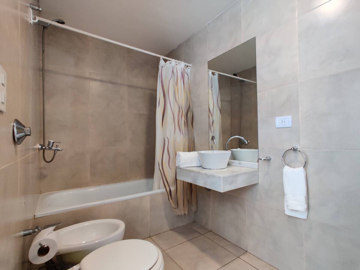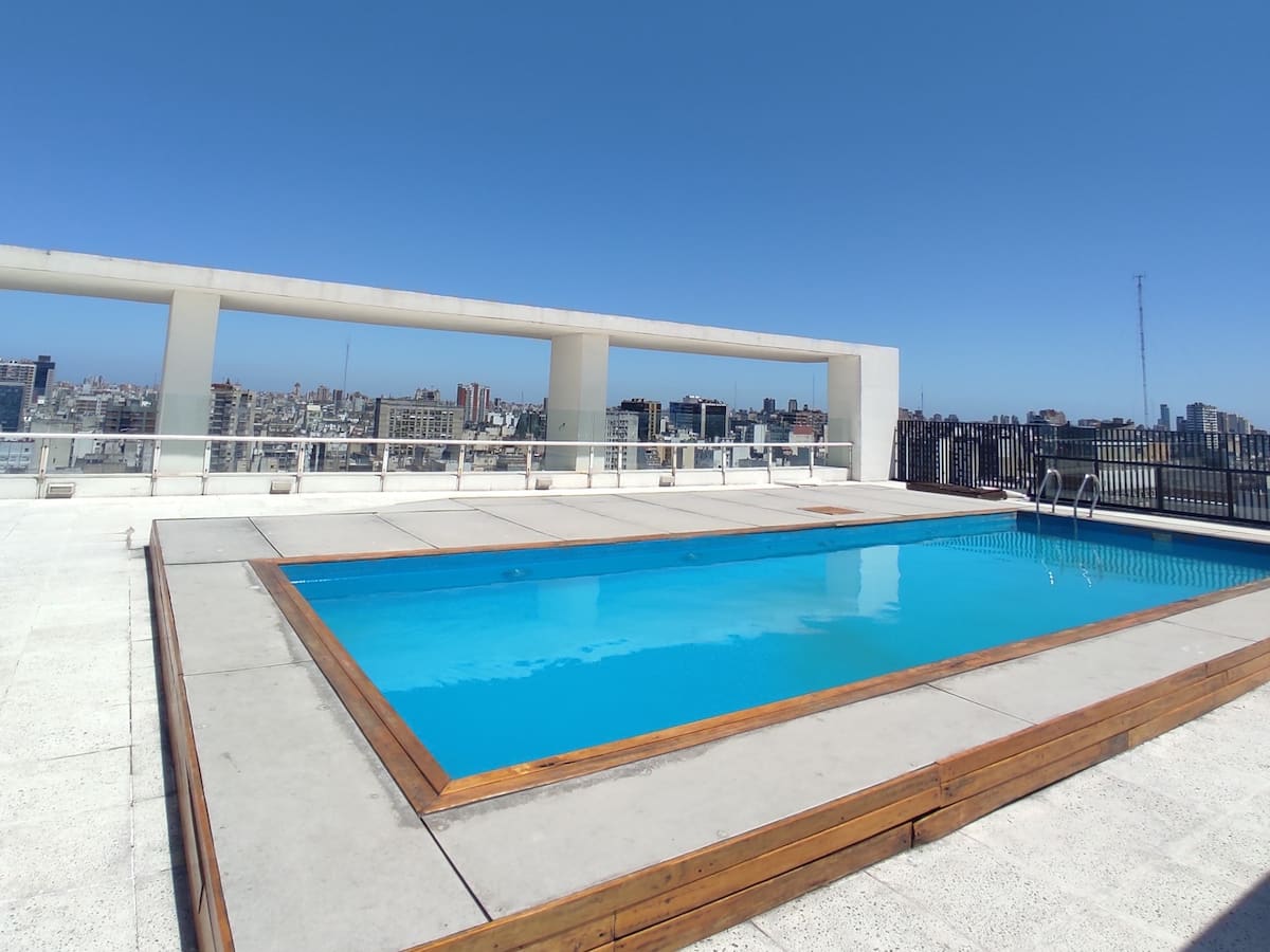Monoambiente de 1 ambiente con balcón, en edificio con seguridad y encargado. Incluye kitchenette americana totalmente equipada, baño privado con bañera, cama Queen, TV LED y aire acondicionado. En la terraza tiene pileta y hay portería con seguridad 24 horas. Se informa que está próximo al subte y al Metrobus.
