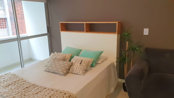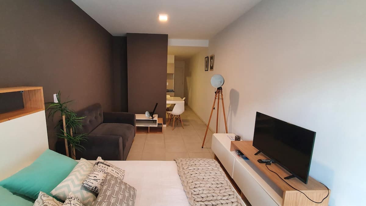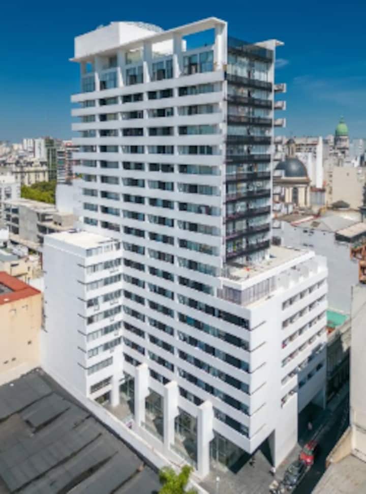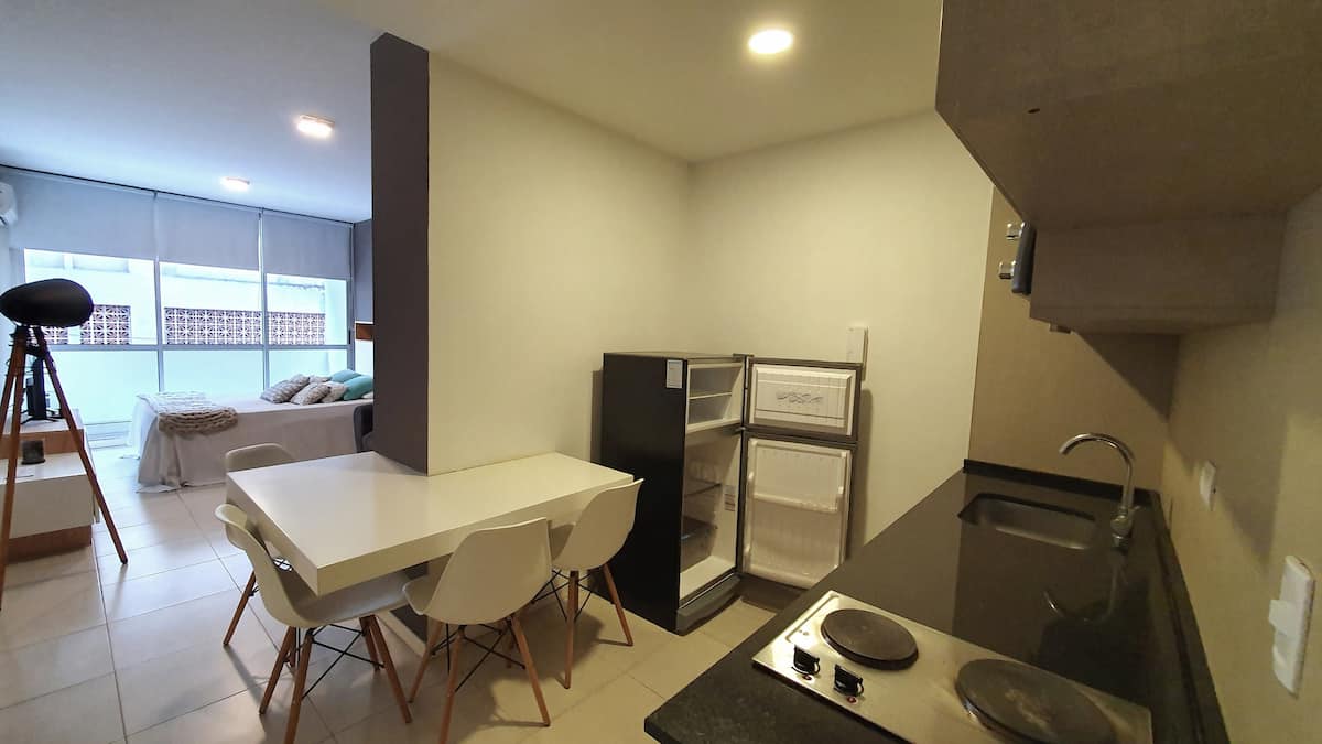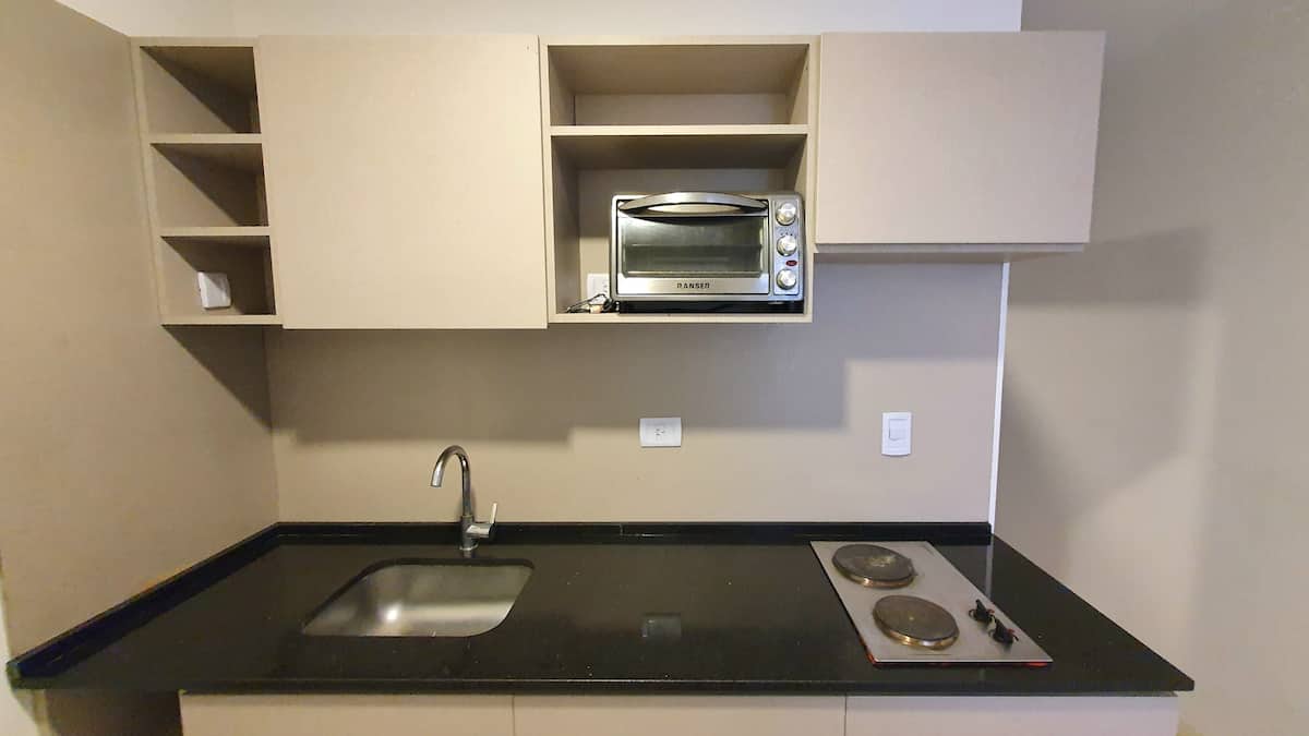 Monoambiente de 1 ambiente con balcón, en edificio con seguridad y encargado. Incluye kitchenette americana totalmente equipada, baño privado con bañera, cama Queen, TV LED y aire acondicionado. En la terraza tiene pileta y hay portería con seguridad 24 horas. Se informa que está próximo al subte y al Metrobus.