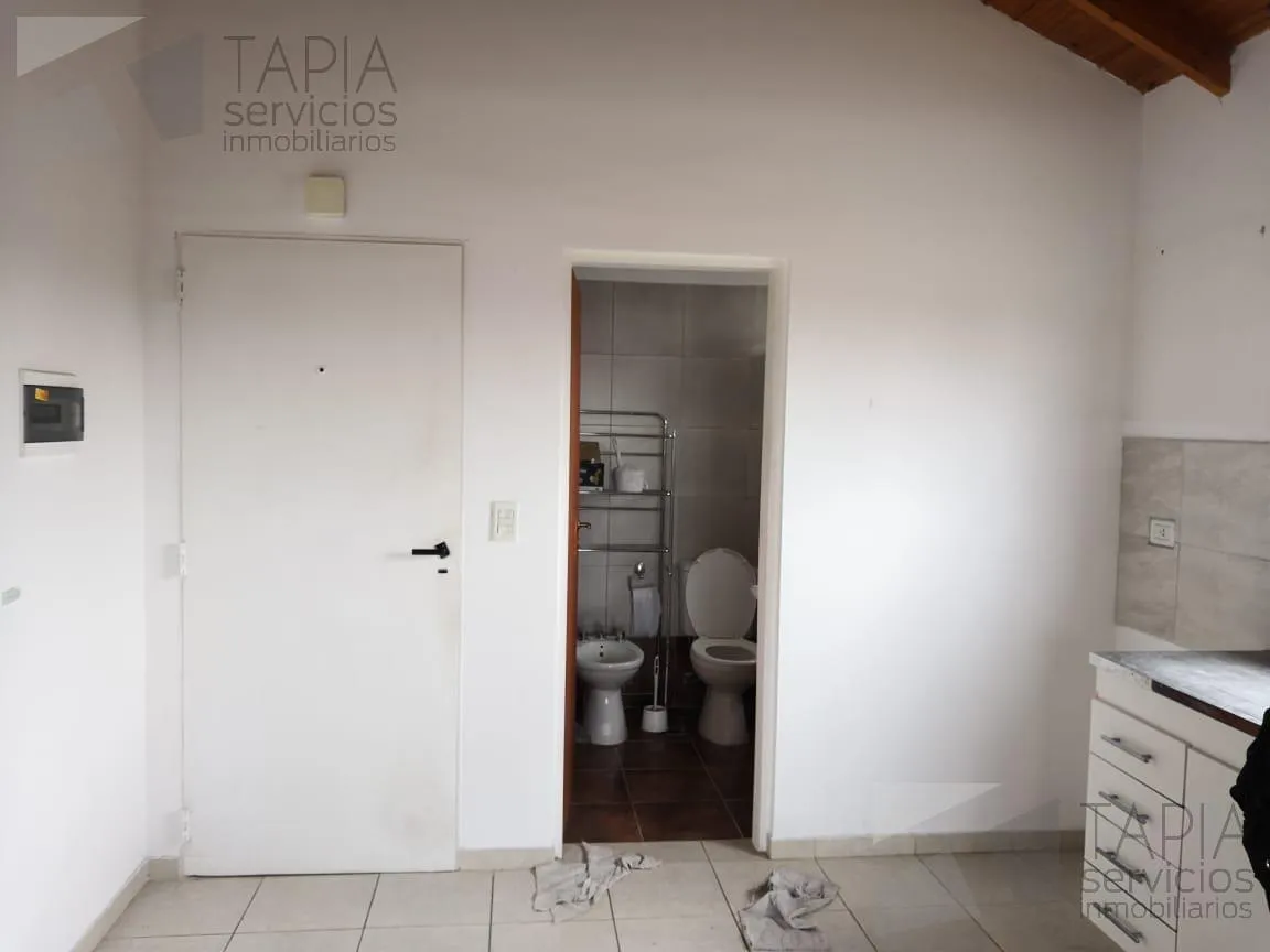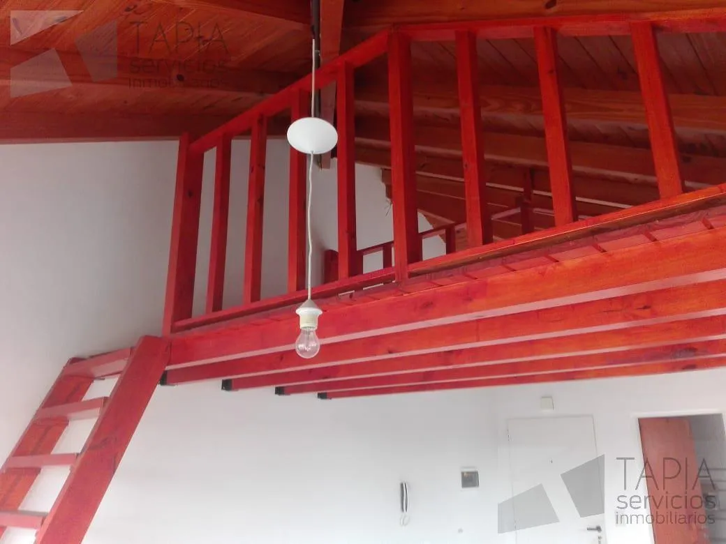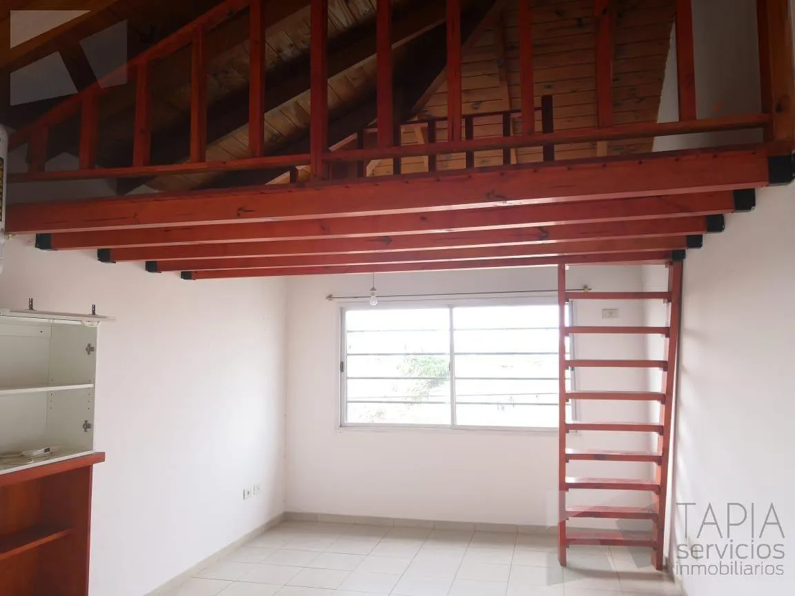 Departamento monoambiente de 1 ambiente con entrepiso en segundo piso por escalera, en Martin Coronado, Tres de Febrero. Cuenta con mueble bajo mesada y techos altos de madera; el ambiente tiene entrepiso con escalera. Tiene baño completo con ducha y ventilación externa, y conexión para lavarropas. Es todo eléctrico y las expensas incluyen agua. El edificio tiene 2 pisos y permite mascotas y uso profesional; la unidad presenta ventana en la cocina y ventanal en el estar. Ubicado en Remedios de E