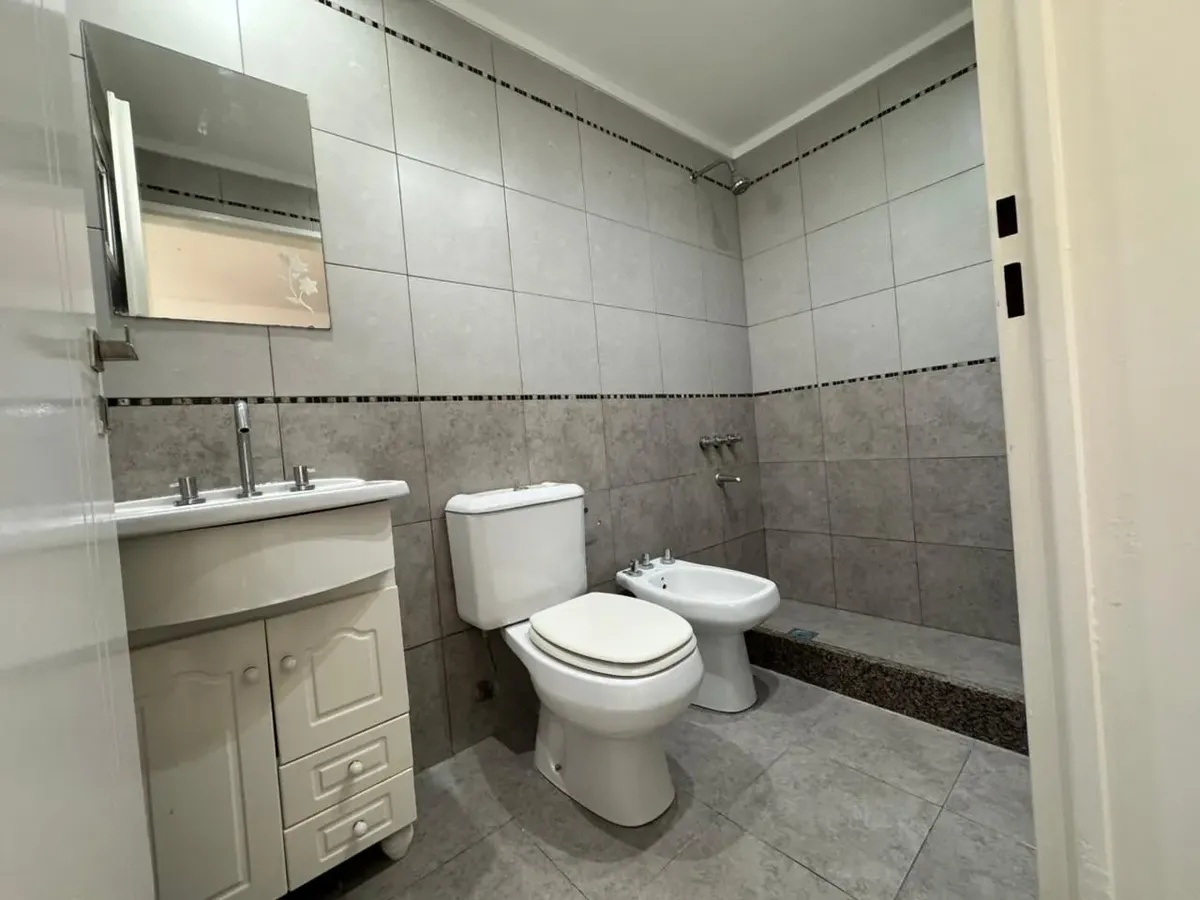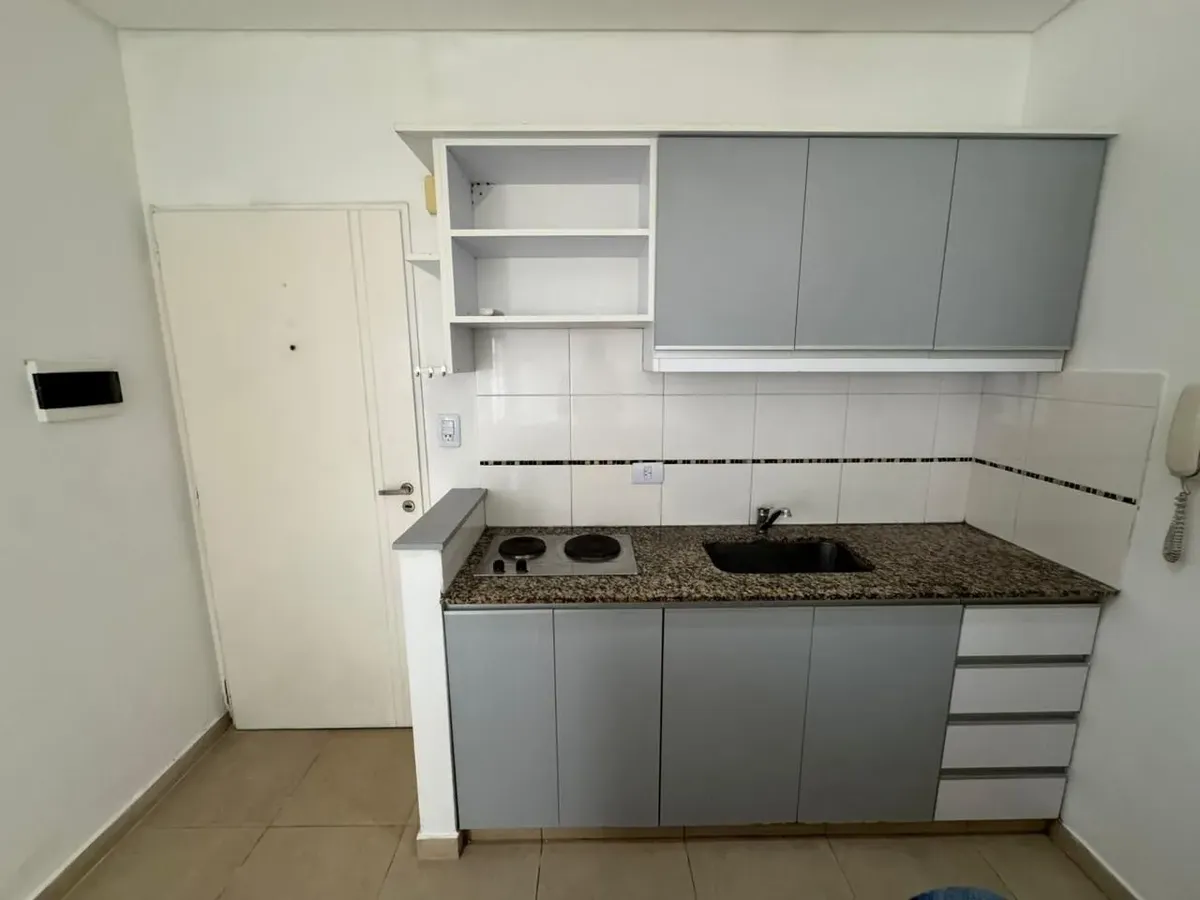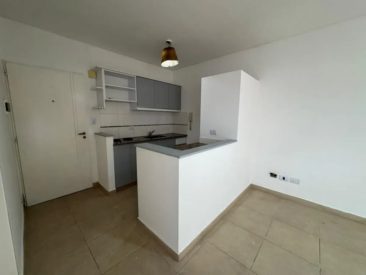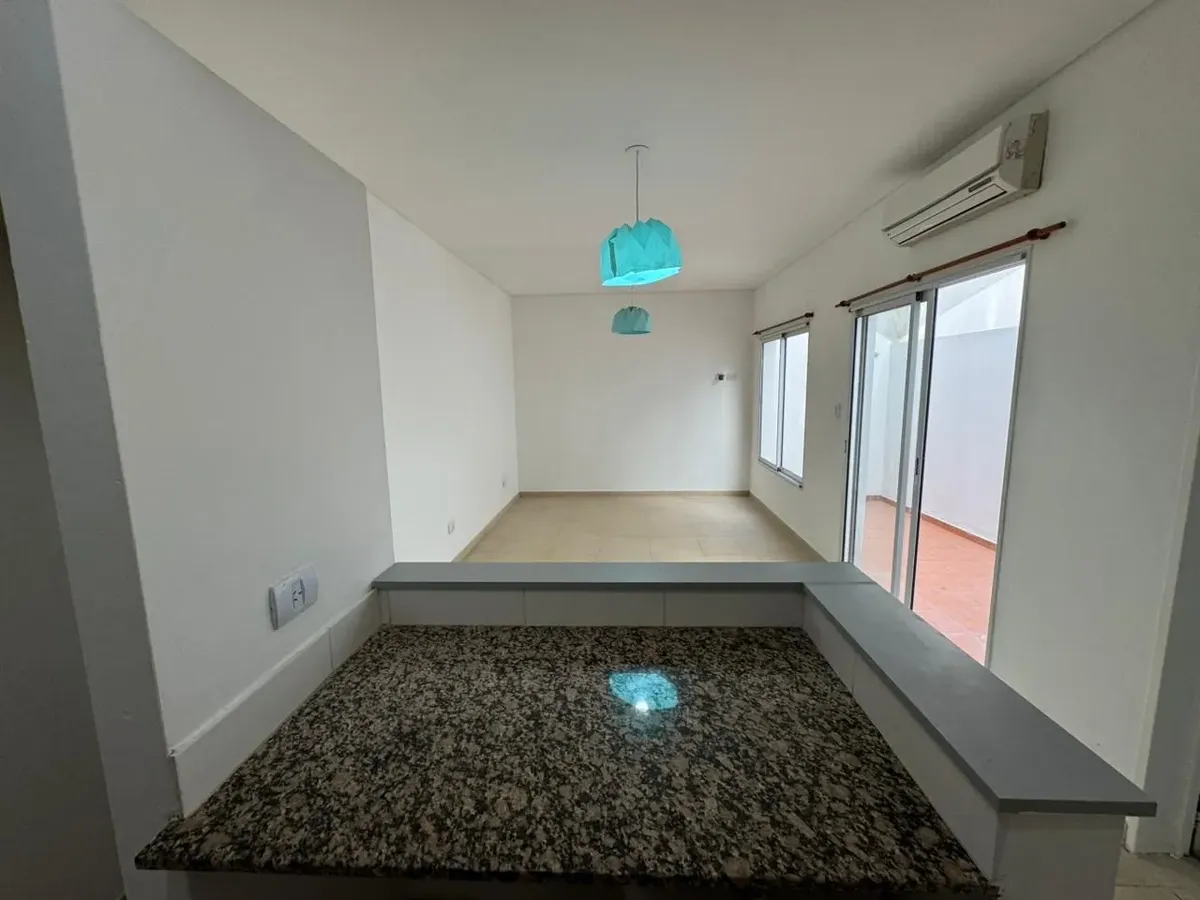 Monoambiente en Santos Lugares, Tres de Febrero. Cocina integrada con bajo mesada de granito, alacena y barra desayunador. Acceso desde la cocina a un patio mediante puerta corrediza. Baño moderno con mueble bajo bacha y griferías. Condiciones: alquiler + tasa por servicios generales + EDENOR + expensas + seguro contra incendio, ajuste trimestral por ICL y contrato por 2 años; acepta mascota.
