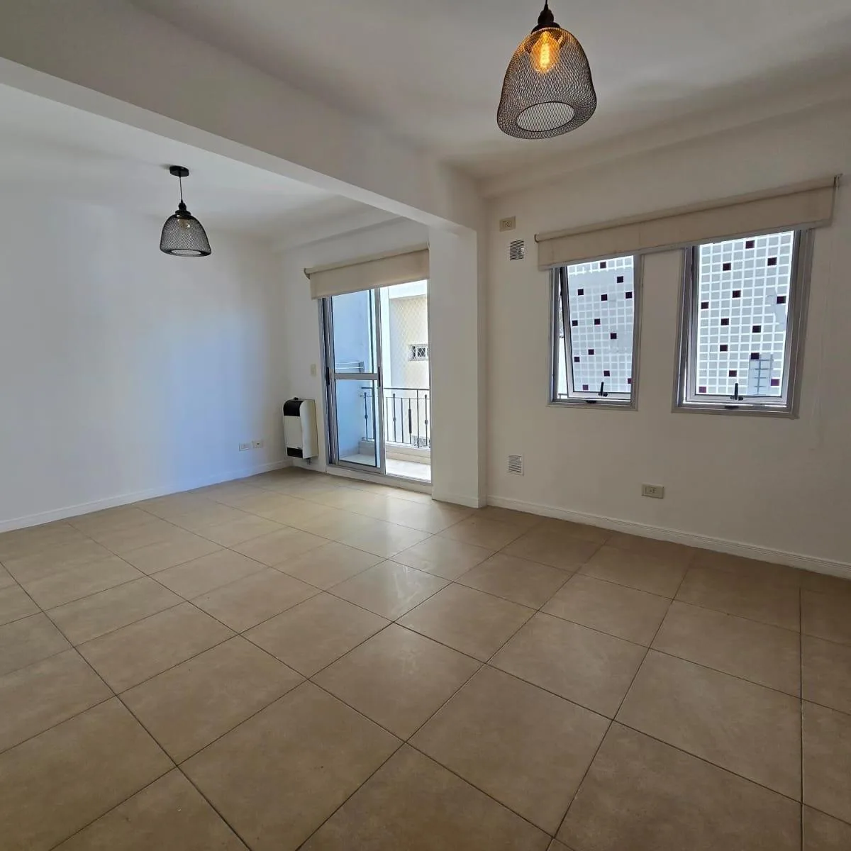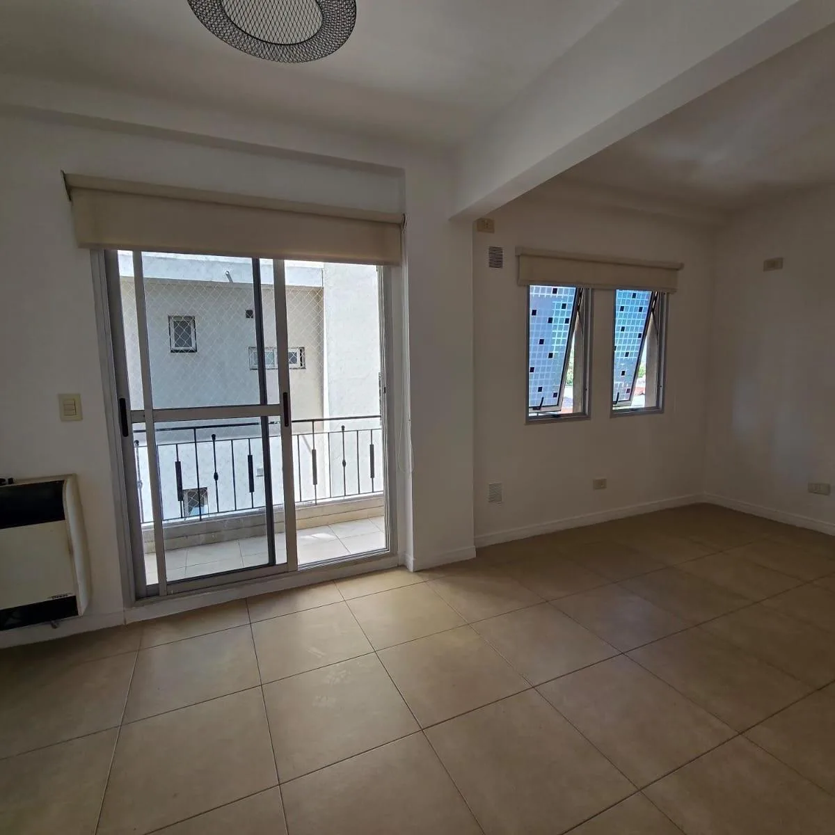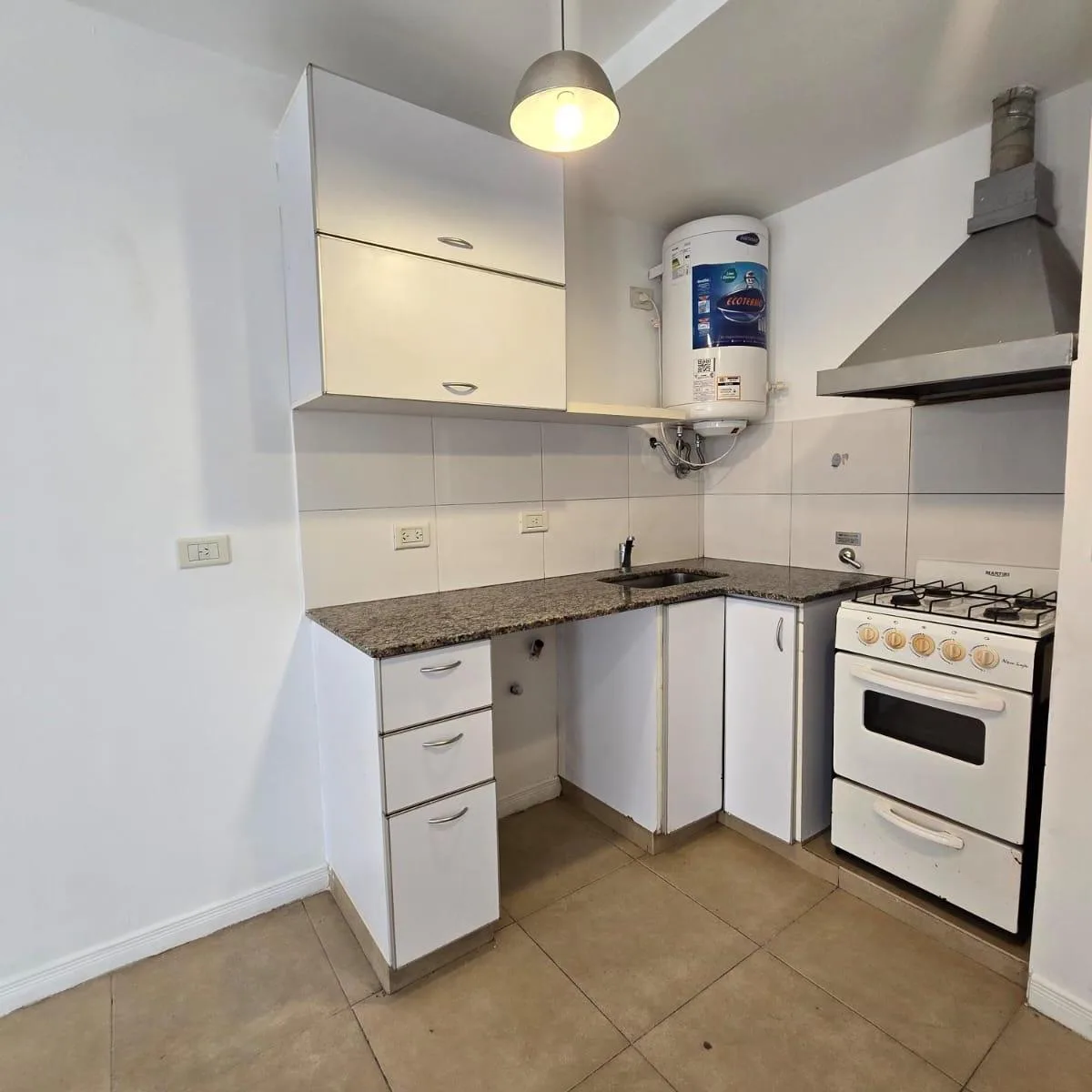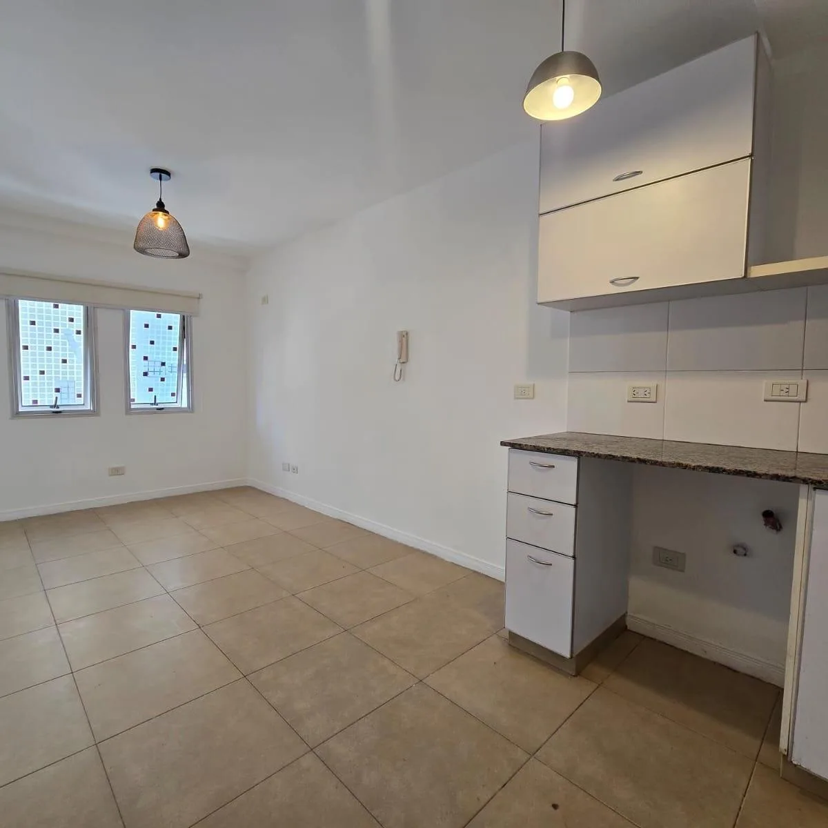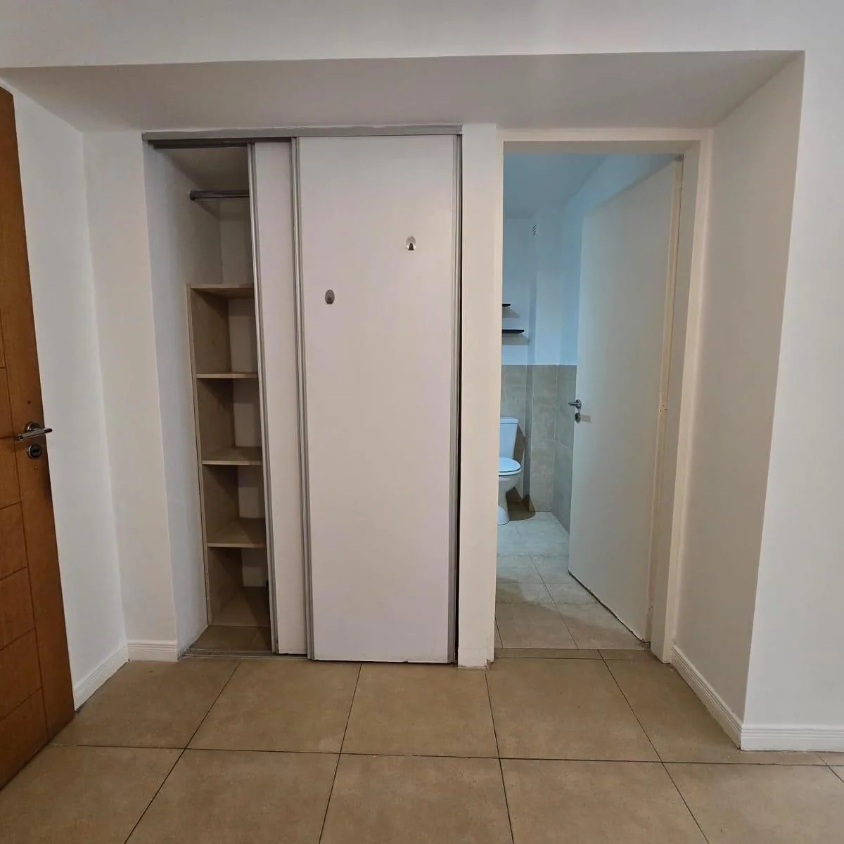 Departamento monoambiente de alquiler en Caseros, con placard y balcón semicubierto con red de protección. Cocina con termotanque eléctrico y artefacto de cocina a gas natural, con muebles de alacena y bajo mesada. Baño completo y calefacción por estufa a gas de tiro balanceado. El edificio cuenta con SUM y pileta.