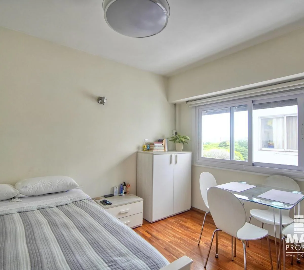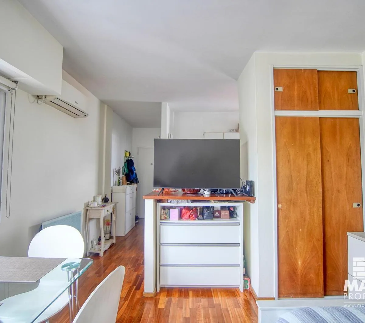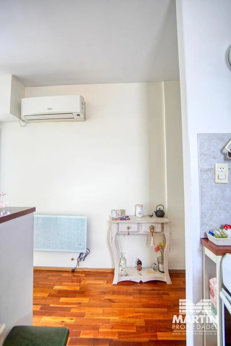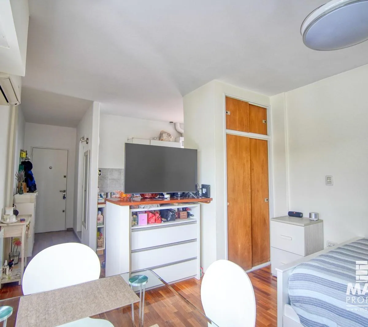 Departamento de 1 ambiente de 25 m², frente a la quinta presidencial, en Olivos. Incluye cocina integrada con barra desayunadora, baño completo y terraza en común. Indica expensas bajas con ajuste trimestral por IPC desde abril de 2026 y contrato a partir del 01/05/2026. Medidas aproximadas y a título informativo.