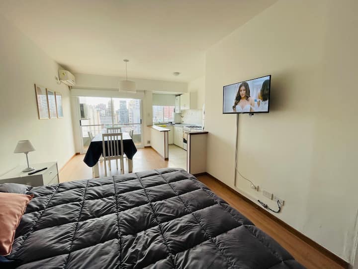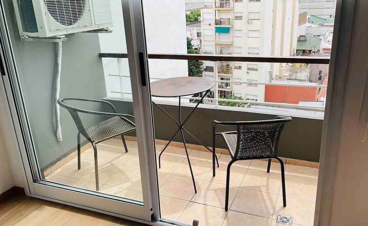 Monoambiente en Villa Crespo, 8vo piso, con balcón y vista abierta al contrafrente. Cocina integrada con equipamiento completo. Aire acondicionado frío/calor. Ubicado a 2 cuadras de Av. Corrientes y a 6 cuadras de las estaciones de subte Malabia o Dorrego (Línea B), y cerca del Metrobus de Av. Juan B Justo.
