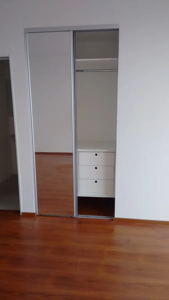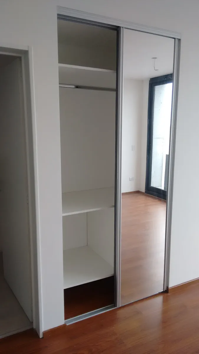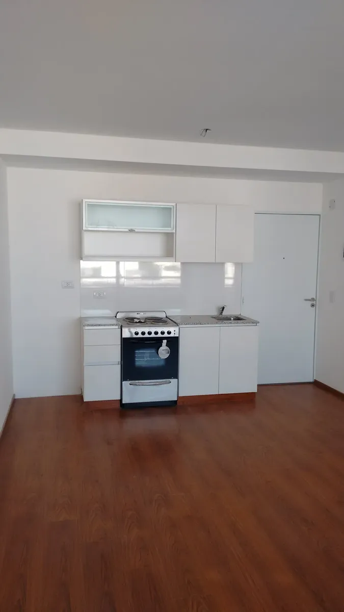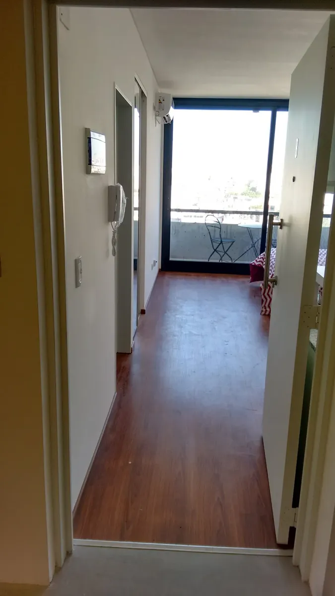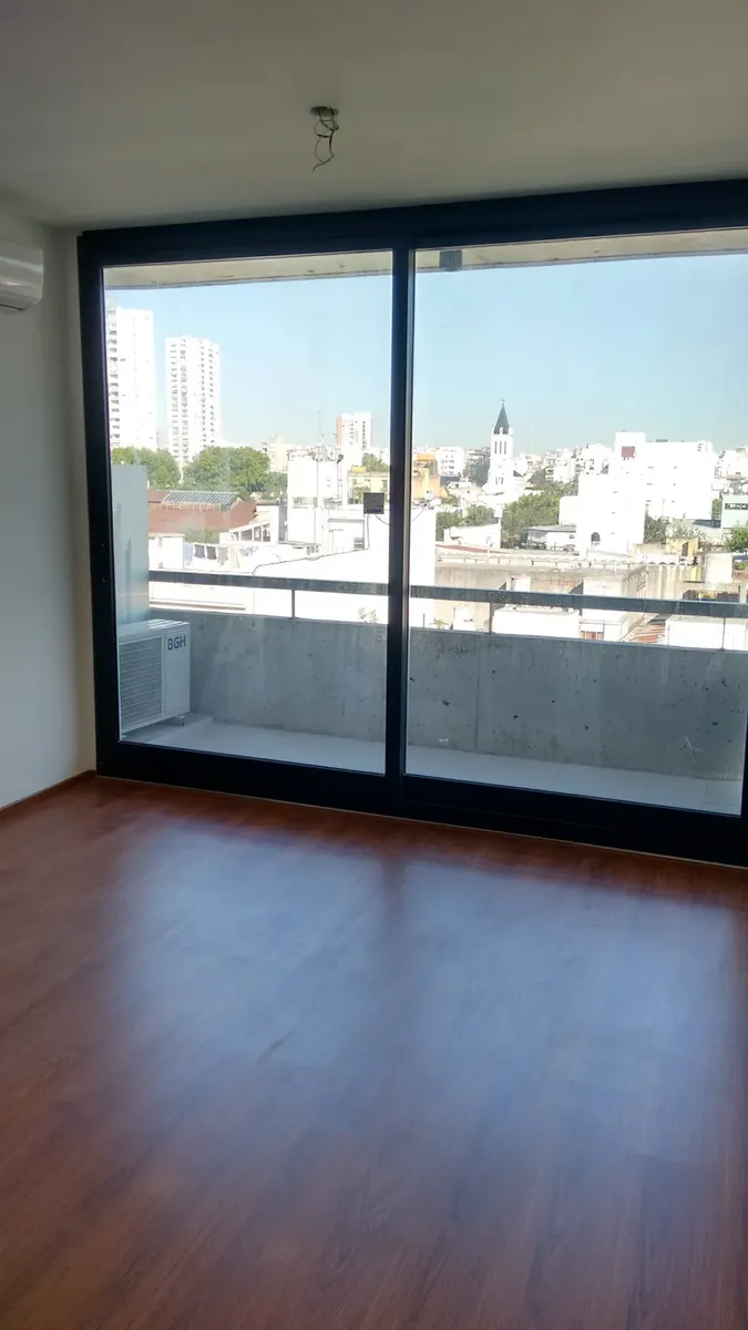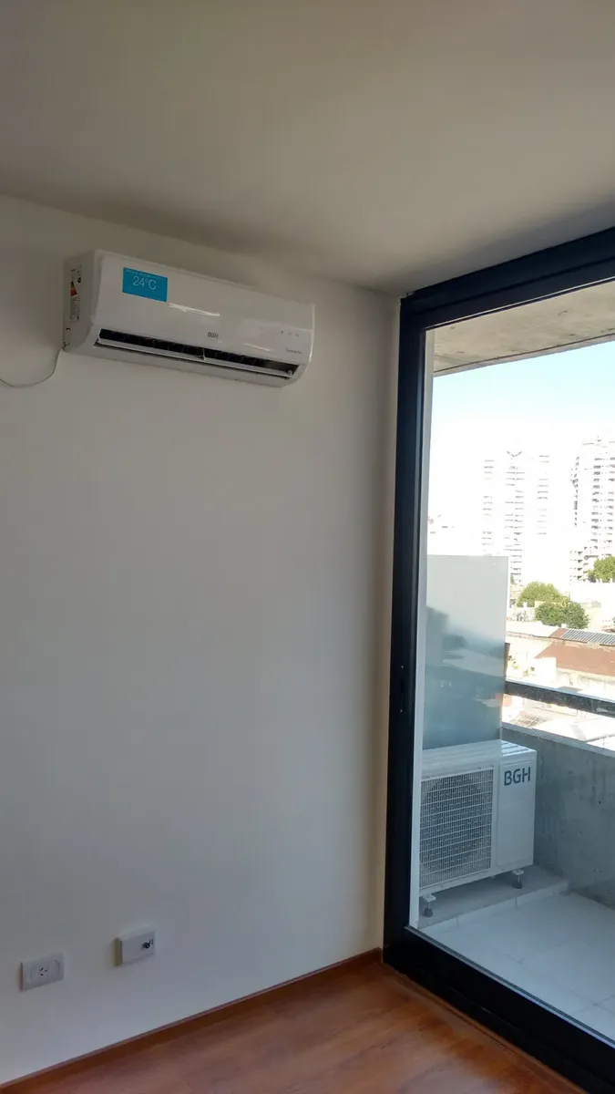 Departamento monoambiente de 28 m² cubiertos, en un edificio de varios pisos con acceso sobre una avenida principal. Cuenta con ambiente integrado con cocina, piso de madera y ventanales de aluminio corredizos con salida a balcón al frente con vista a la ciudad. La cocina tiene muebles bajo y sobre mesada, artefacto de cocina y espacio para heladera. El baño está dividido en sector de ducha, inodoro y bidet, y sector de lavabo con espejo. Incluye instalación de aire acondicionado y placares con