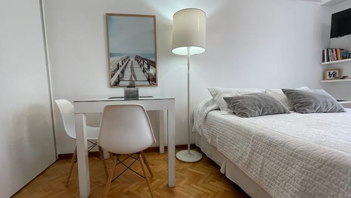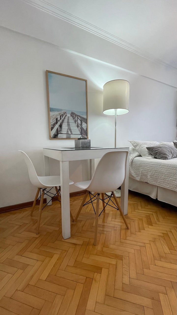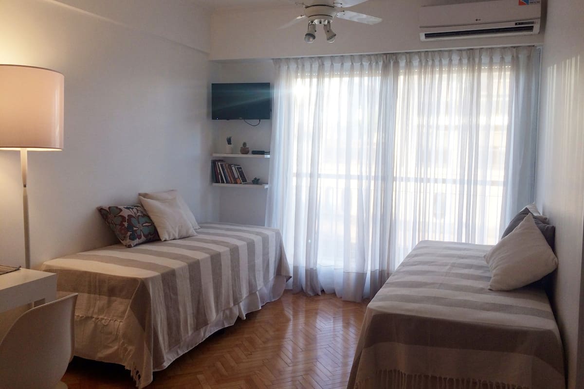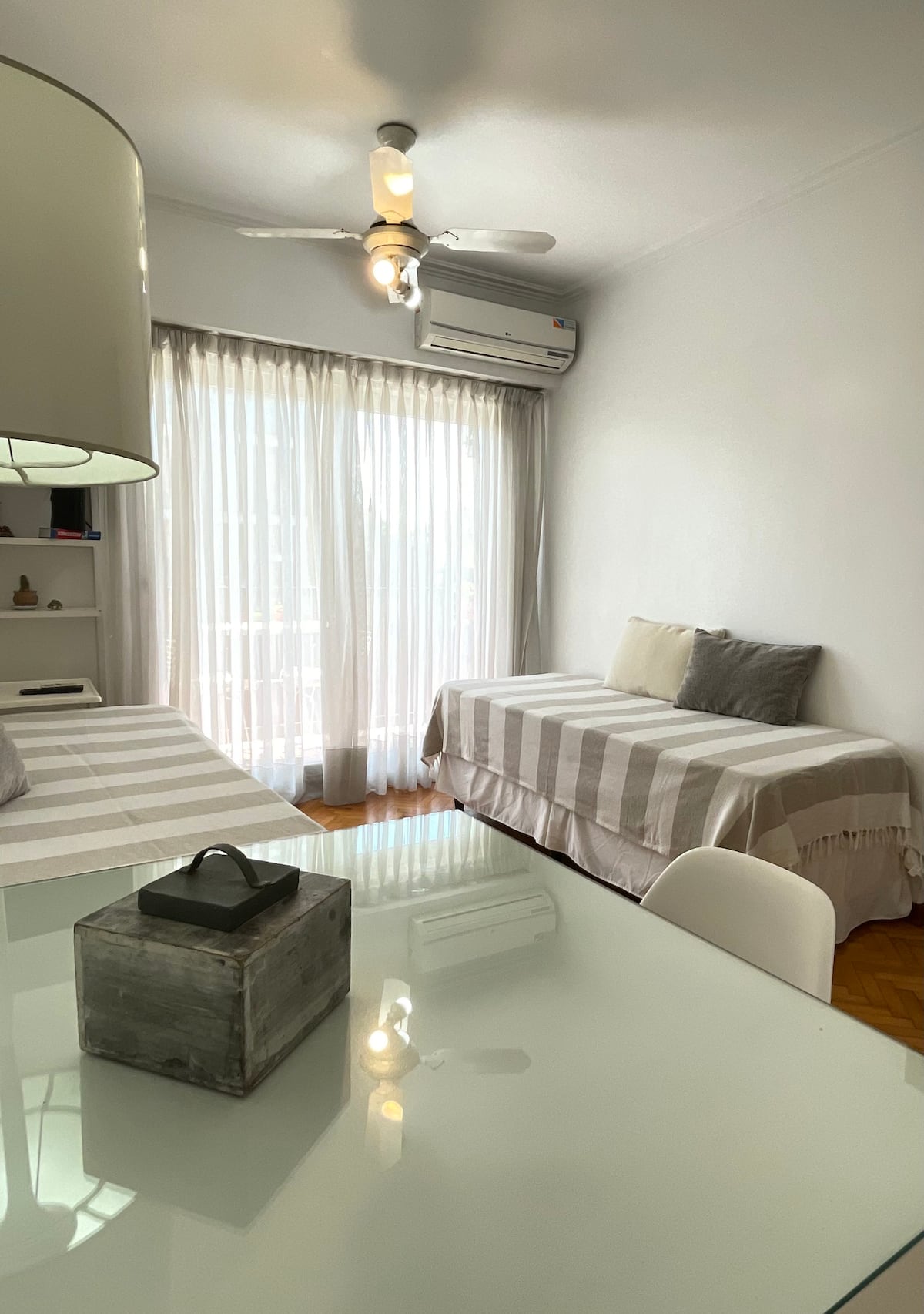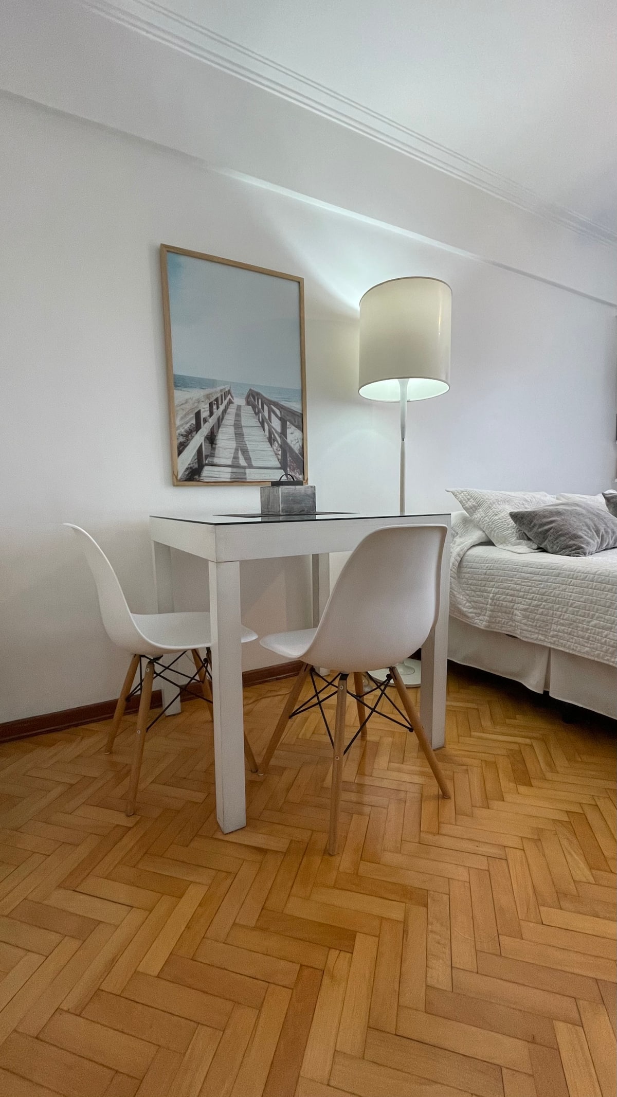 Departamento tipo estudio en excelente estado. Ventila al balcón con vista a Av. Córdoba, con mesa y sillas. Incluye TV LED de 24 pulgadas con cable y Wi‑Fi, aire acondicionado frío/calor, heladera y cocina eléctrica con horno, más baño completo. Opcional de 2 camas individuales o 1 cama de 2 plazas; ventanas con doble vidriado y cortinas blackout.