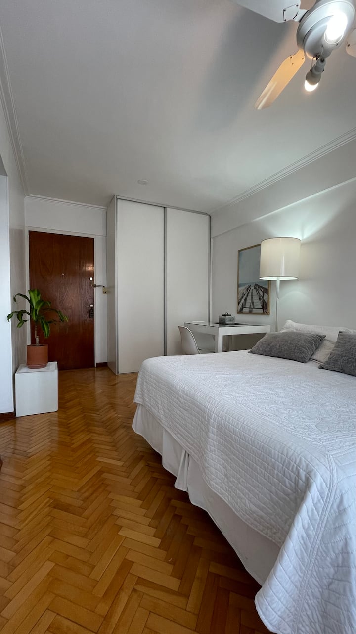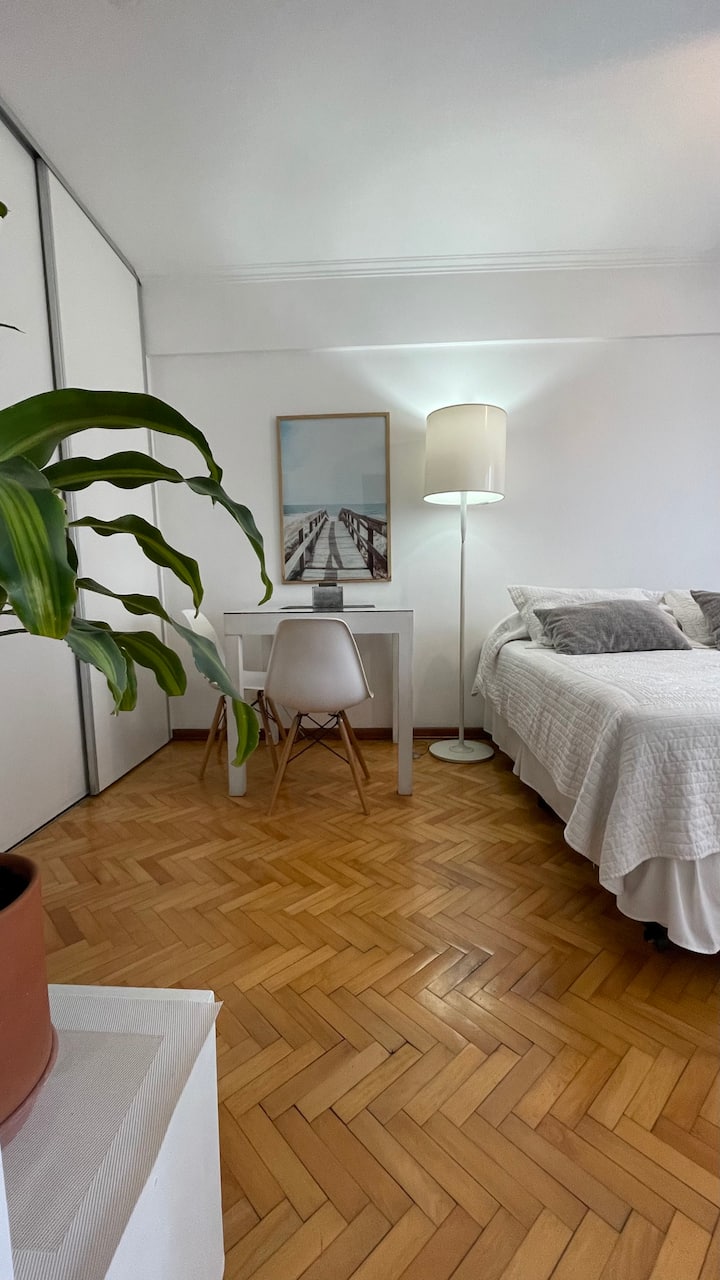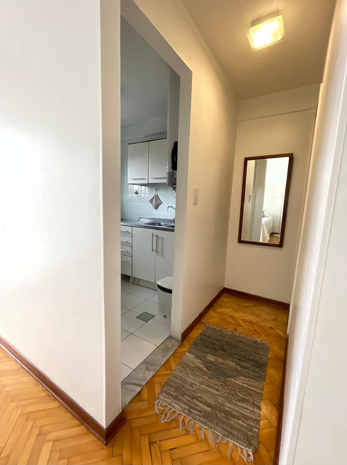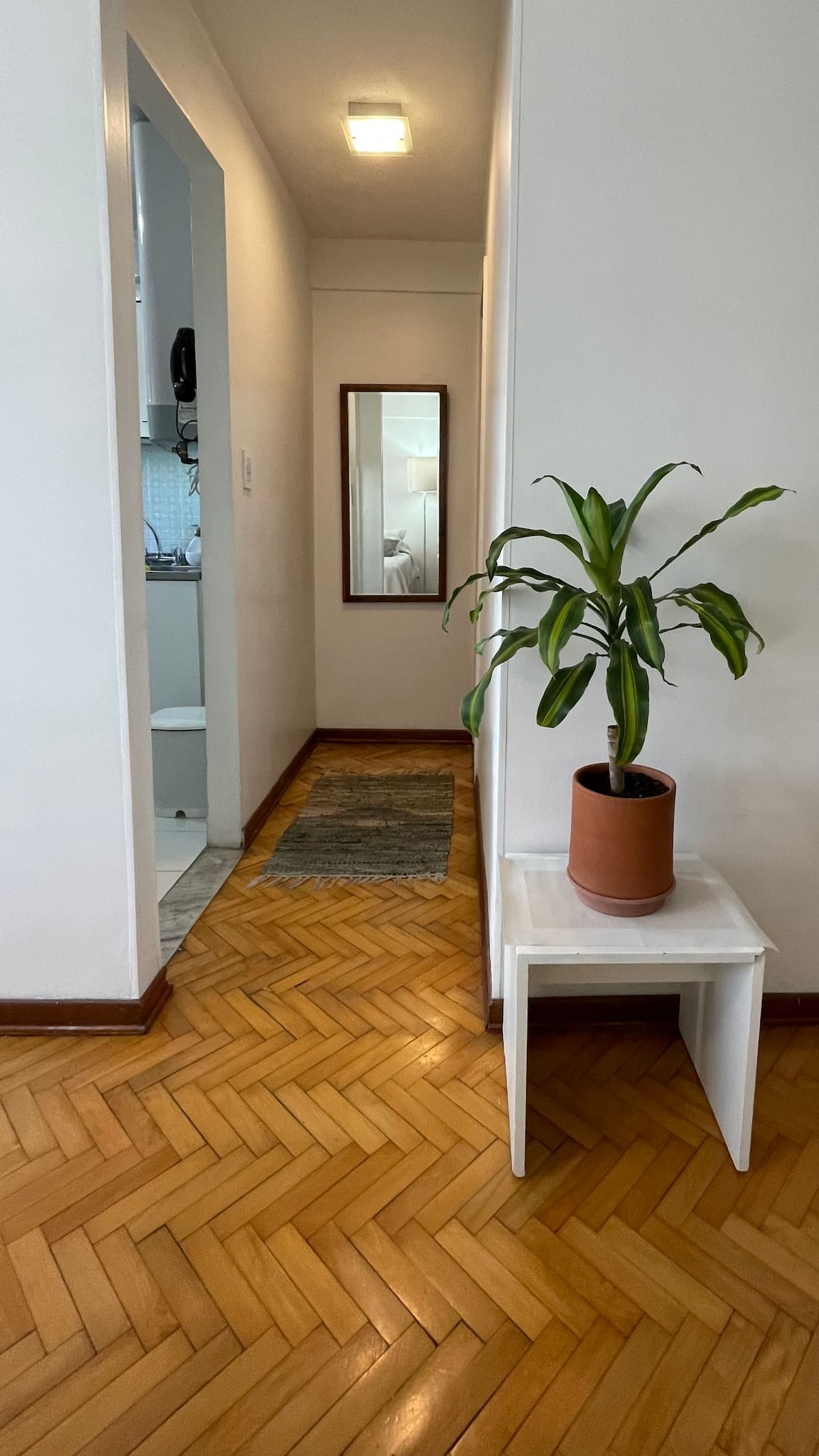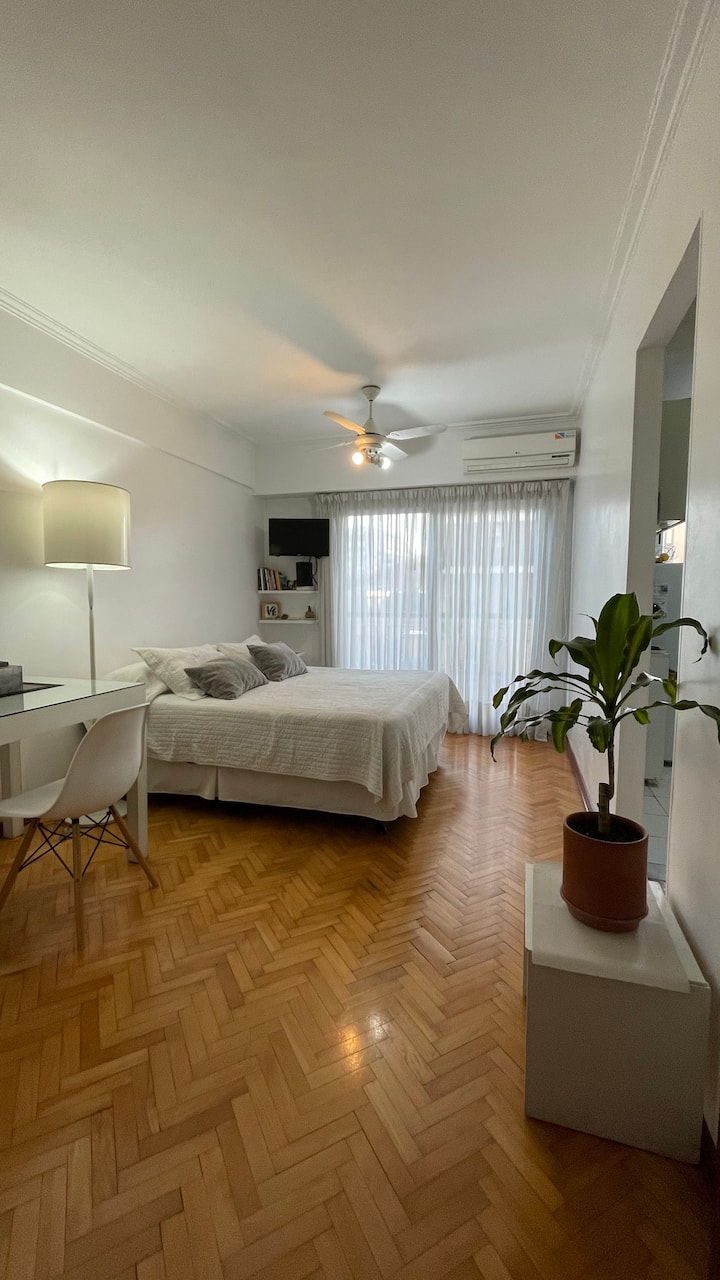 Departamento tipo estudio en excelente estado. Ventila al balcón con vista a Av. Córdoba, con mesa y sillas. Incluye TV LED de 24 pulgadas con cable y Wi‑Fi, aire acondicionado frío/calor, heladera y cocina eléctrica con horno, más baño completo. Opcional de 2 camas individuales o 1 cama de 2 plazas; ventanas con doble vidriado y cortinas blackout.