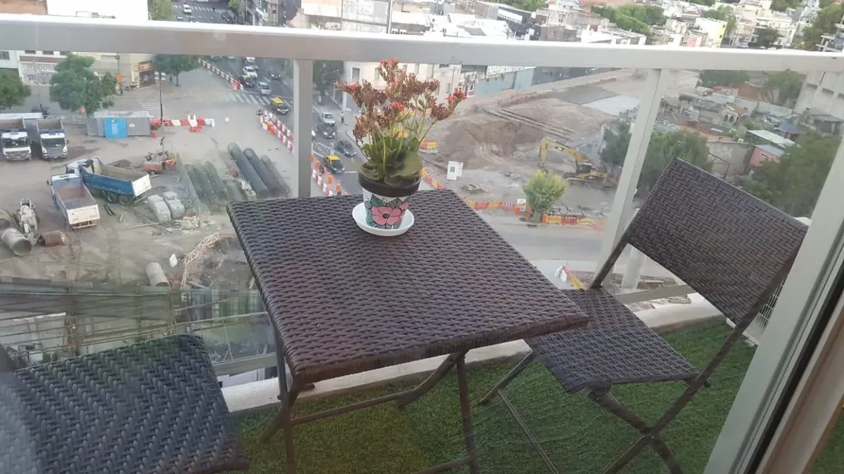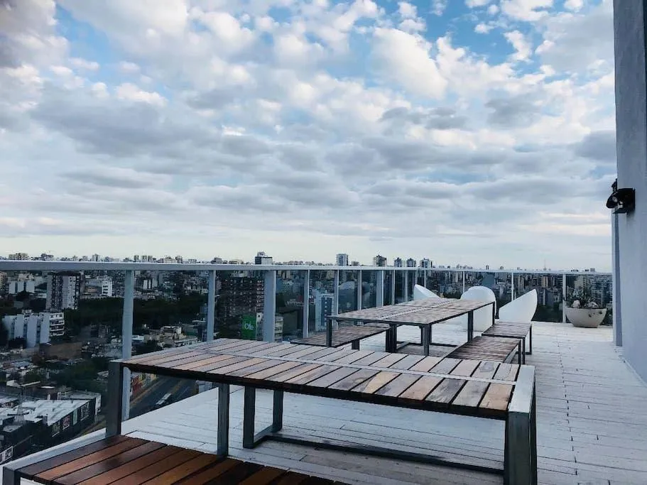 Monoambiente de alquiler amoblado en Palermo Hollywood. Cuenta con cocina americana con muebles bajo mesada, alacenas y salida al balcón, placard empotrado y 1 baño completo. Dispone de aire acondicionado frío/calor, agua caliente central, carpintería de aluminio y cortinas Roller Black Out, además de TV Smart y heladera. La unidad incluye equipamiento de cocina con microondas, tostadora y cafetera, y mesas y sillas en el balcón. El edificio tiene seguridad 24 horas, hall de doble altura, 18 pis