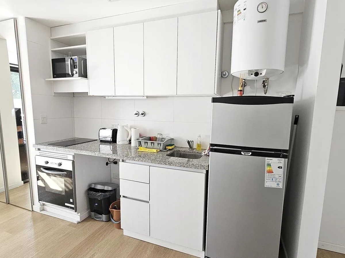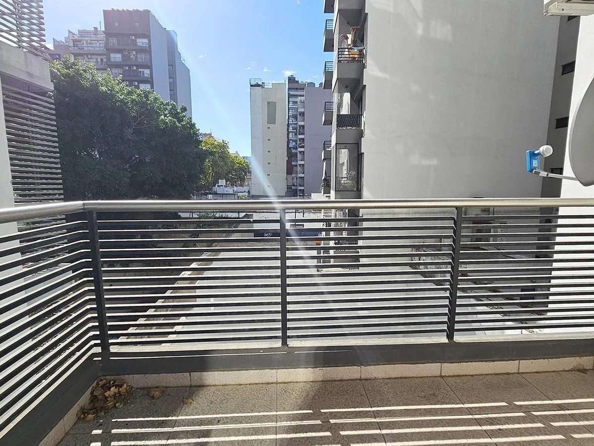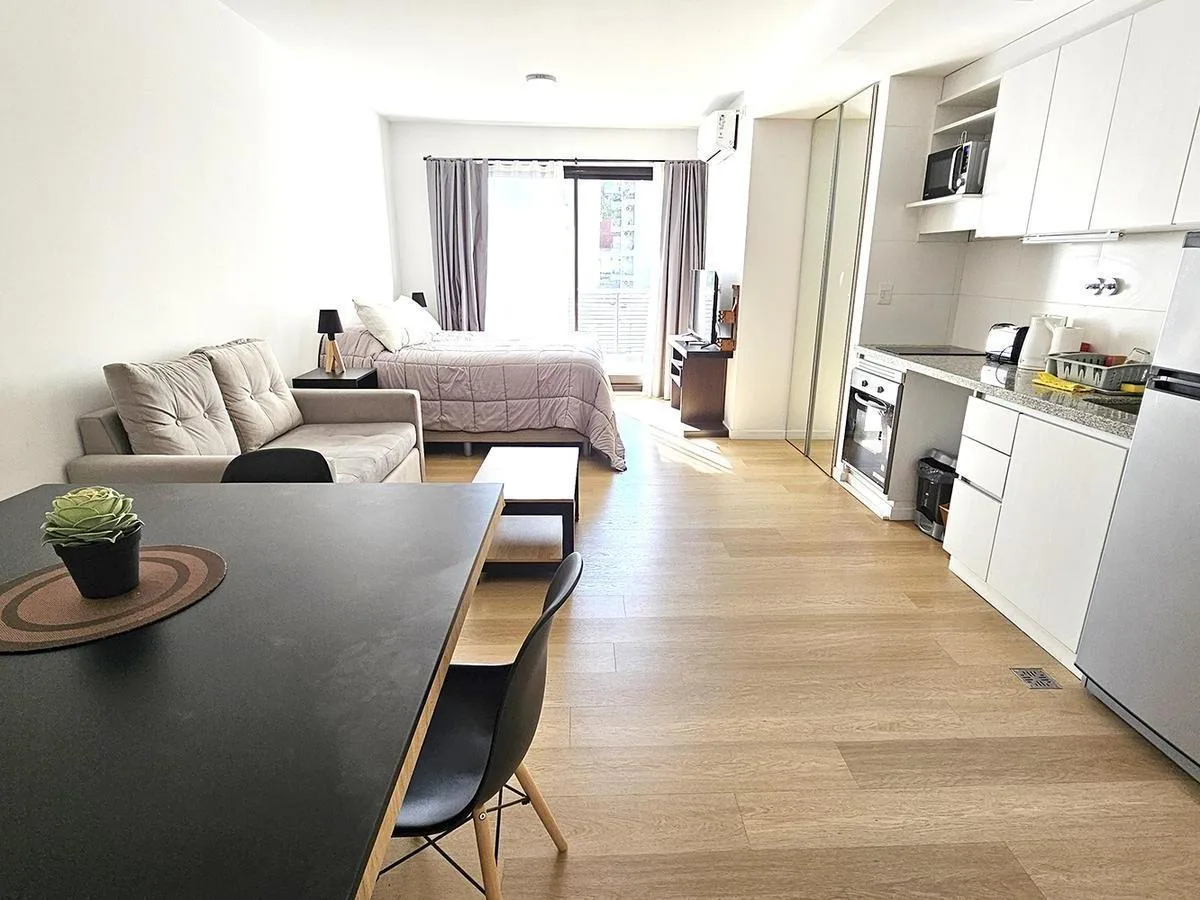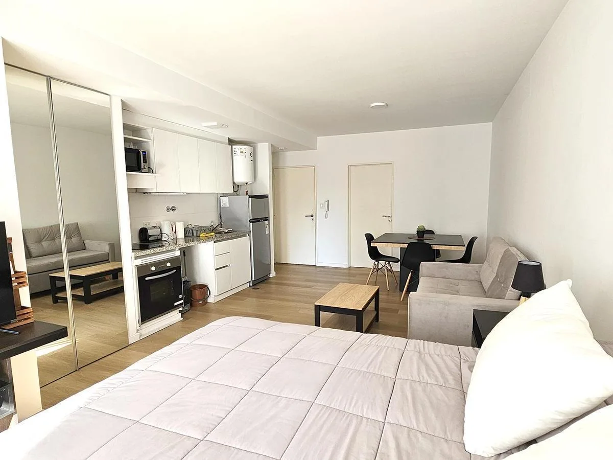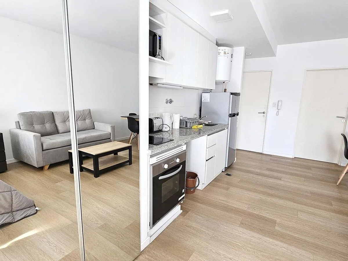Monoambiente al contrafrente con balcón, con mueble de cocina bajo mesada y alacenas. Cuenta con horno empotrado y anafe de 2 hornallas, conexión para lavarropas y pisos vinílicos. Baño completo, placard con puertas espejadas y agua caliente por termotanque individual. Se entrega con aire acondicionado frío-calor y cortinas blackout. El edificio tiene pileta chica con solarium, SUM completo, parrillas y gym.