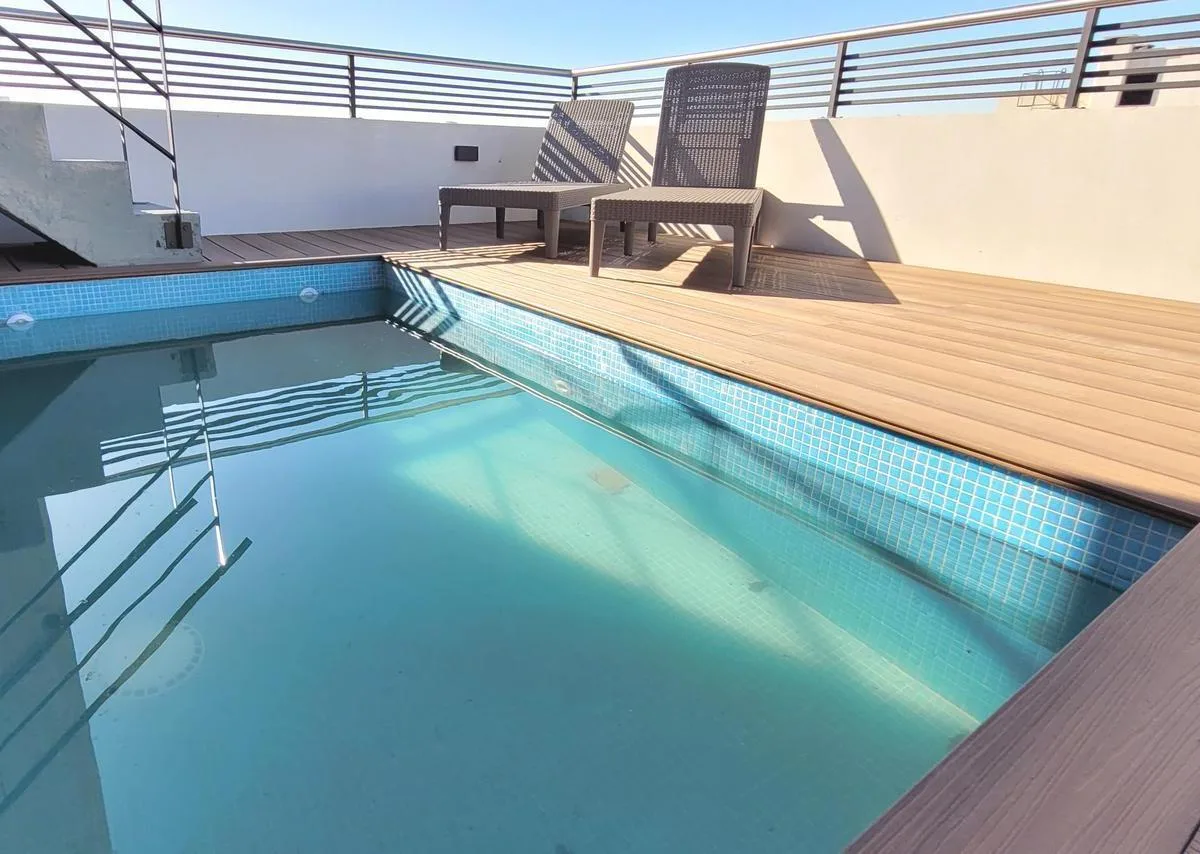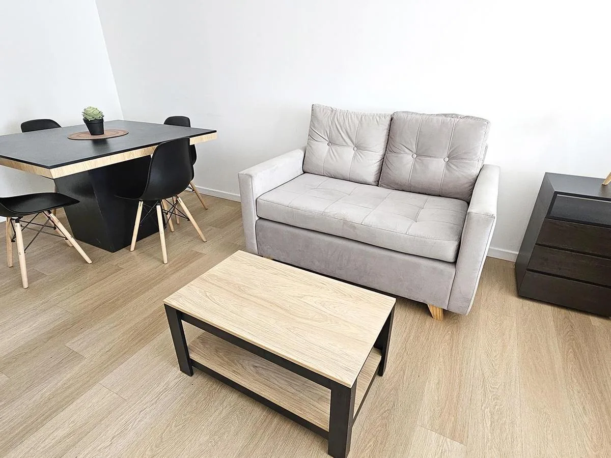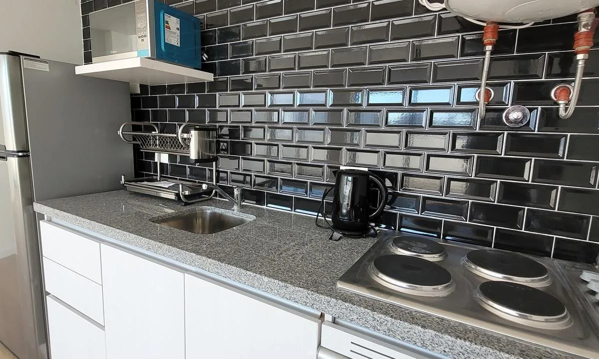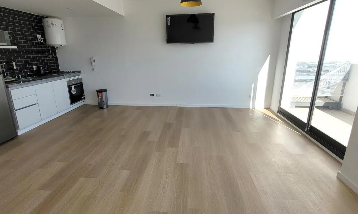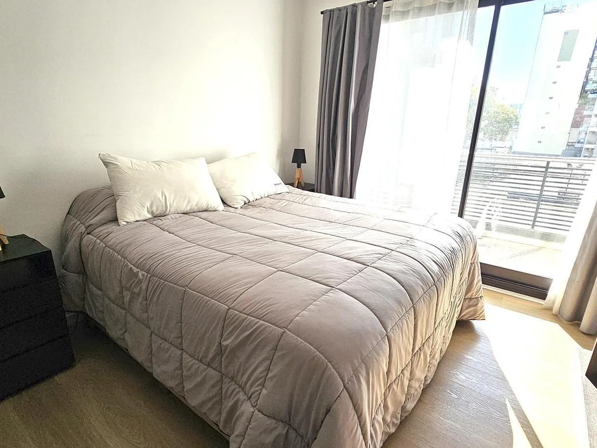 Monoambiente al contrafrente con balcón, con mueble de cocina bajo mesada y alacenas. Cuenta con horno empotrado y anafe de 2 hornallas, conexión para lavarropas y pisos vinílicos. Baño completo, placard con puertas espejadas y agua caliente por termotanque individual. Se entrega con aire acondicionado frío-calor y cortinas blackout. El edificio tiene pileta chica con solarium, SUM completo, parrillas y gym.