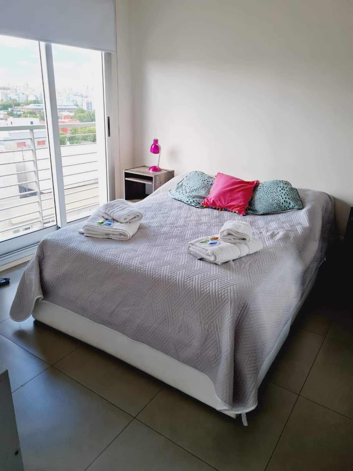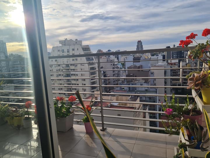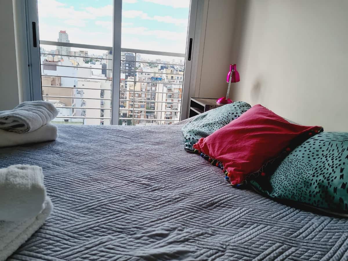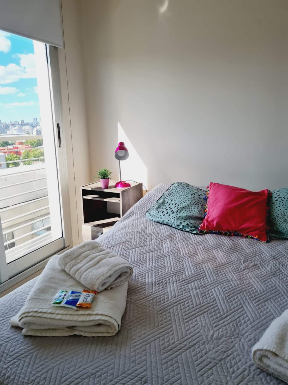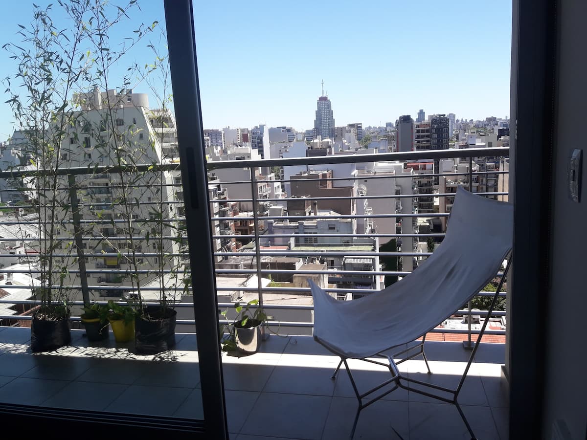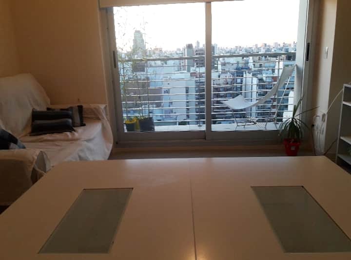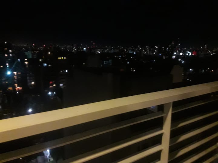 Departamento tipo torre en Villa Crespo, en el piso 12, con balcón y vista panorámica. Incluye pileta climatizada, gimnasio, SUM, sector de juegos, laundry, mesas de pool y ping pong, y seguridad 24 horas. Está equipado con cama doble, aire acondicionado, cortinas black out, TV inteligente con Netflix y cable, WiFi, cocina con horno y microondas, cafetera y vajilla. Se solicita DNI o pasaporte al ingreso en el edificio.