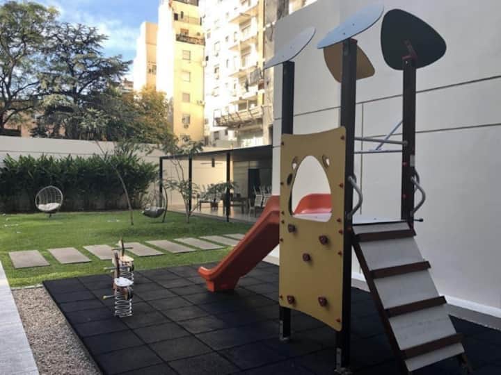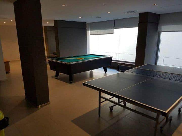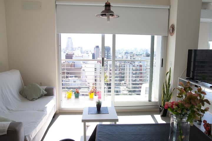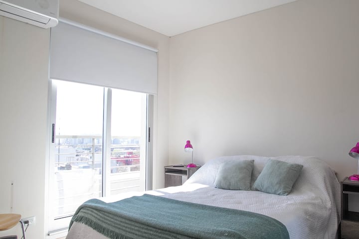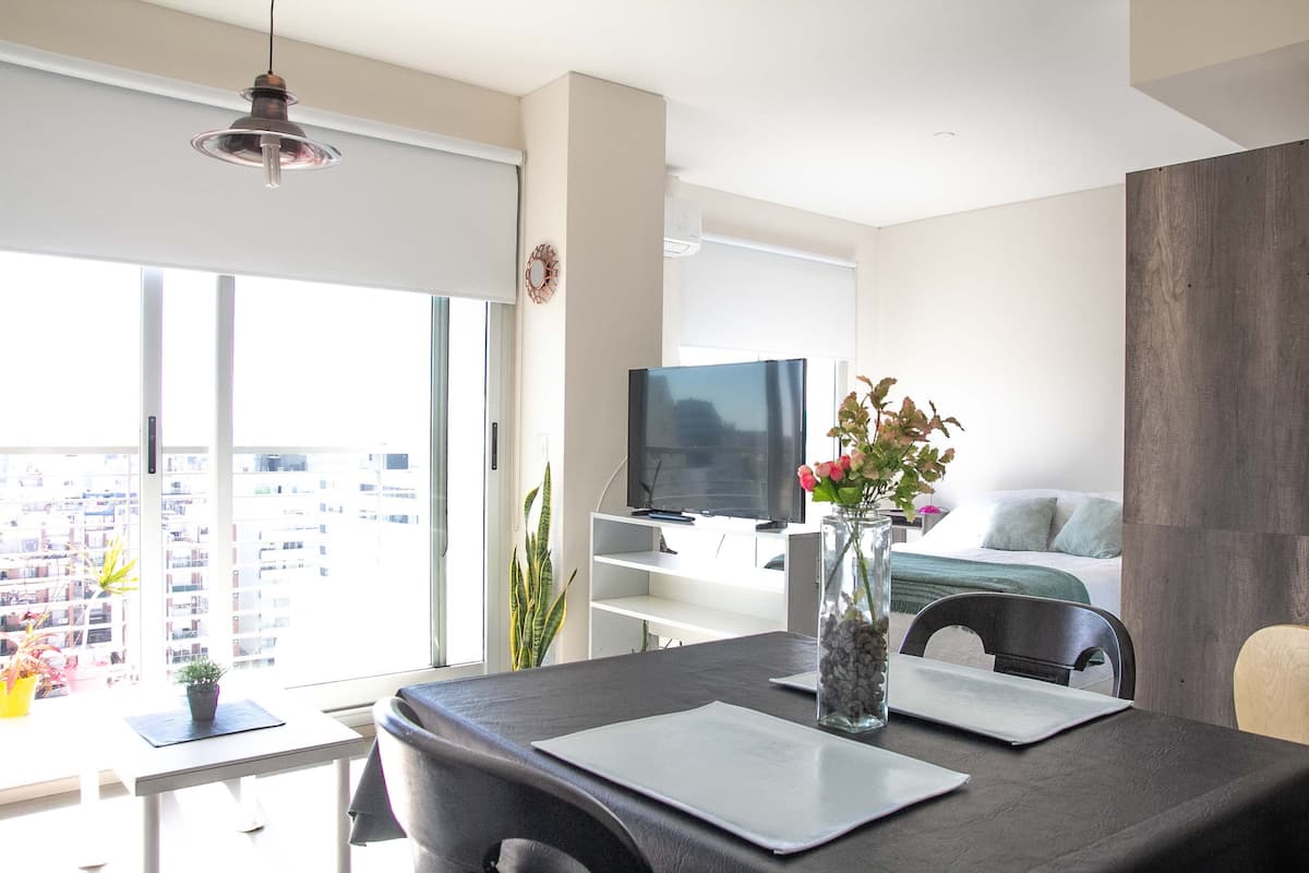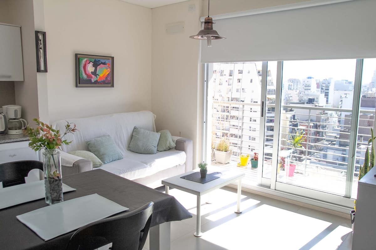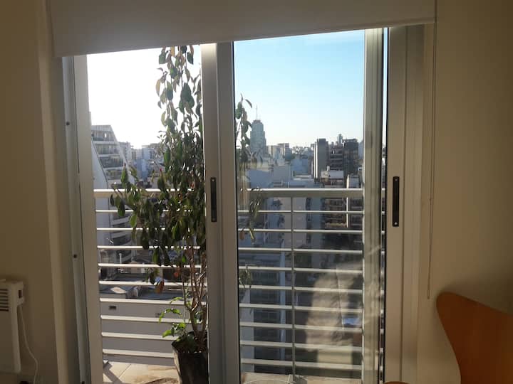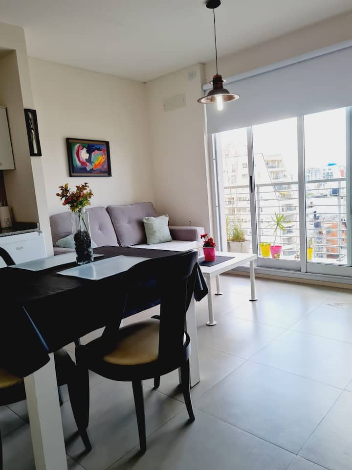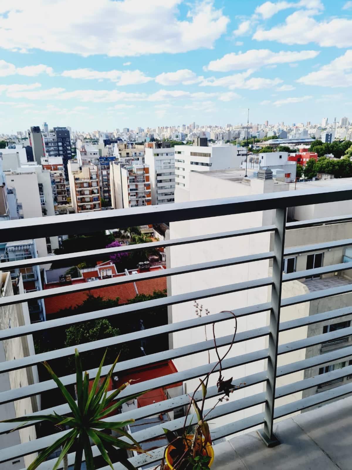 Departamento tipo torre en Villa Crespo, en el piso 12, con balcón y vista panorámica. Incluye pileta climatizada, gimnasio, SUM, sector de juegos, laundry, mesas de pool y ping pong, y seguridad 24 horas. Está equipado con cama doble, aire acondicionado, cortinas black out, TV inteligente con Netflix y cable, WiFi, cocina con horno y microondas, cafetera y vajilla. Se solicita DNI o pasaporte al ingreso en el edificio.