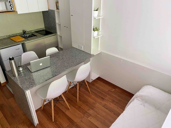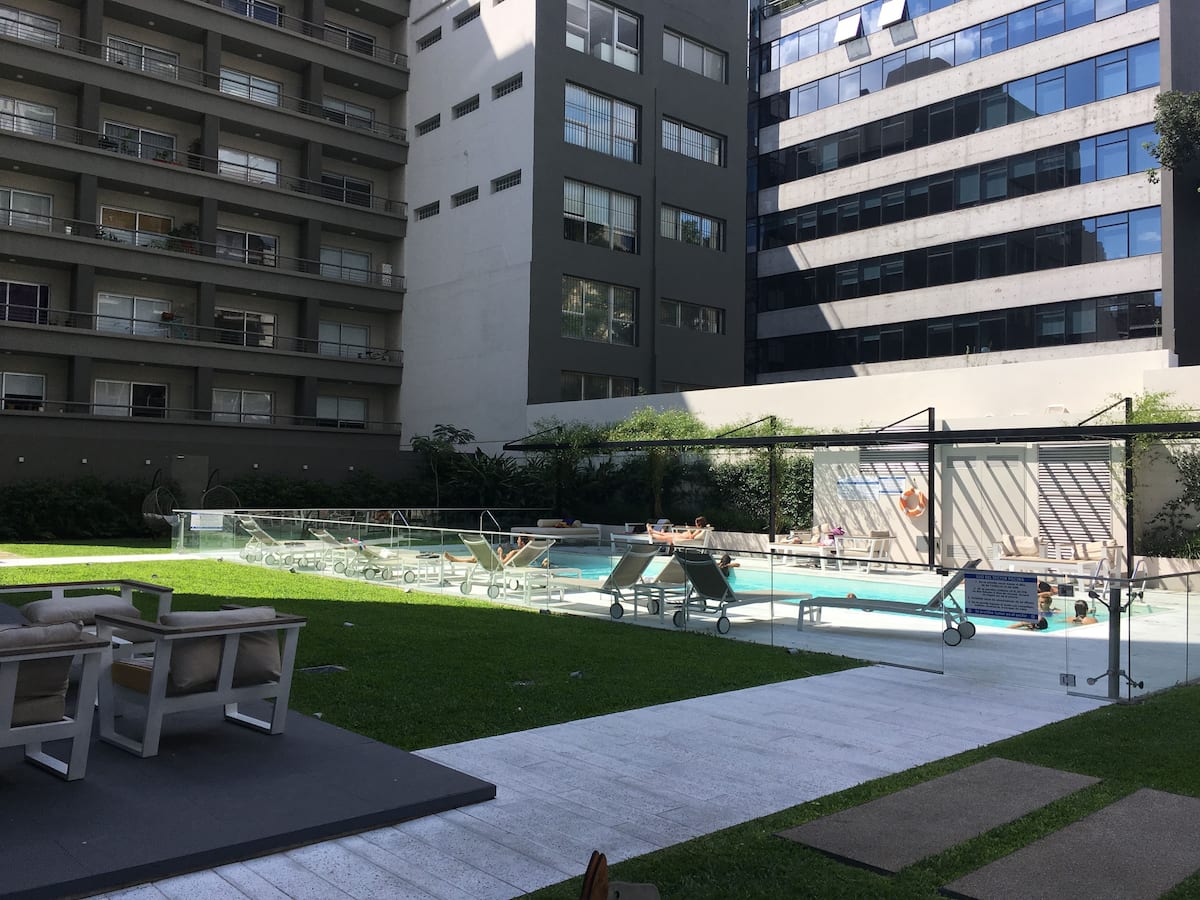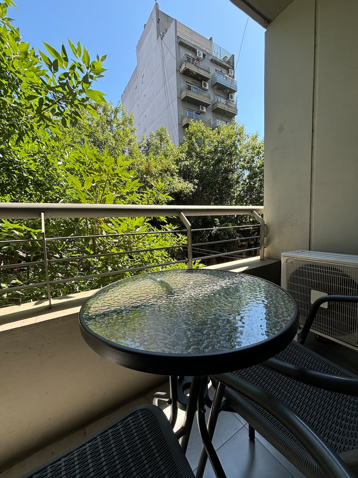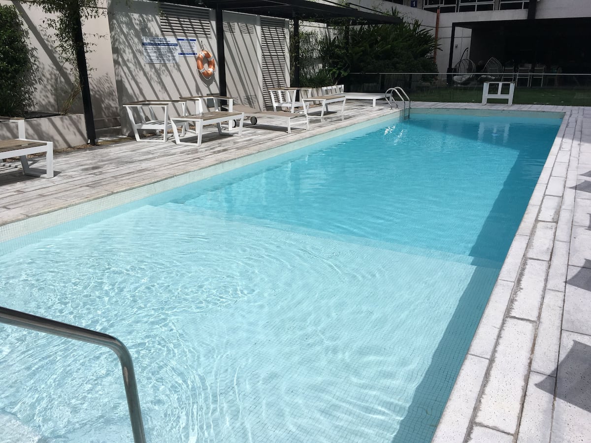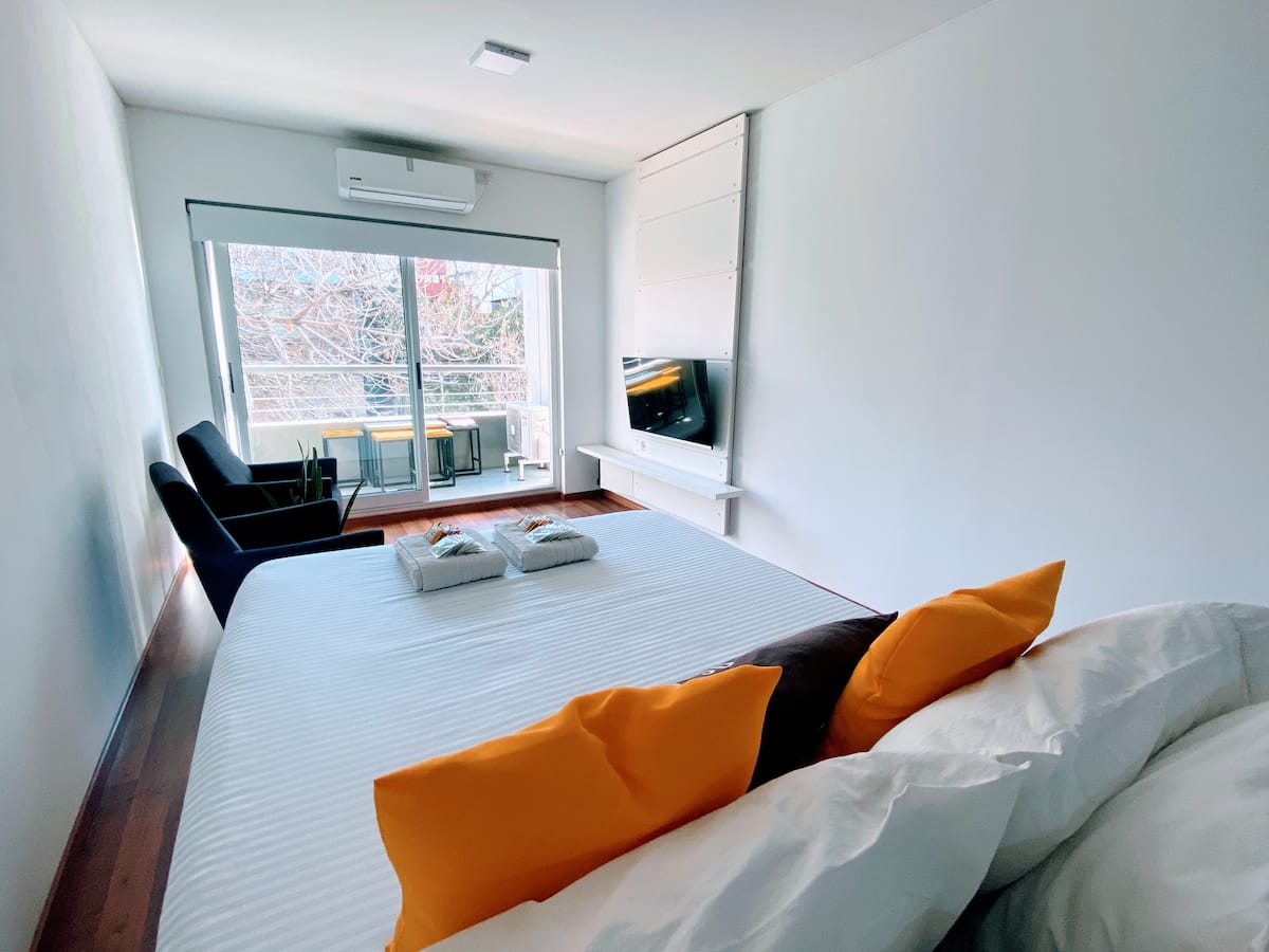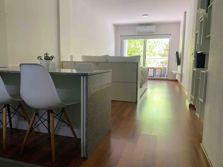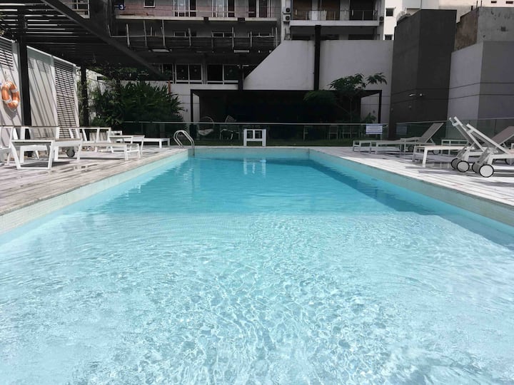 Monoambiente de 34 m² en planta a la calle con balcón. Cuenta con aire acondicionado de sistema smart, piso con doble cama y cama individual pequeña, y cocina con horno eléctrico, anafes, cafetera, tostadora y pava eléctrica. Incluye WiFi con fibra óptica, TV smart de 43", cable TV y equipamiento de sonido. El edificio dispone de seguridad 24 horas, piscina climatizada, jardín, gimnasio y sala de juegos; el SUM se usa para ese servicio según disponibilidad. La piscina climatizada funciona del 1