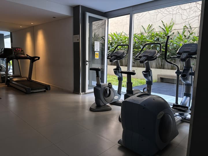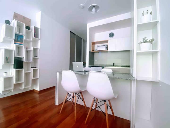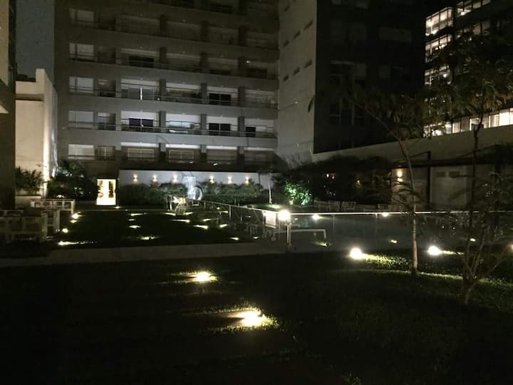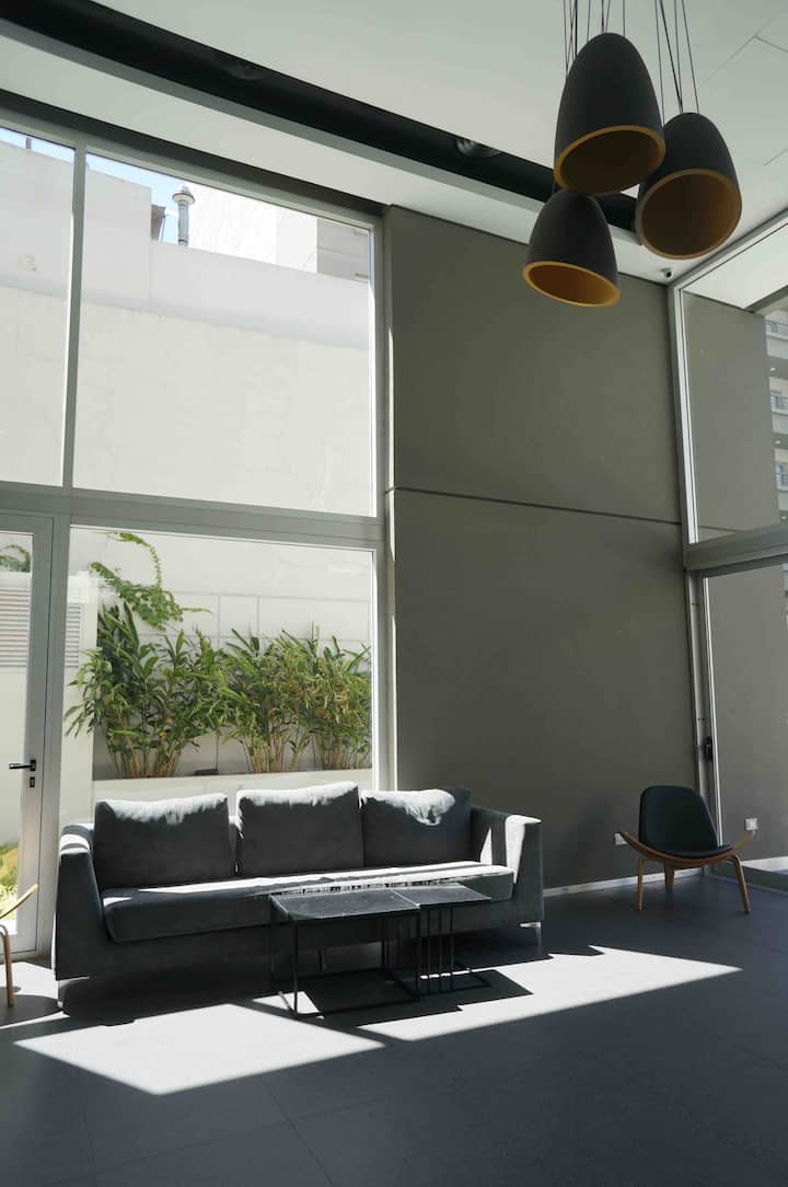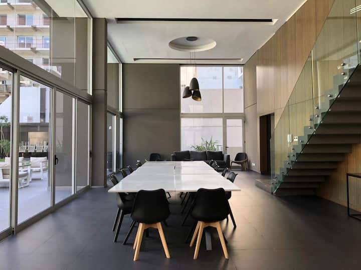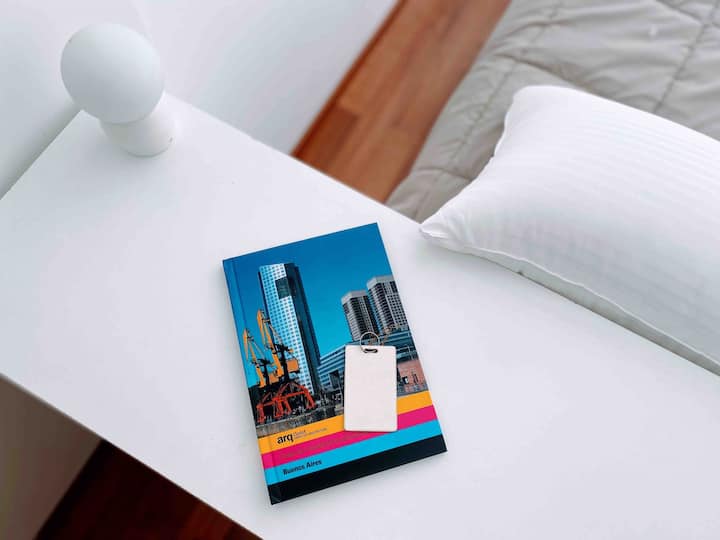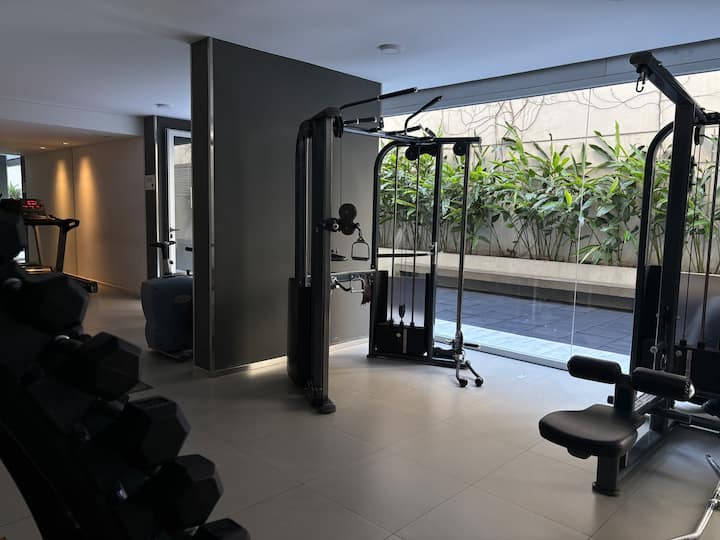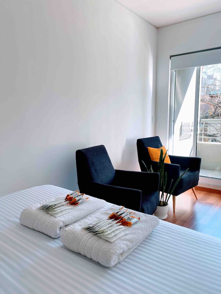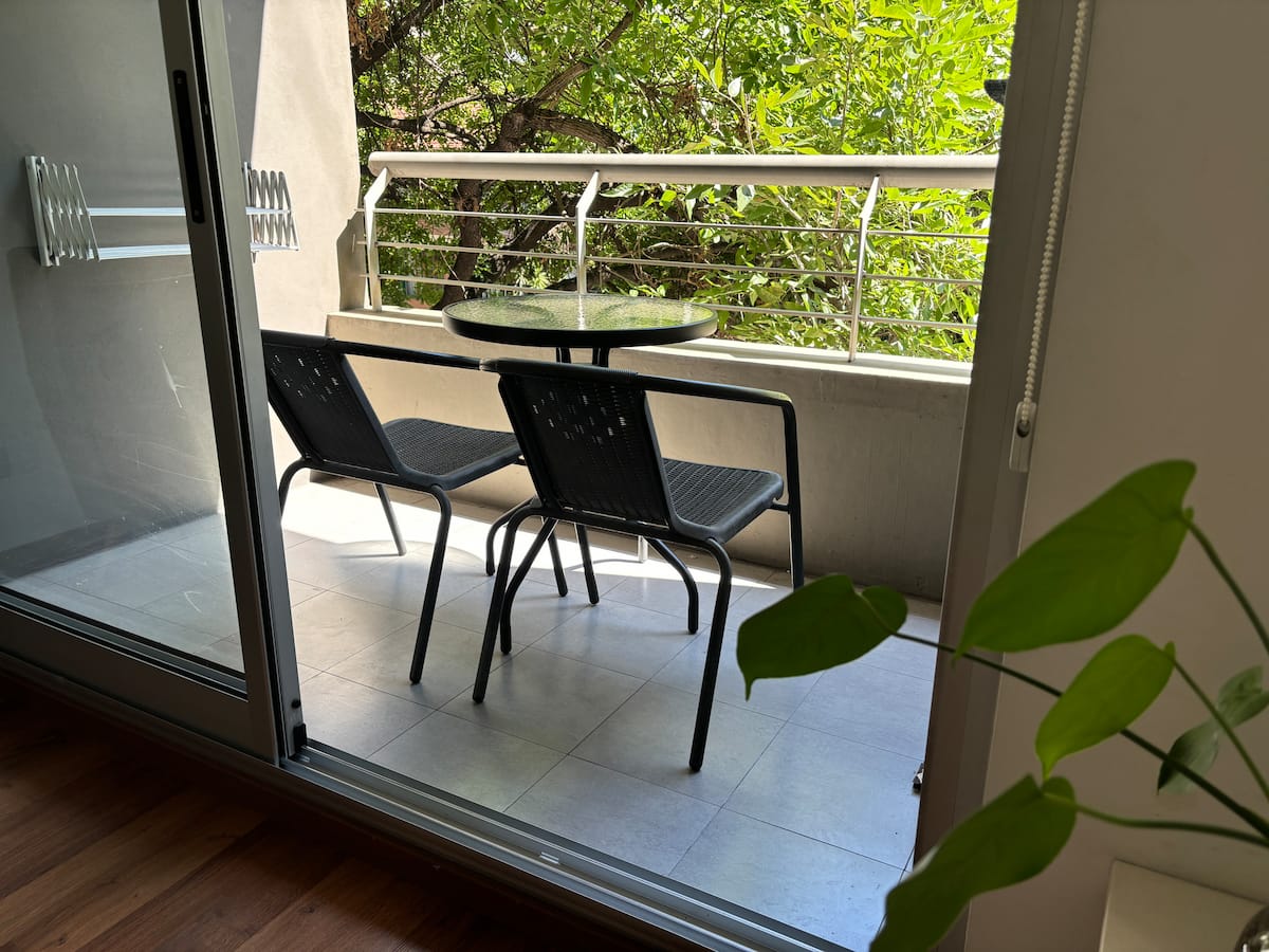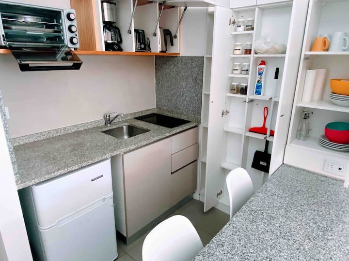 Monoambiente de 34 m² en planta a la calle con balcón. Cuenta con aire acondicionado de sistema smart, piso con doble cama y cama individual pequeña, y cocina con horno eléctrico, anafes, cafetera, tostadora y pava eléctrica. Incluye WiFi con fibra óptica, TV smart de 43", cable TV y equipamiento de sonido. El edificio dispone de seguridad 24 horas, piscina climatizada, jardín, gimnasio y sala de juegos; el SUM se usa para ese servicio según disponibilidad. La piscina climatizada funciona del 1