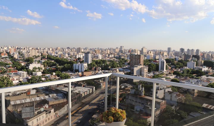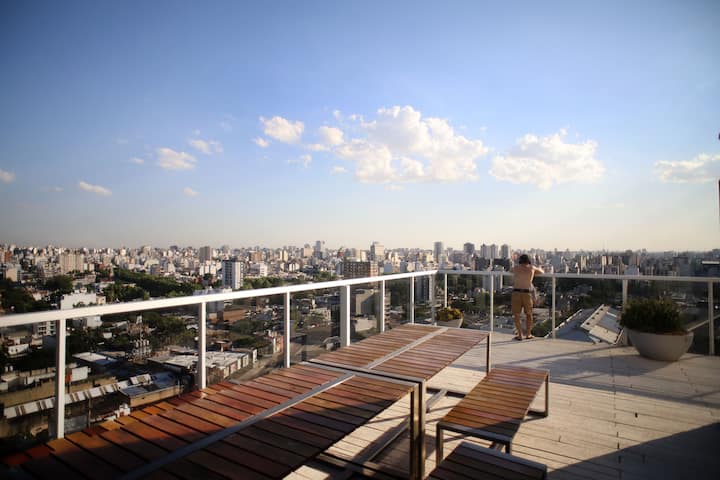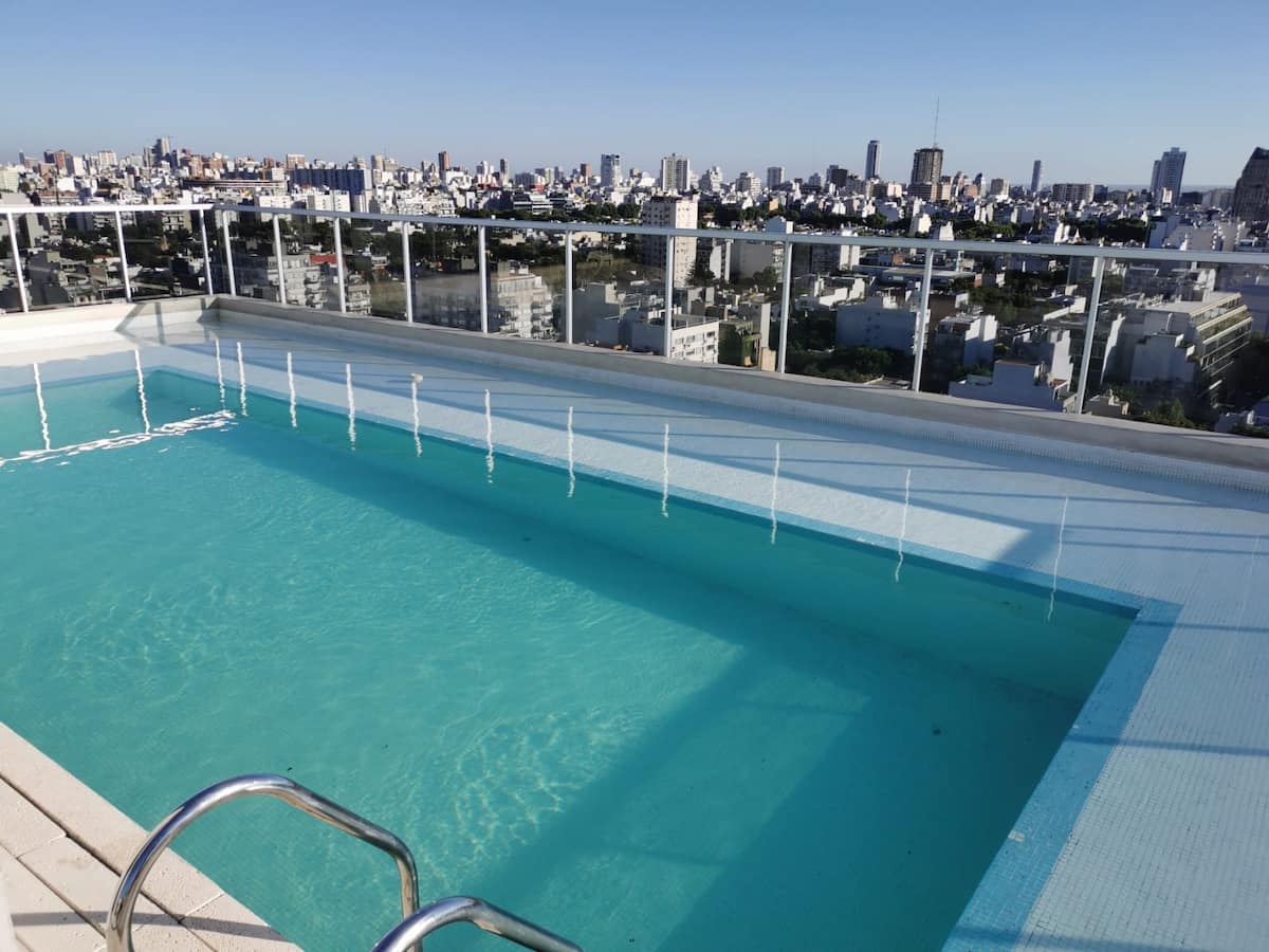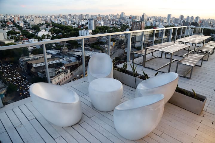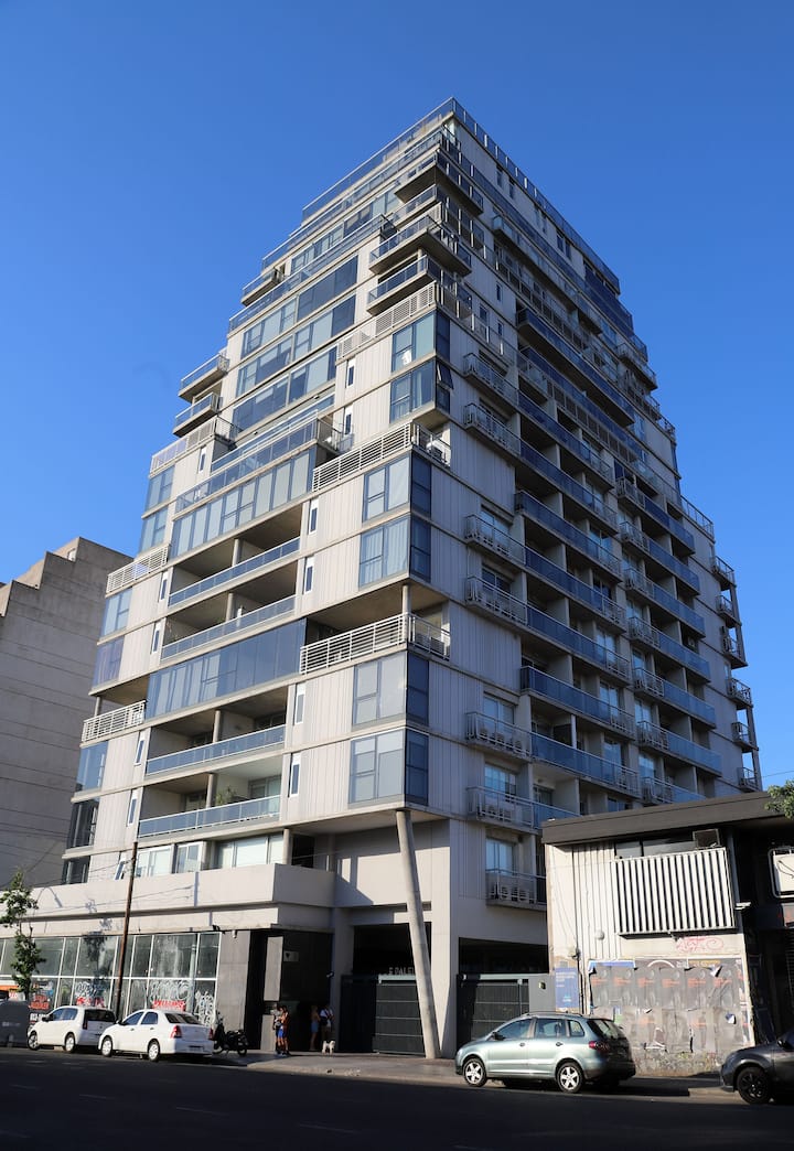 Departamento monoambiente de 1 ambiente de 7º piso en una torre de 18 pisos en Villa Crespo. El edificio cuenta con pileta y solárium en la terraza, y con portería y seguridad 24 horas. Tiene aire acondicionado, internet, TV, Netflix, DVD y teléfono; además, lavandería con funcionamiento 24 horas con fichas.