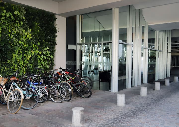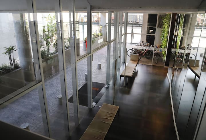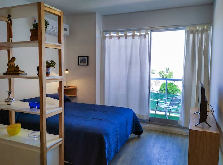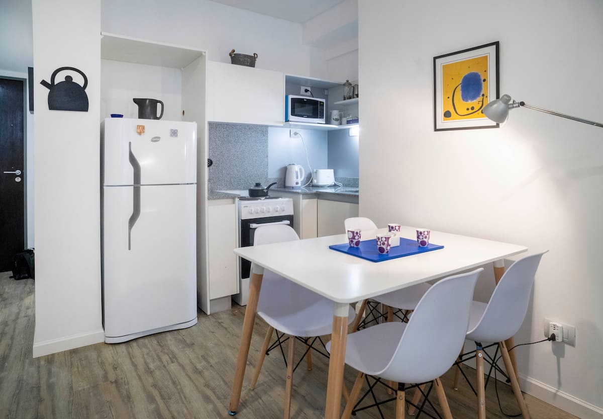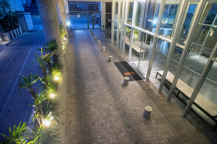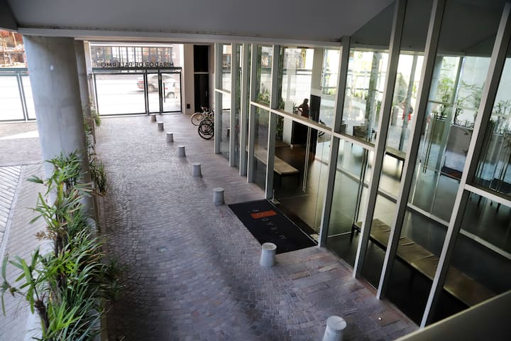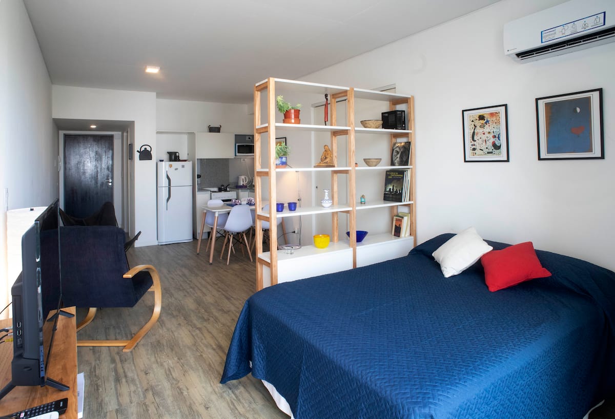 Departamento monoambiente de 1 ambiente de 7º piso en una torre de 18 pisos en Villa Crespo. El edificio cuenta con pileta y solárium en la terraza, y con portería y seguridad 24 horas. Tiene aire acondicionado, internet, TV, Netflix, DVD y teléfono; además, lavandería con funcionamiento 24 horas con fichas.