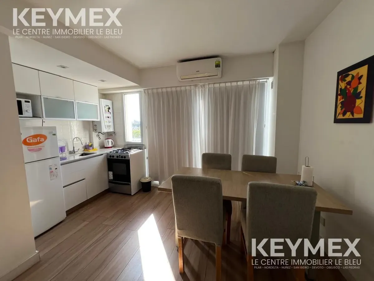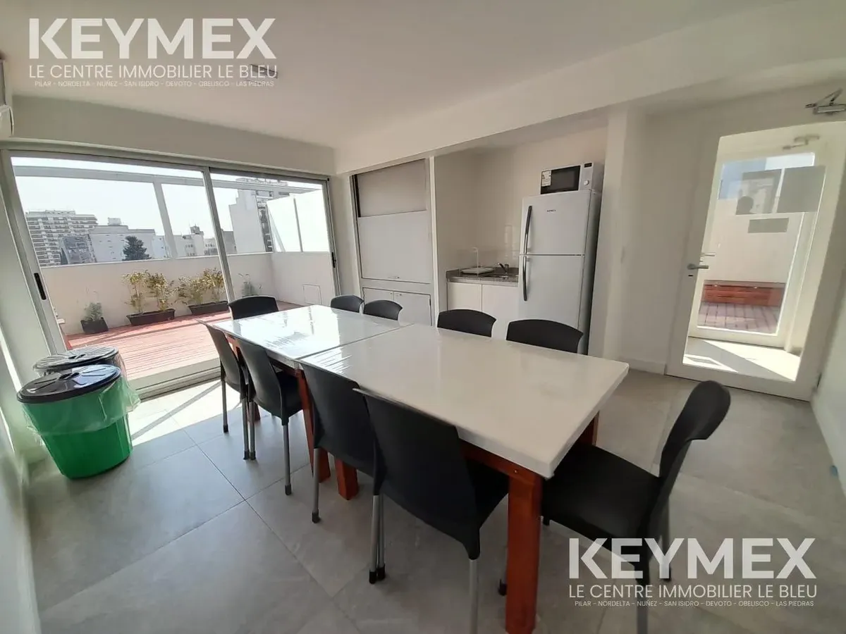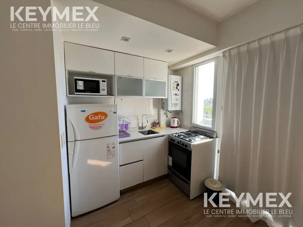 Departamento monoambiente en Villa Crespo con balcón y cochera cubierta. Se alquila con amoblamiento completo: cama de 2 plazas, livings de 2 cuerpos, mesa ratona y mesa de comedor/cocina con sillas; heladera con freezer, microondas, TV plasma de 40 pulgadas y pava eléctrica. Cocina con alacenas y bajo mesada, cocina de 4 hornallas con horno y calefón a botonera (ambos a gas); baño completo con bañera y bidet. El edificio cuenta con SUM con parrilla, hidromasaje para 6 personas con solárium y la