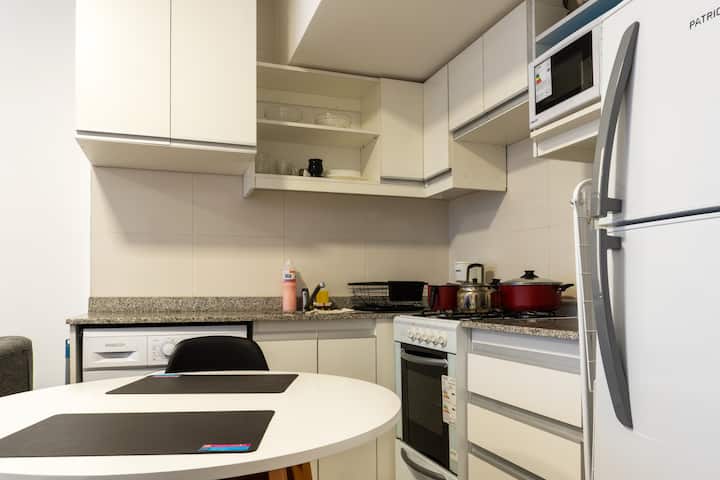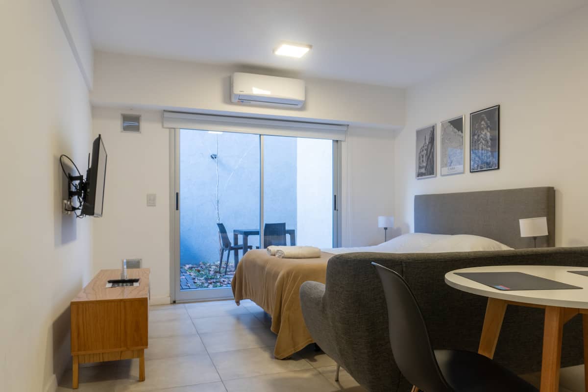 Monoambiente en planta baja de 33 m² con patio de 15 m². Incluye cocina con heladera, horno, microondas y cafetera, además de lavarropas? no, no consta; sí incluye lavavajillas, aire acondicionado y TV. Baño con secador de pelo; cama de 1 plaza? no, cama queen. Tiene Wi‑Fi gratuito, balcón y espacio con parrilla.