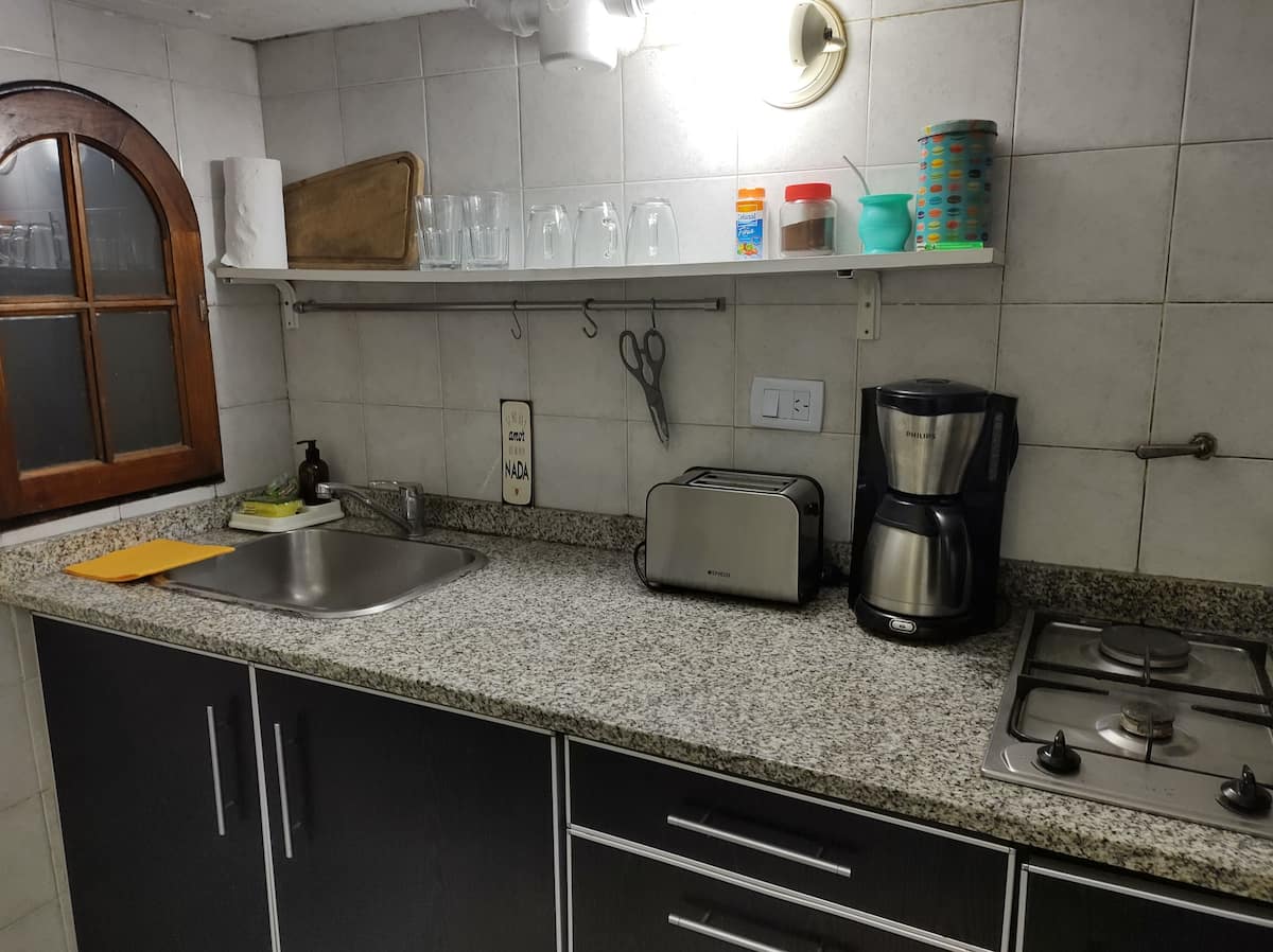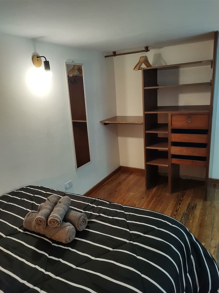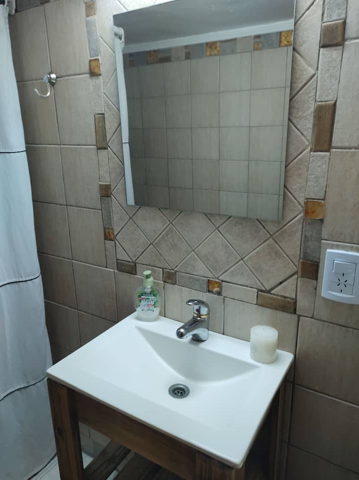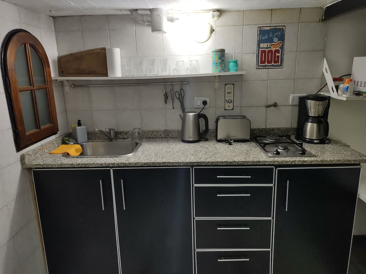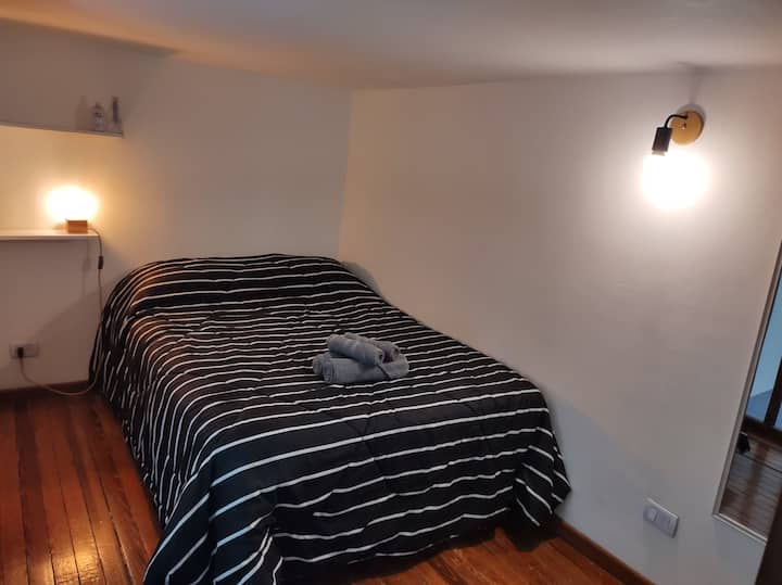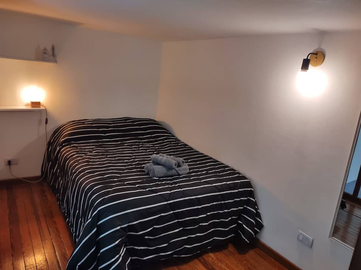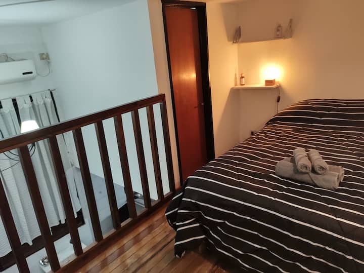 Monoambiente con entrepiso, con cama doble en la parte superior y baño con ducha. En la planta baja hay cocina totalmente equipada y una cama individual. El alojamiento tiene capacidad para 3 personas e incluye sábanas, toallas y vajilla. La escalera al entrepiso es muy empinada, por lo que no es apto para personas con movilidad reducida. En la zona del baño y la cama doble, la altura es de 1,80 m.