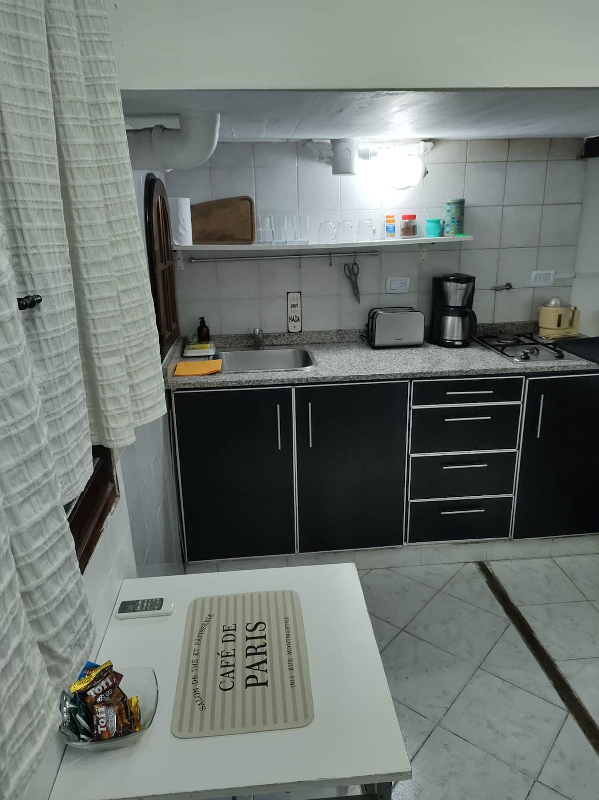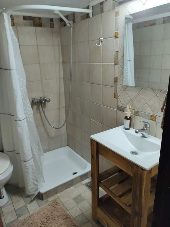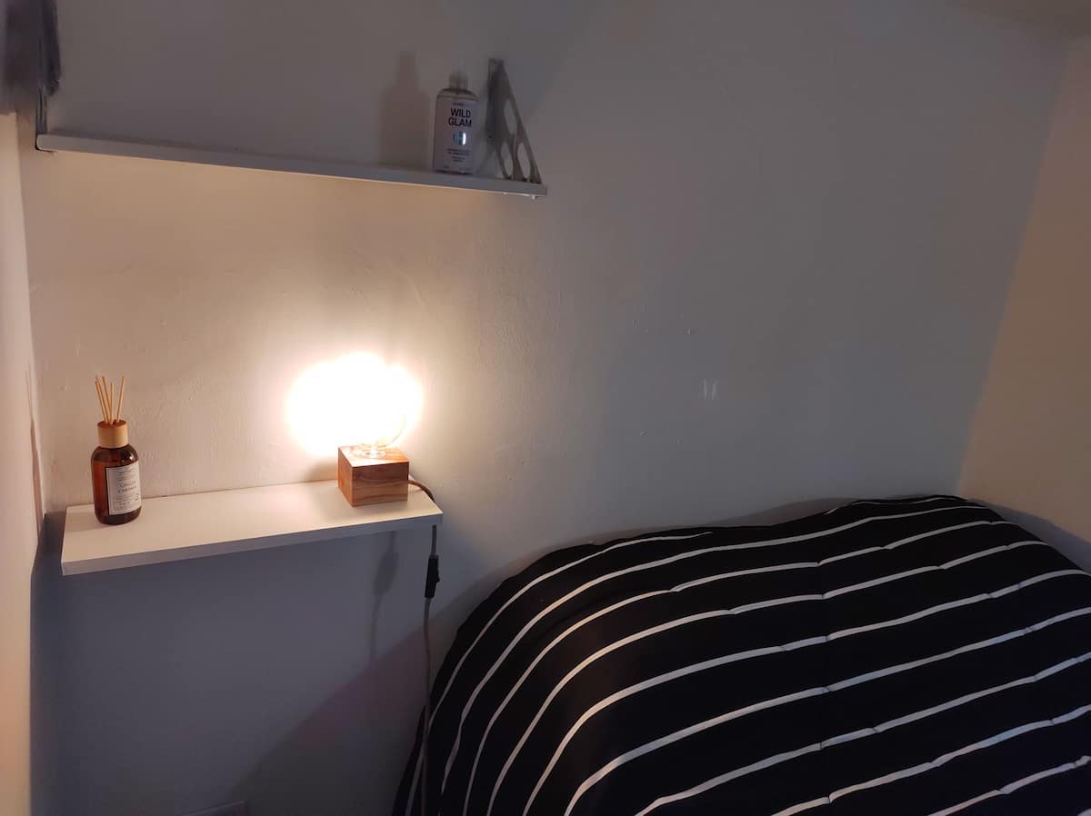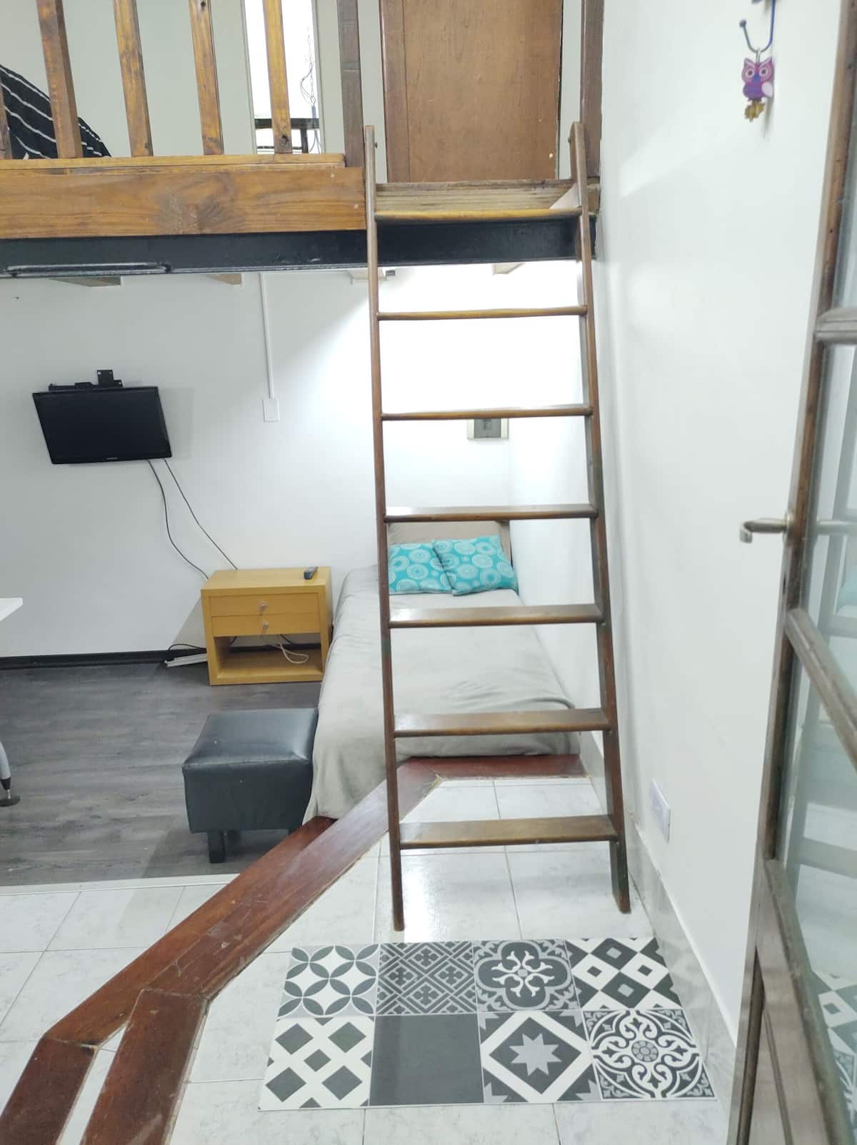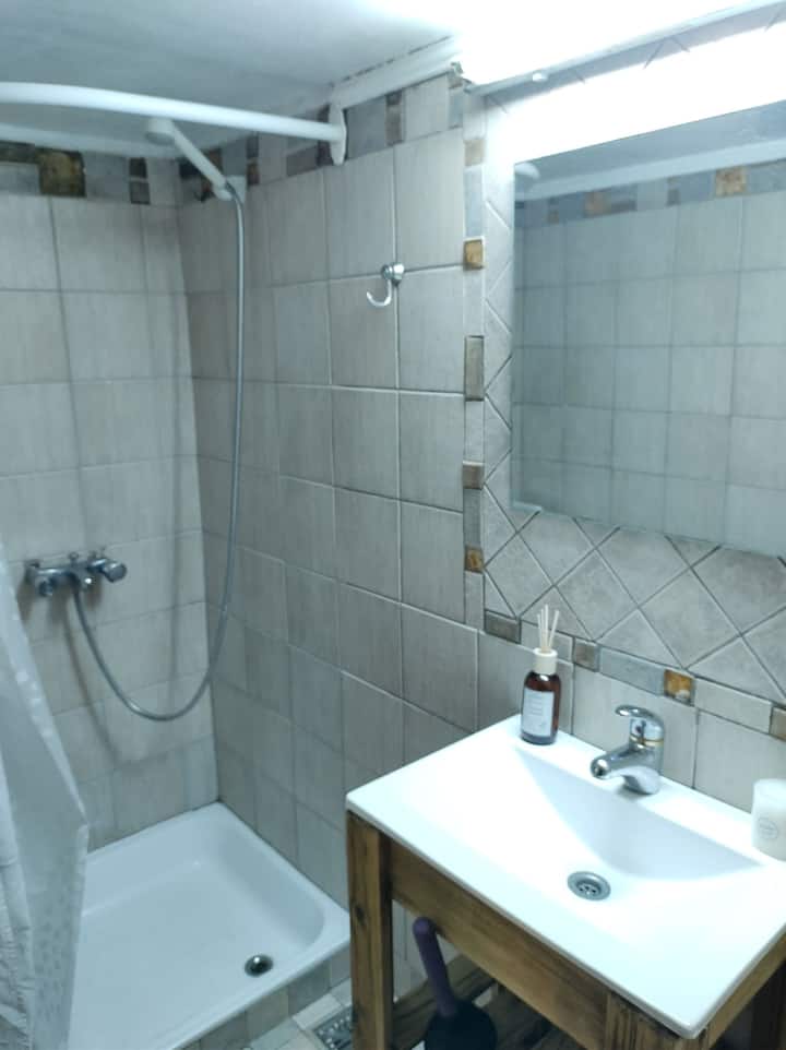 Monoambiente con entrepiso, con cama doble en la parte superior y baño con ducha. En la planta baja hay cocina totalmente equipada y una cama individual. El alojamiento tiene capacidad para 3 personas e incluye sábanas, toallas y vajilla. La escalera al entrepiso es muy empinada, por lo que no es apto para personas con movilidad reducida. En la zona del baño y la cama doble, la altura es de 1,80 m.