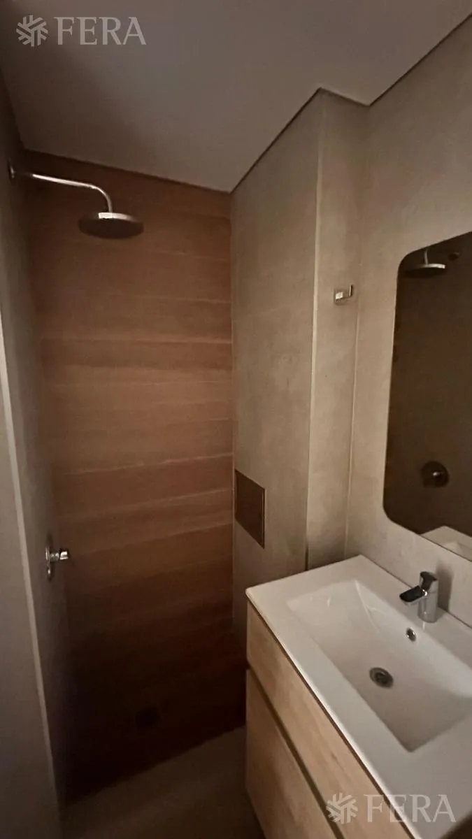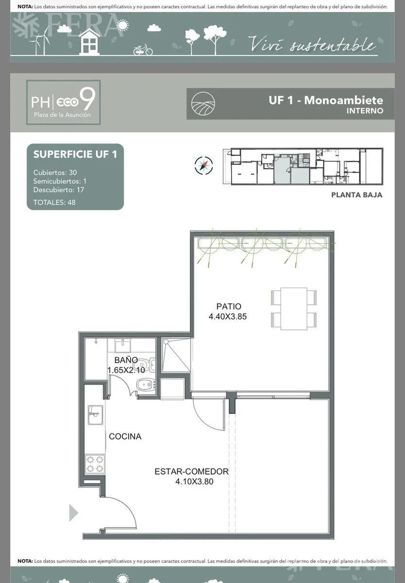 Kitnet (ambiente único) com possibilidade de divisão, pátio e área de churrasco próprios, em imóvel novo (nunca habitado). Tem 30 m² cobertos, 1 m² semicobertos e 17 m² descobertos. Possui anafe/forno, ar-condicionado split frio e calor e espaço para máquina de lavar roupa; bicicletário, portas de acesso com segurança e fechadura eletromagnética. O prédio tem rampa de acesso para pessoas com deficiência.