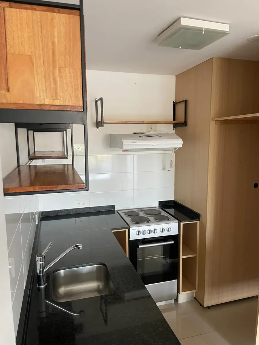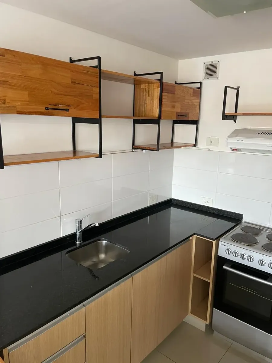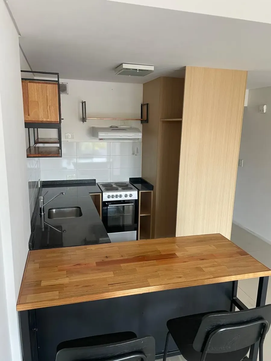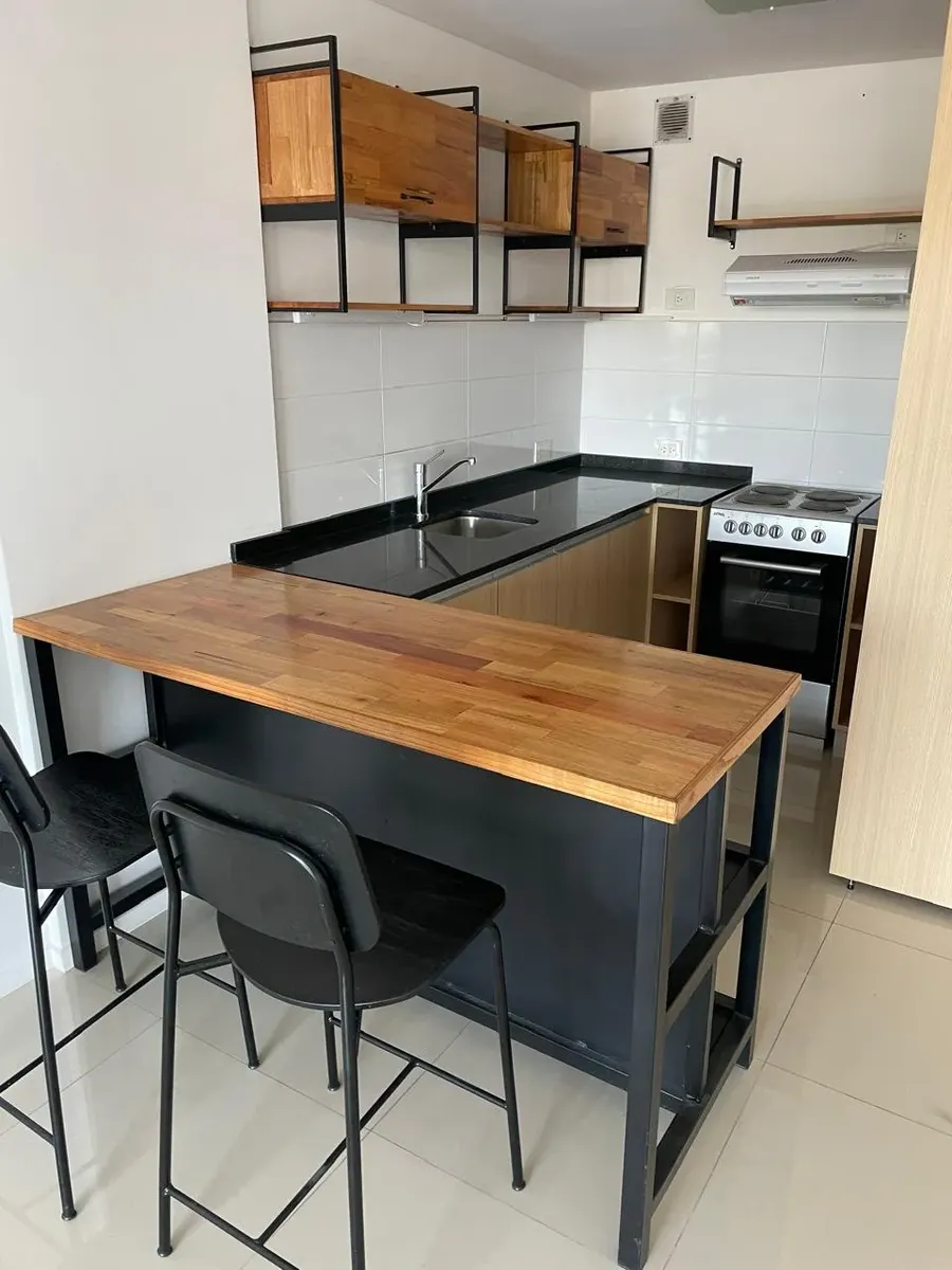 Departamento monoambiente a estrenar de 39 m² en Villa Ortúzar, con balcón propio. La cocina cuenta con barra y equipamiento a medida, con sillas y muebles de hierro y madera. El edificio dispone de SUM, baño, parrilla y balcón común.