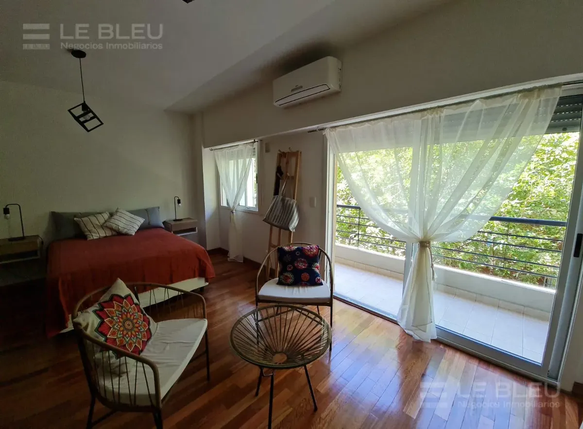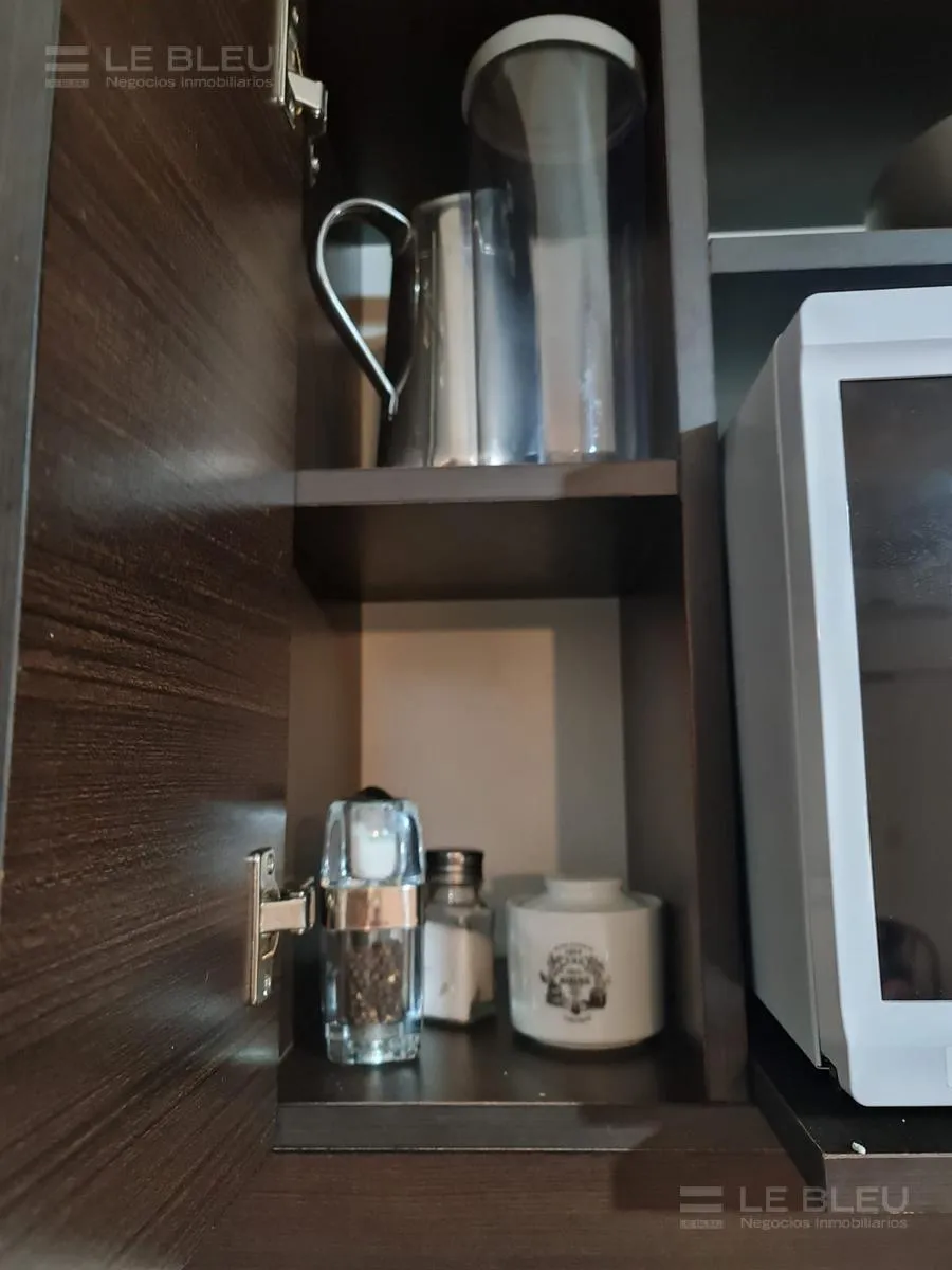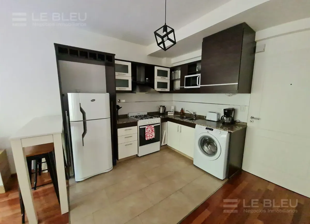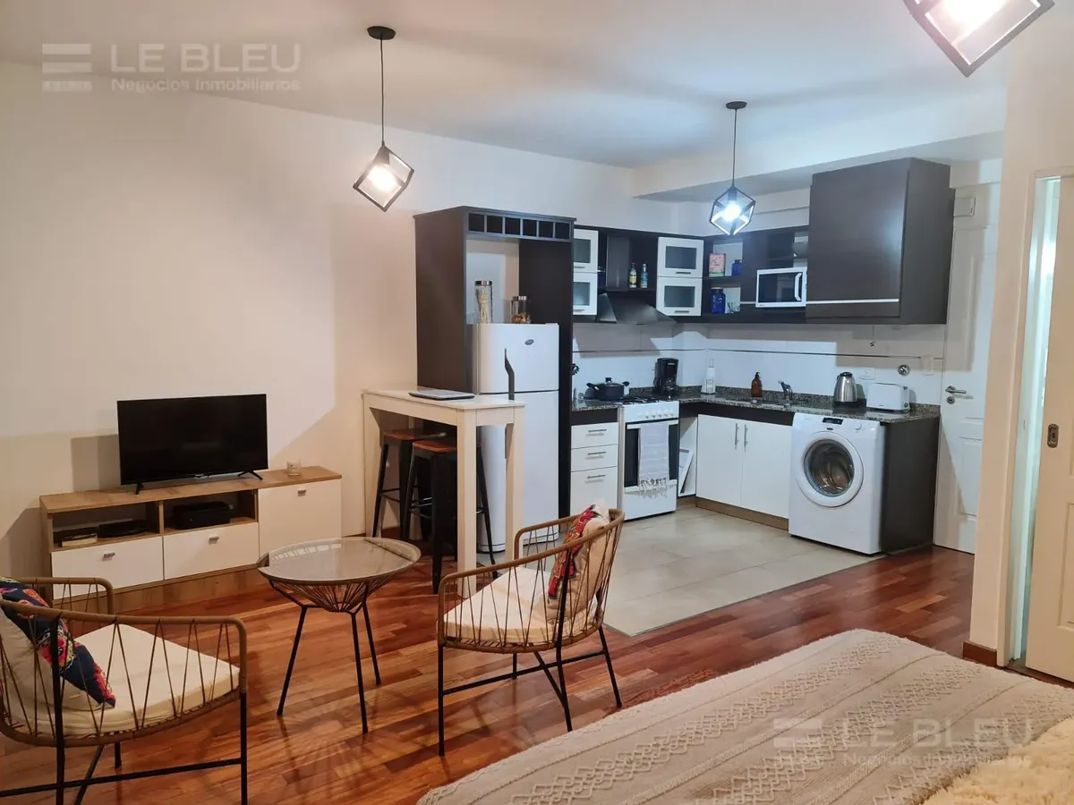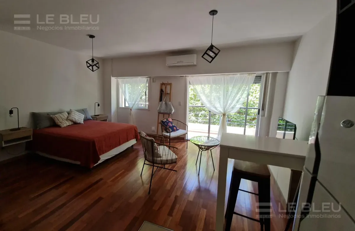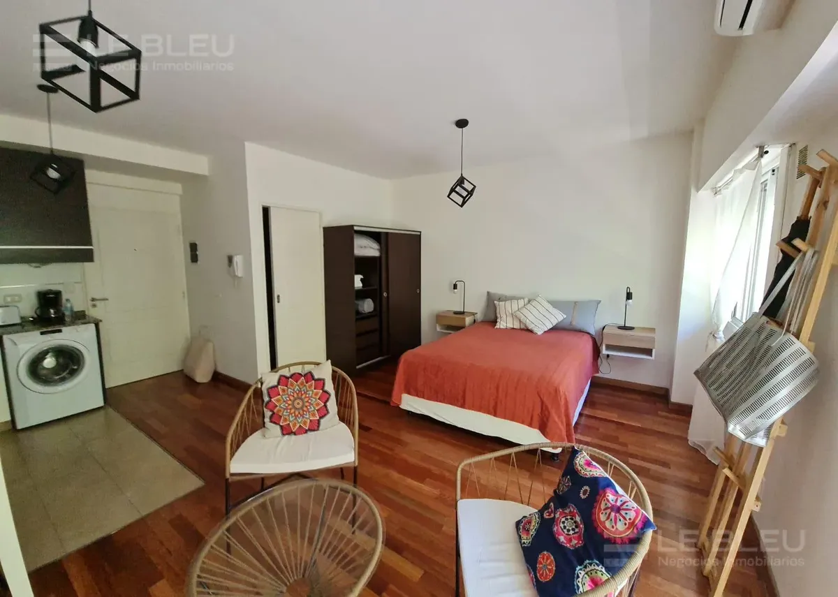 Departamento monoambiente de 1 baño, al frente, con balcón. Está totalmente amoblado y equipado con sommier, placard, juego de living y TV, además de microondas, lavarropas, cafetera, campana y barra desayunadora. Incluye aire acondicionado split frío-calor y agua caliente provista por termotanque. El edificio tiene 8 años de antigüedad y cuenta con SUM y parrilla, con servicios individuales.
